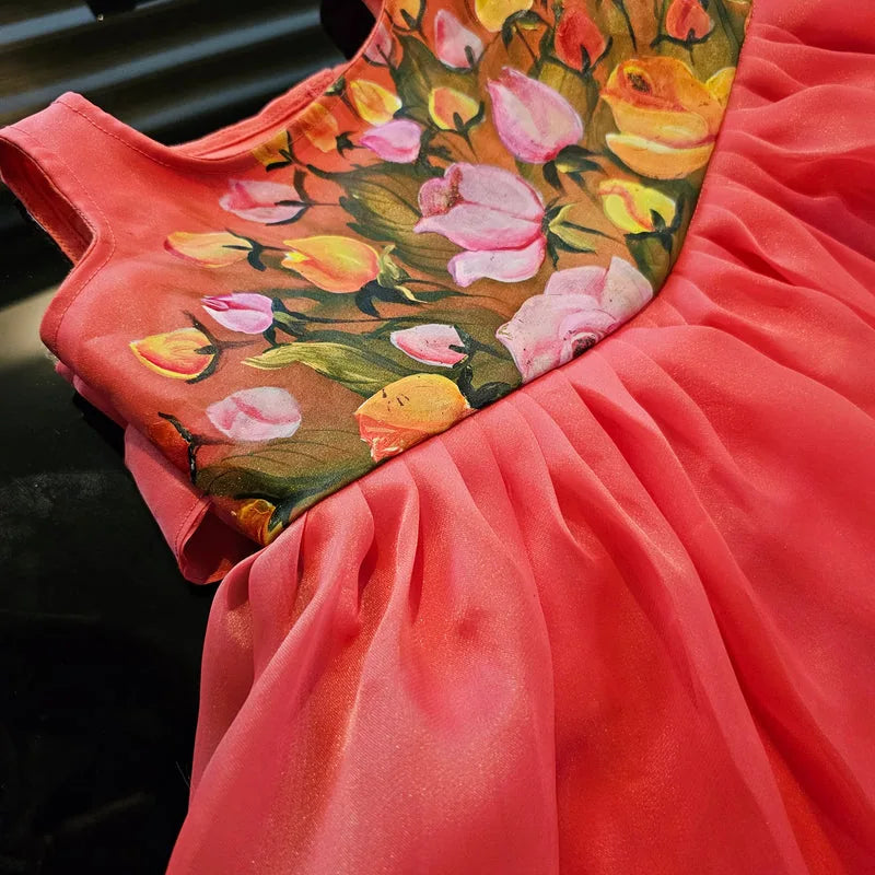Ideal for birthday parties or any festive occasion, this reddish-pink Organza frock adds a touch of charm and elegance to your little one's attire. With its vibrant hand-painted floral design and comfortable cotton lining, it's perfect for celebrating special moments in style.