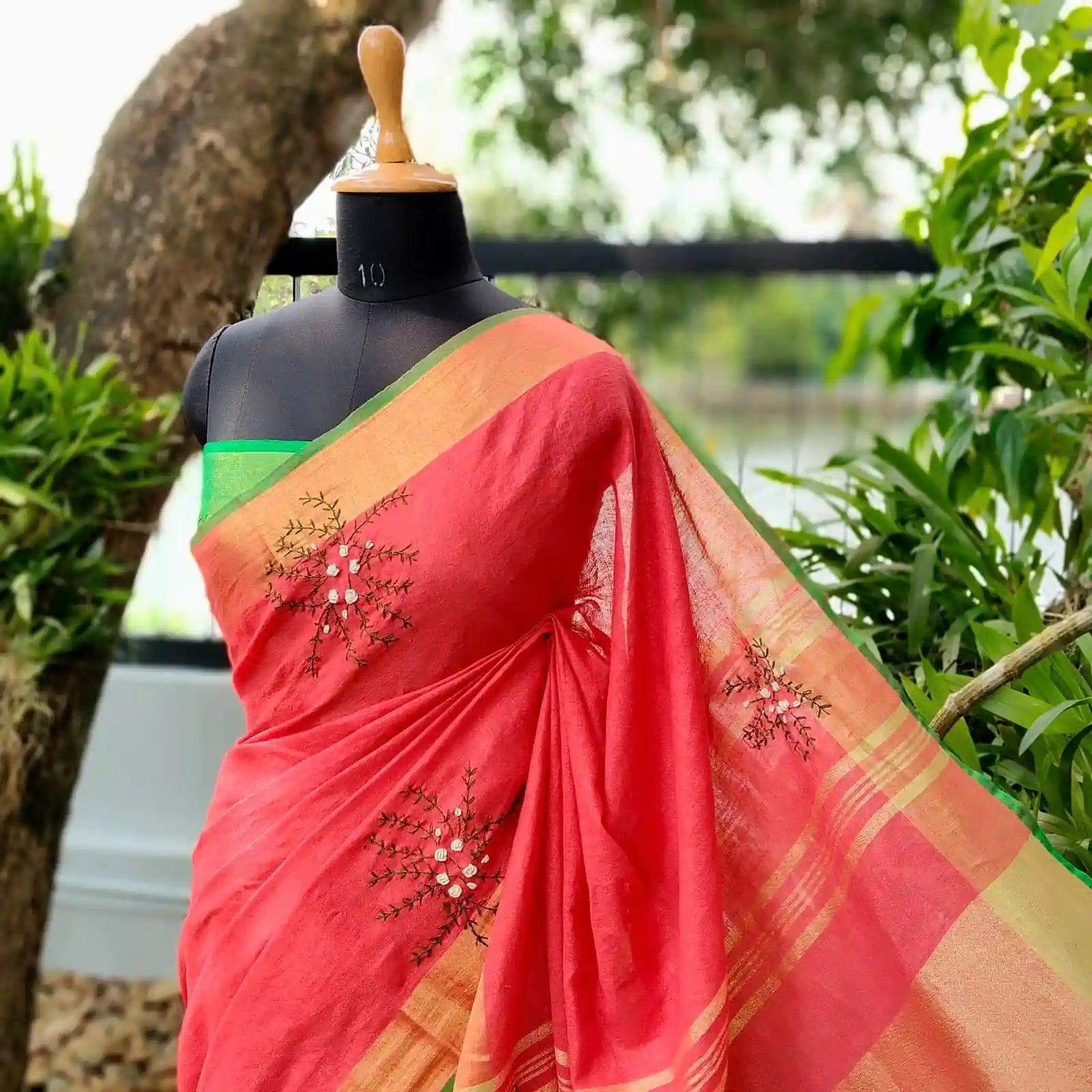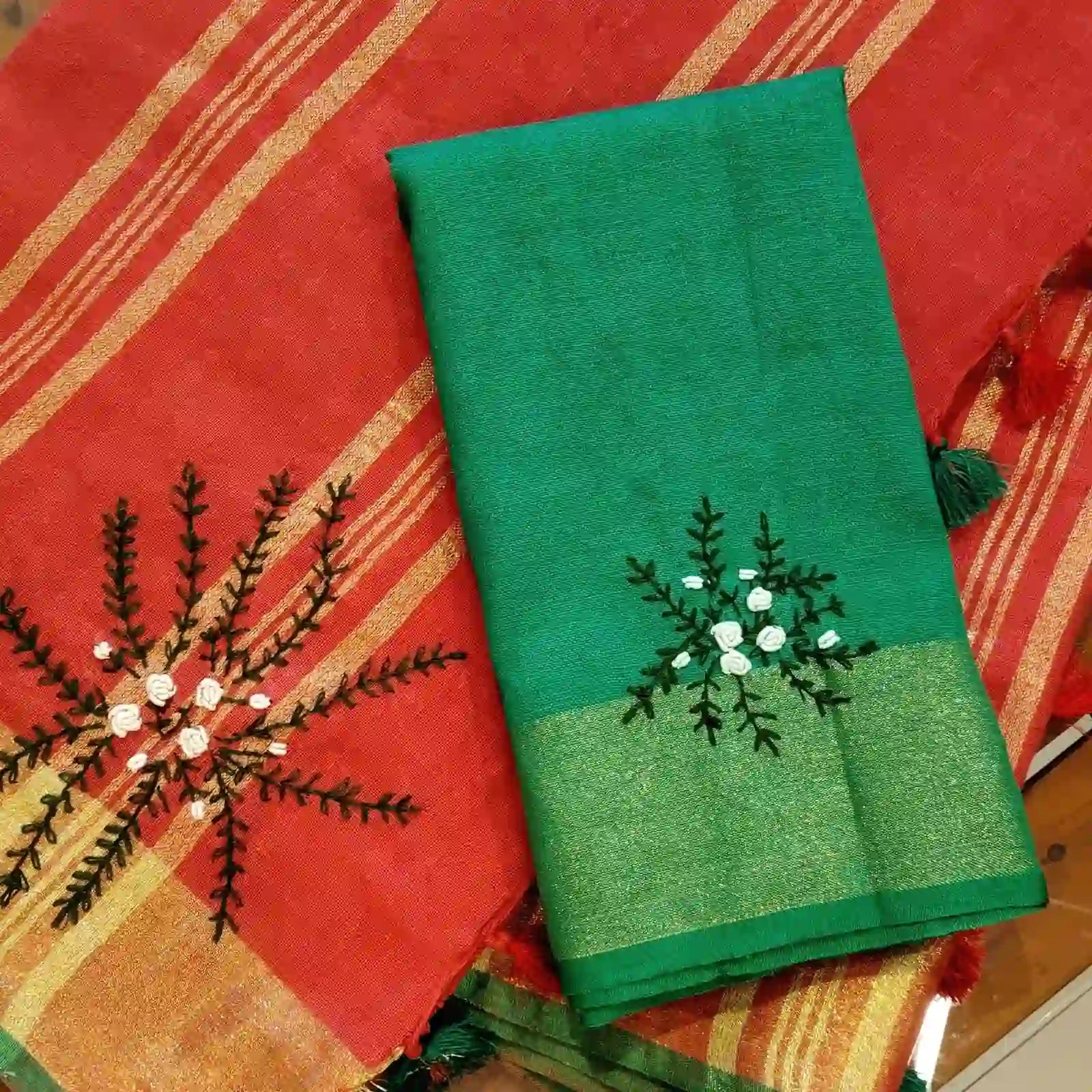 Graceful linen saree in red and green hues, adorned with pretty hand embroidery that lends it a classy elegance.