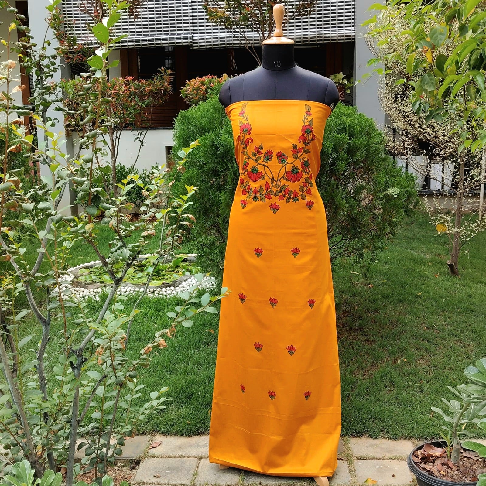 Hand-painted kurti fabric in pure cotton, with artwork on the front, back, and sleeves — perfect for summer wear .