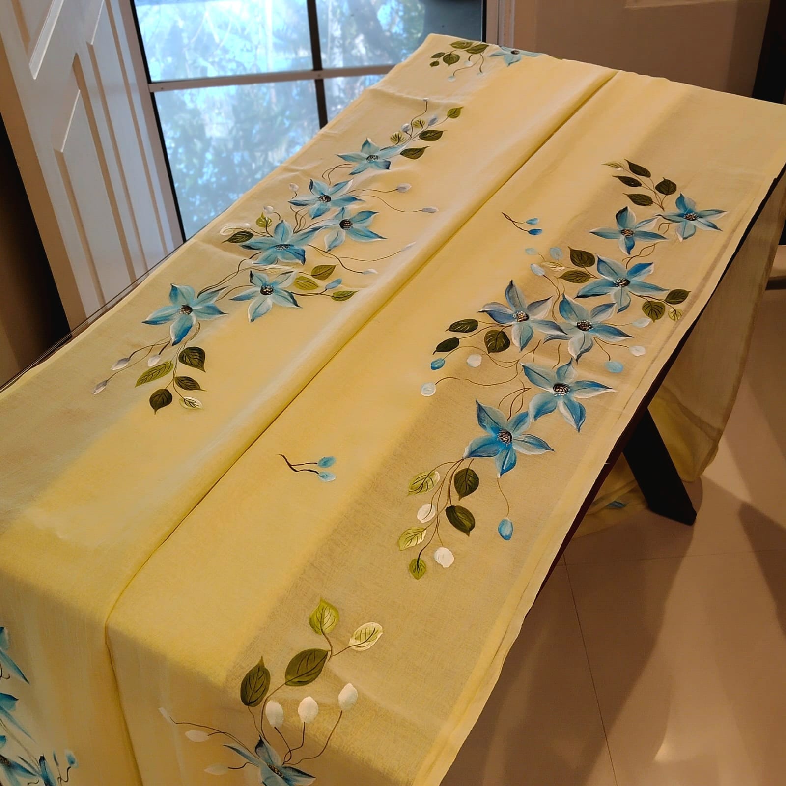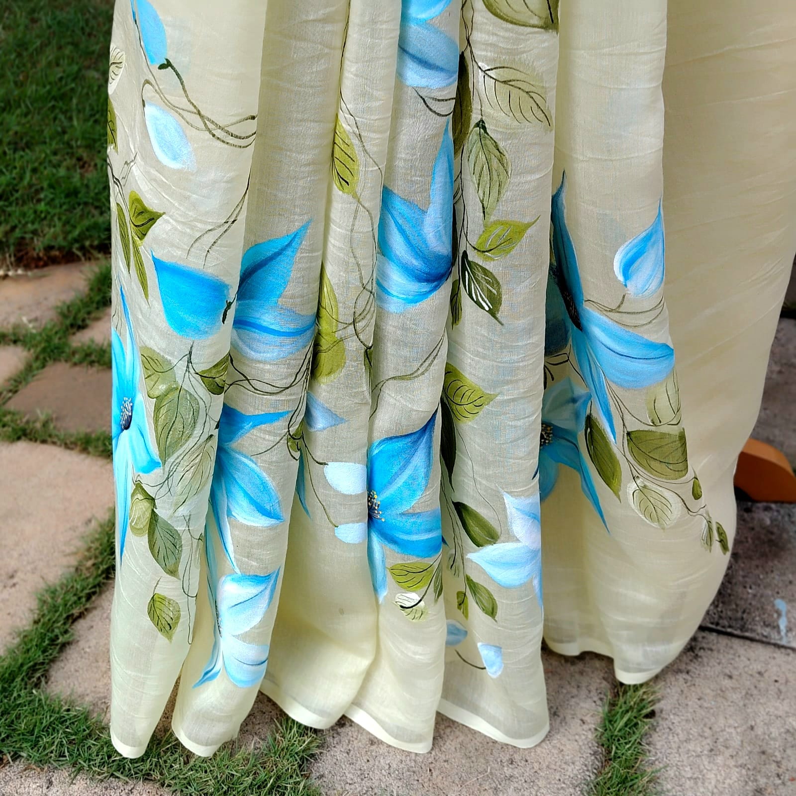 This gorgeous pastel yellow Mal Chanderi saree is beautifully hand-painted with delicate wildflowers in soothing blue tones. It comes with a matching 1 mtr running blouse featuring hand-painted sleeves, adding an elegant finishing touch