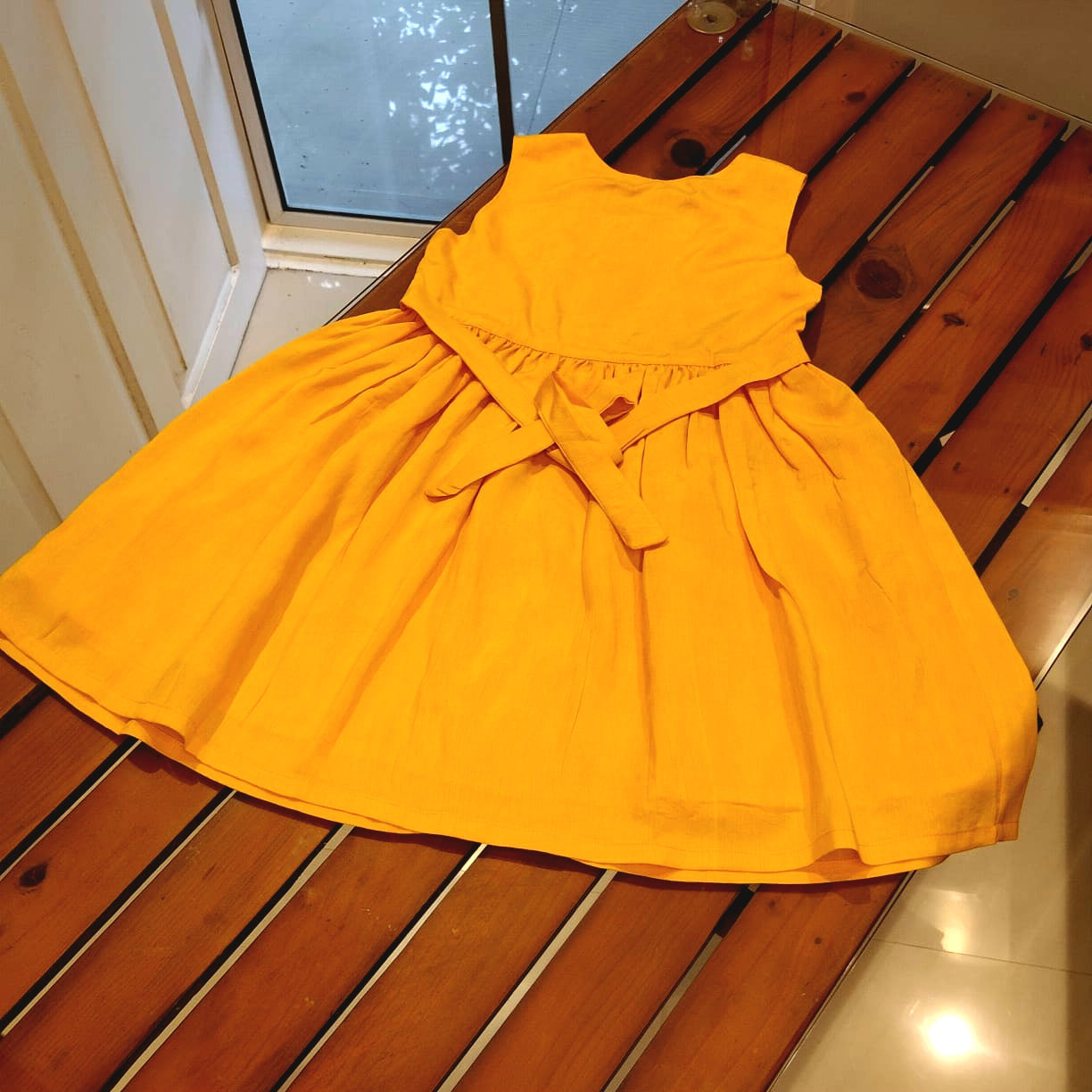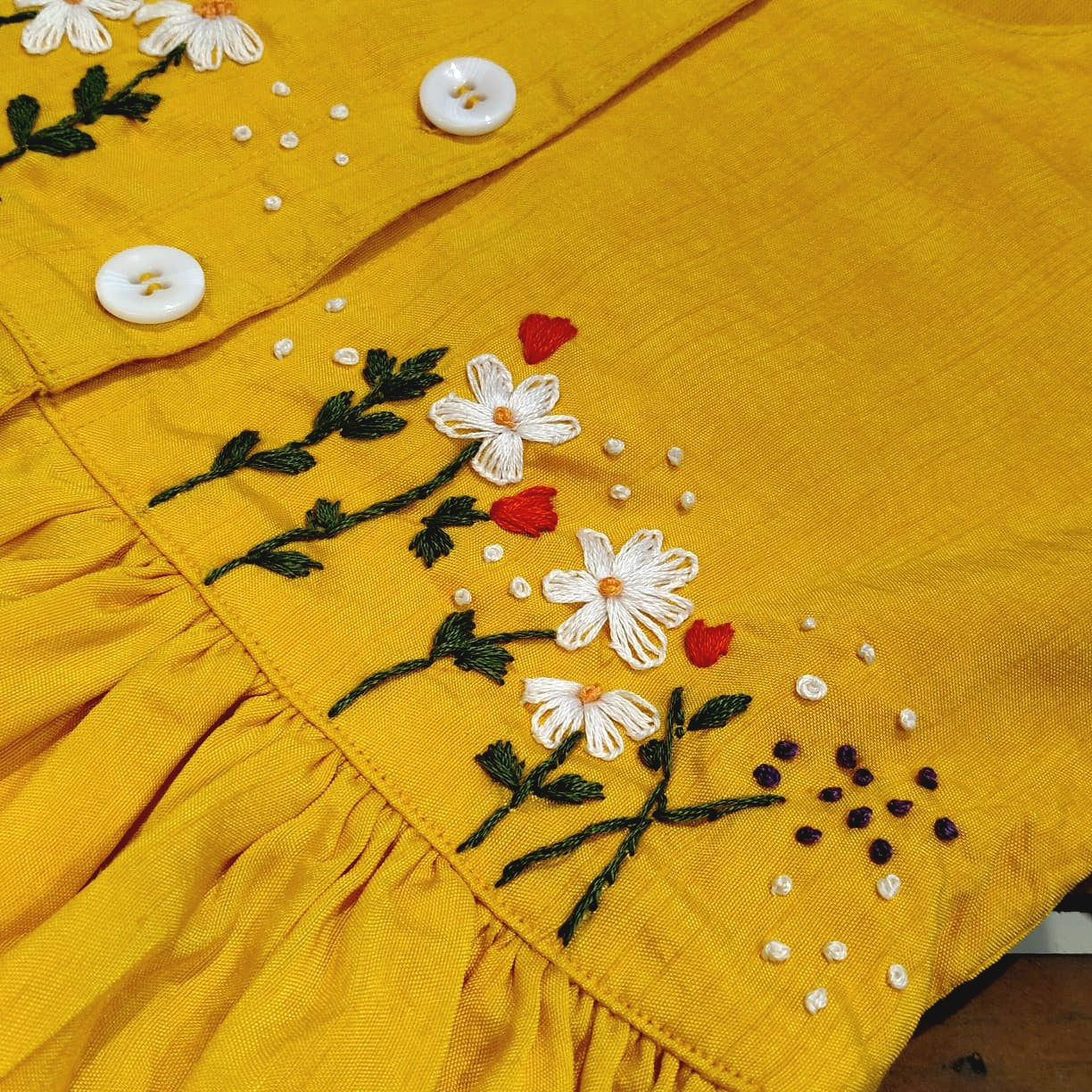 Hand-embroidered yellow Raw Silk frock, crafted for your little one with a soft cotton lining for added comfort.