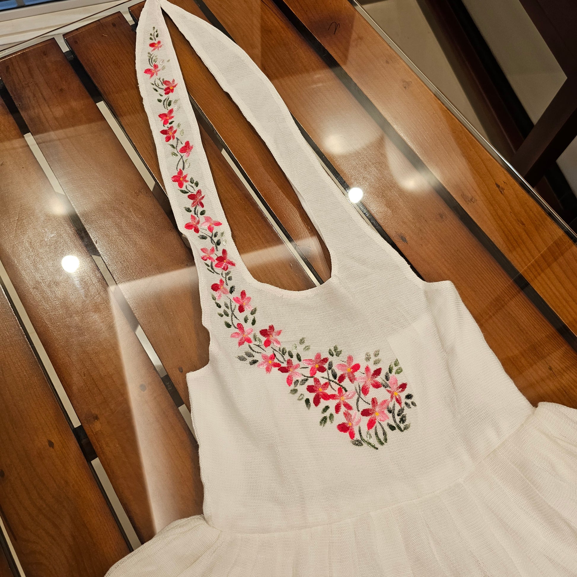 This cute baby frock is hand-painted with pretty flowers. It is made from soft net kota fabric with a pure cotton lining, ensuring comfort for your little one.