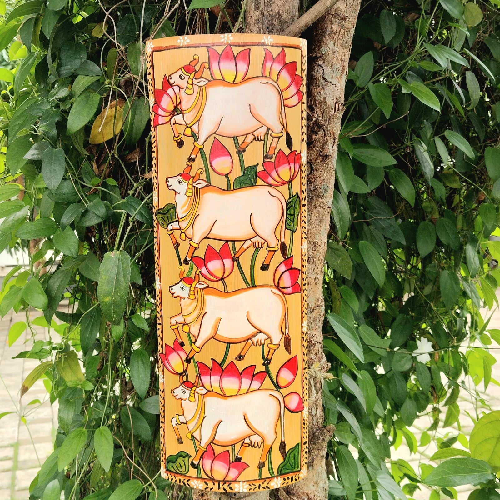 Pichwai-style painting on natural bamboo, handpicked from the lush forests of Kerala and carefully treated to create a smooth, paint-ready surface. A unique piece of art, perfect to add a touch of tradition to your home—or to gift someone special with something truly one-of-a-kind. 🌿✨
