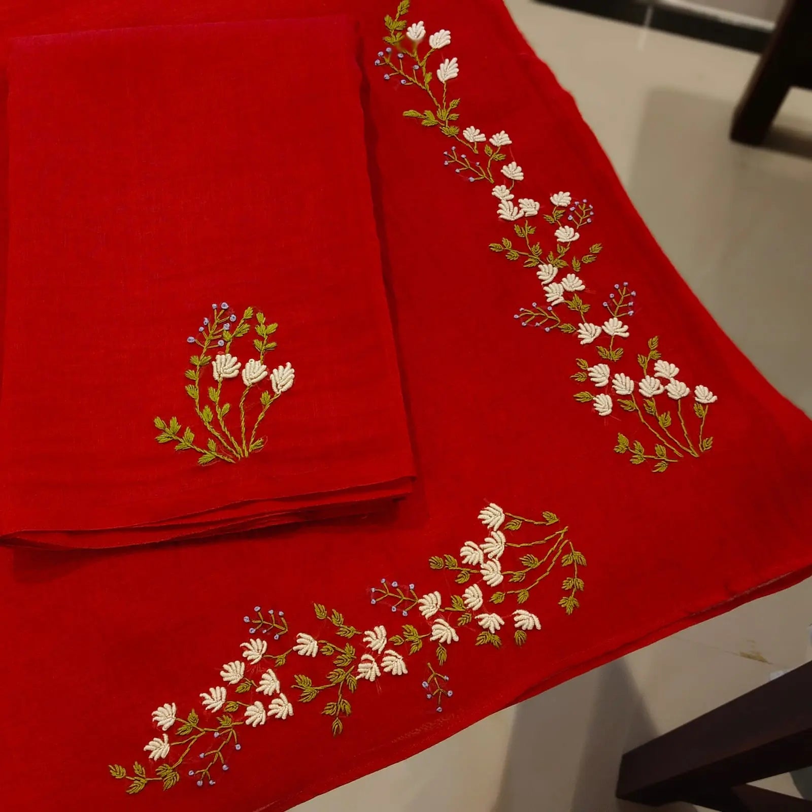 A pretty hand-embroidered red Mal Chanderi saree with exquisite work along the borders.