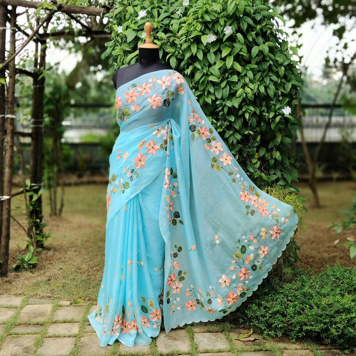 Dreamy Blue Silk Organza Saree With Plumeria Blossoms Painted For A Timeless Look
