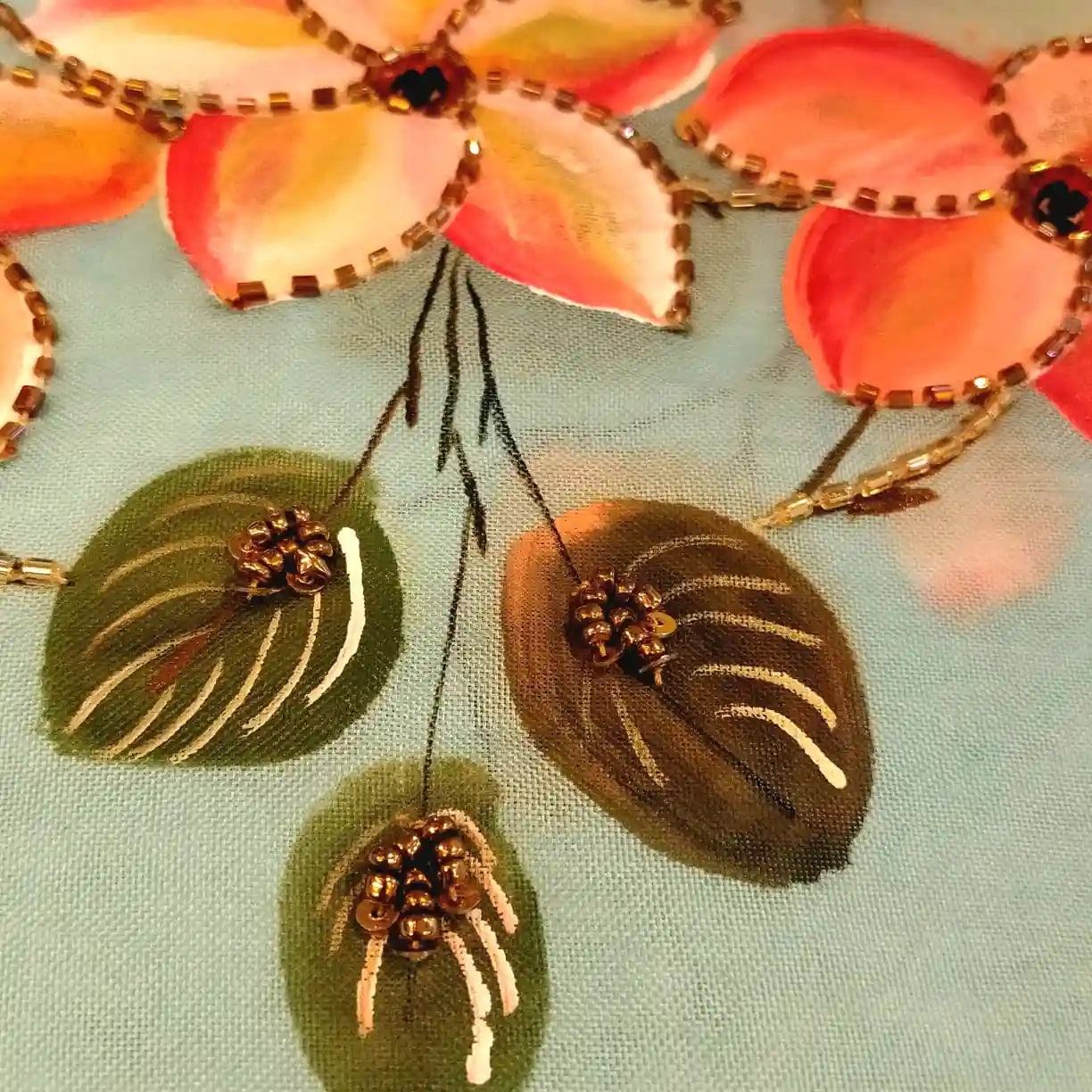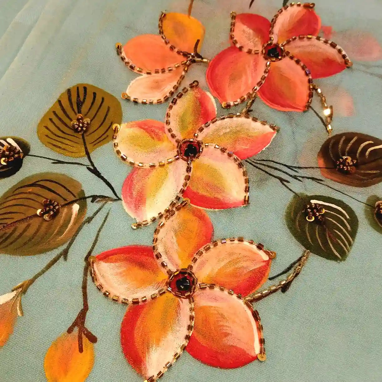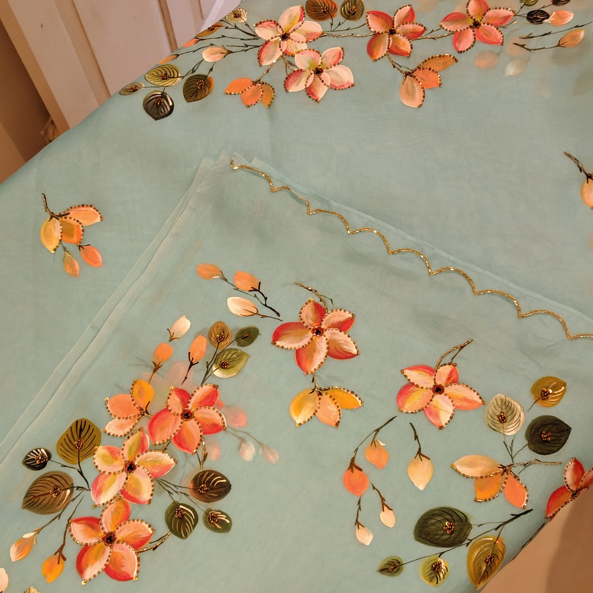 Gorgeous blue silk organza saree hand-painted with delicate plumeria flowers all over. Accentuated with antique-style beadwork for added elegance. Comes with a 1 metre blouse piece featuring hand-painted sleeves