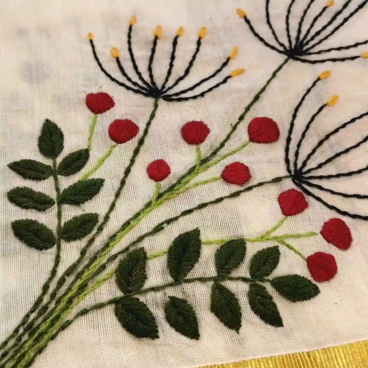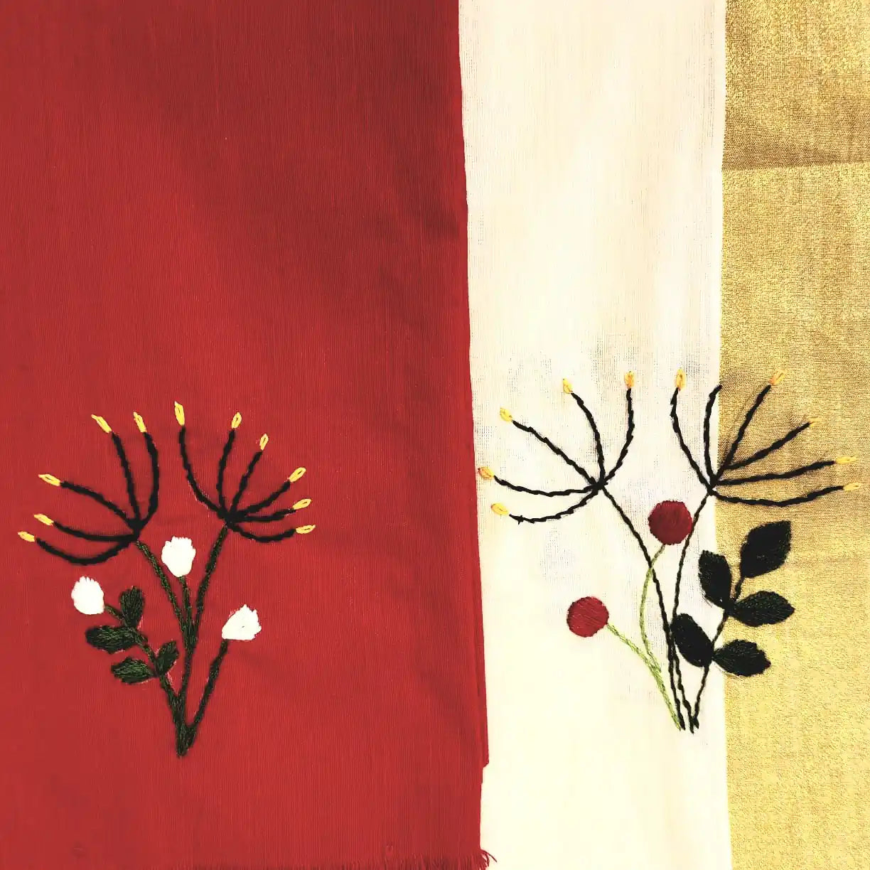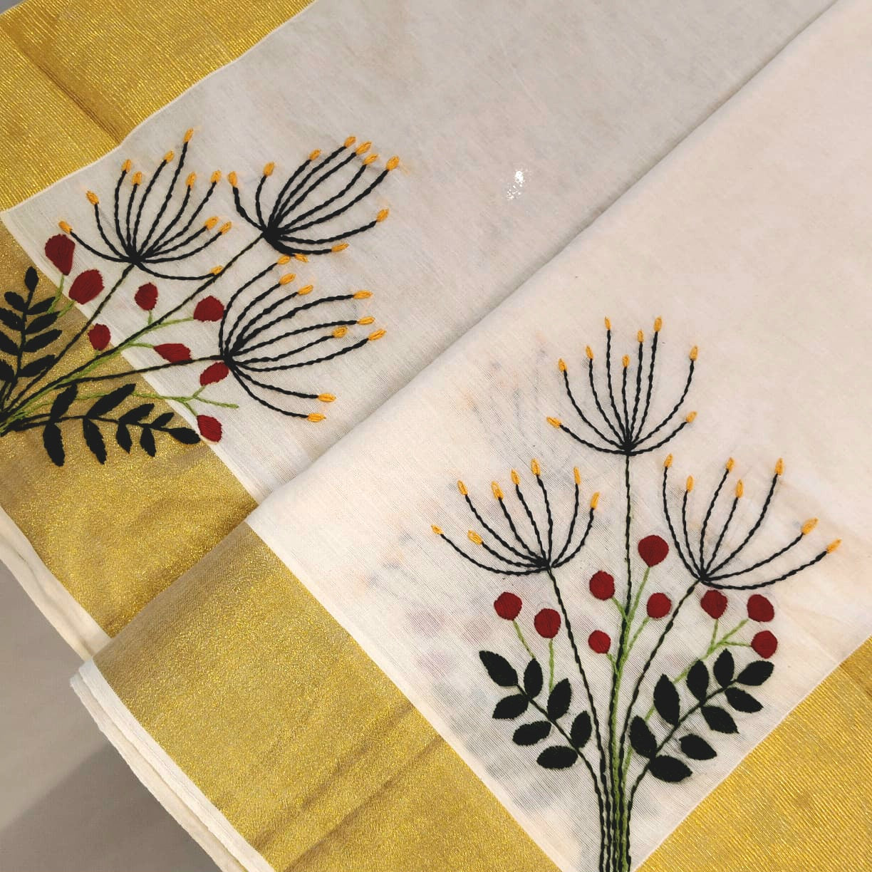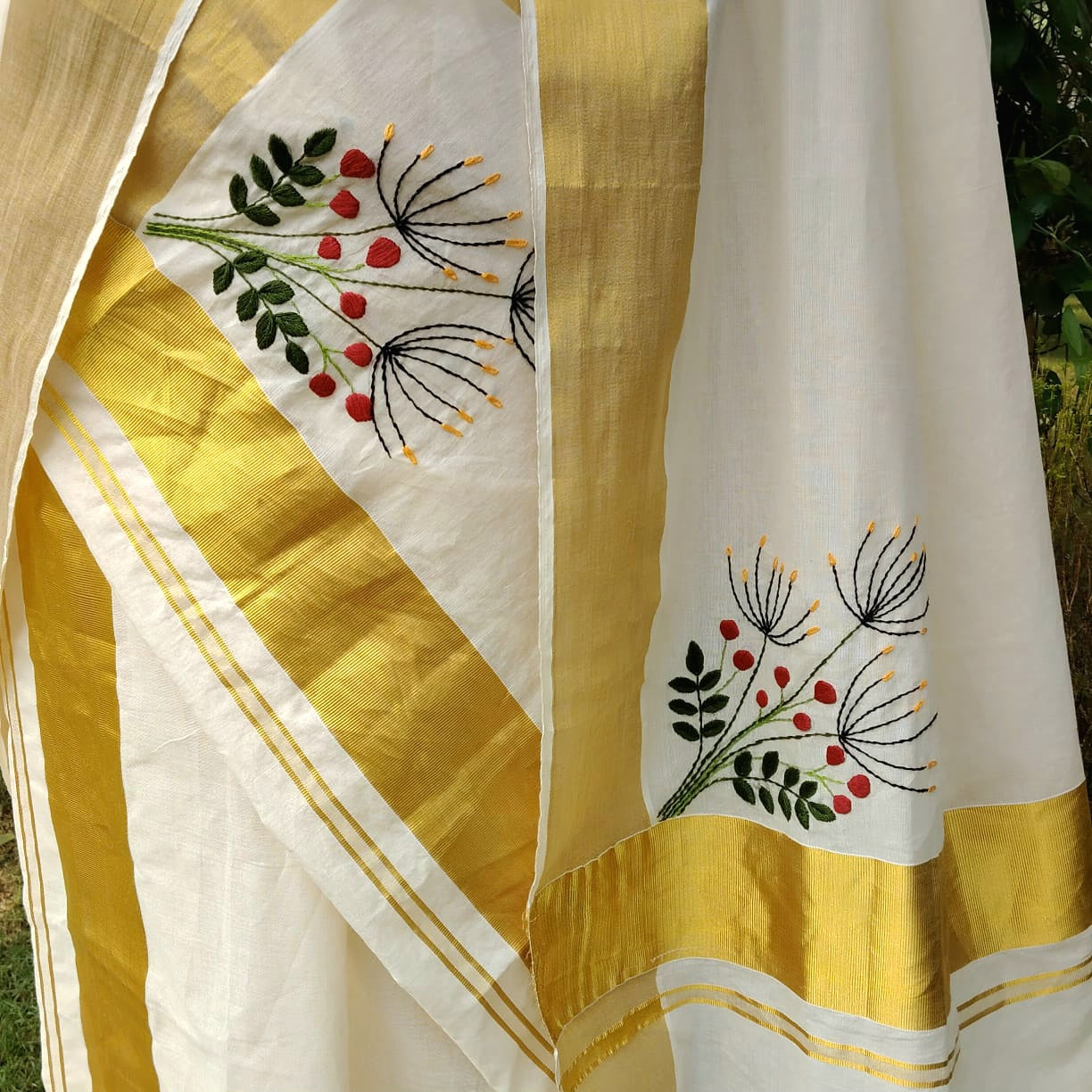 Traditional hand-embroidered Kerala set mundu featuring floral motifs along the border, paired with a contrasting deep red blouse adorned with embroidery on the sleeves