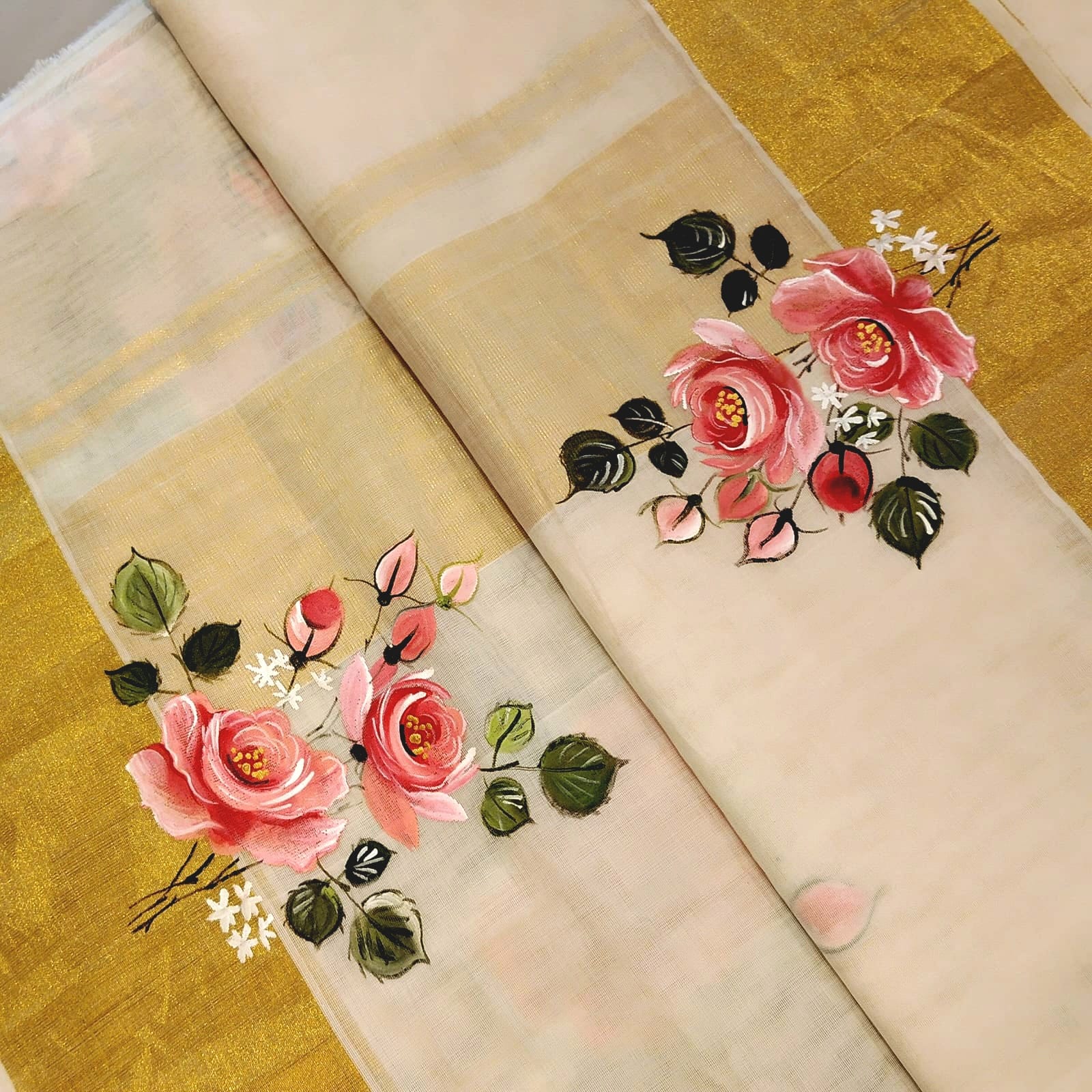 A gorgeous hand-painted Kerala Kasavu saree, beautifully adorned with wild roses painted all over. It comes with a matching running blouse featuring hand-painted sleeves.