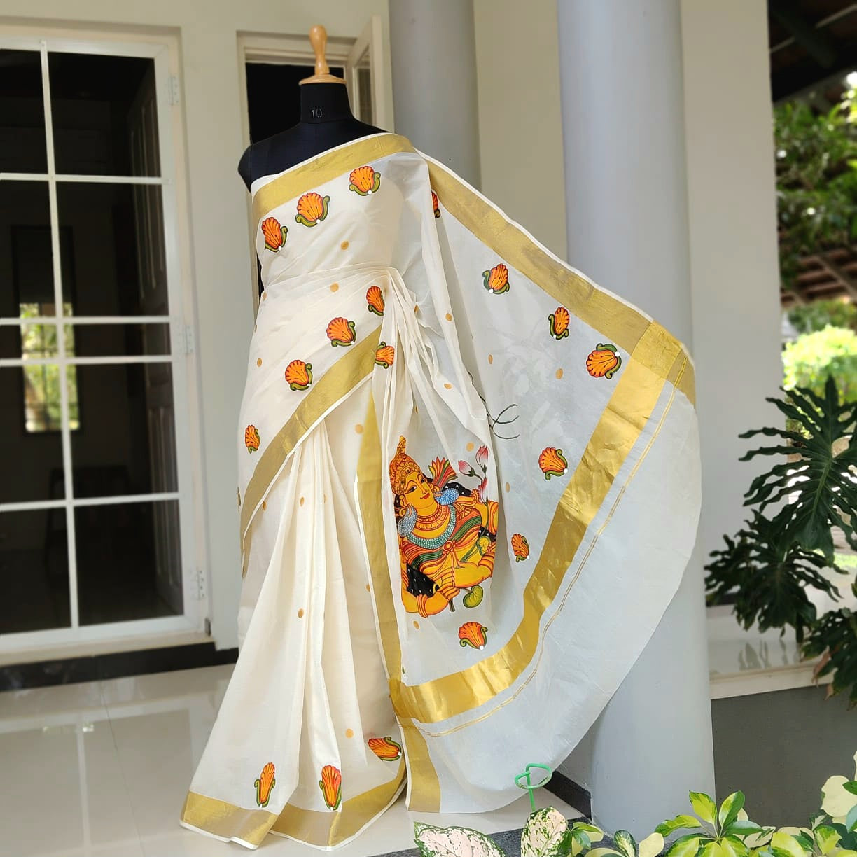 Elegant Kerala Mural Saree, Hand-Painted With Tradition