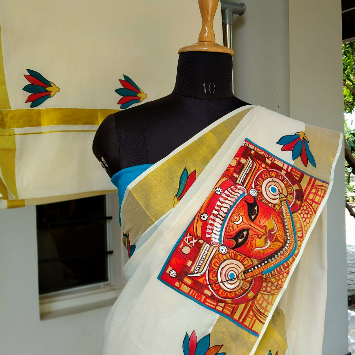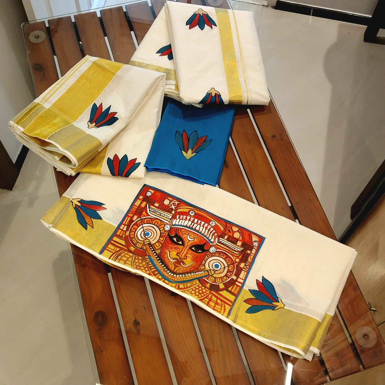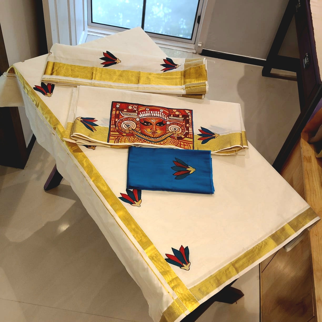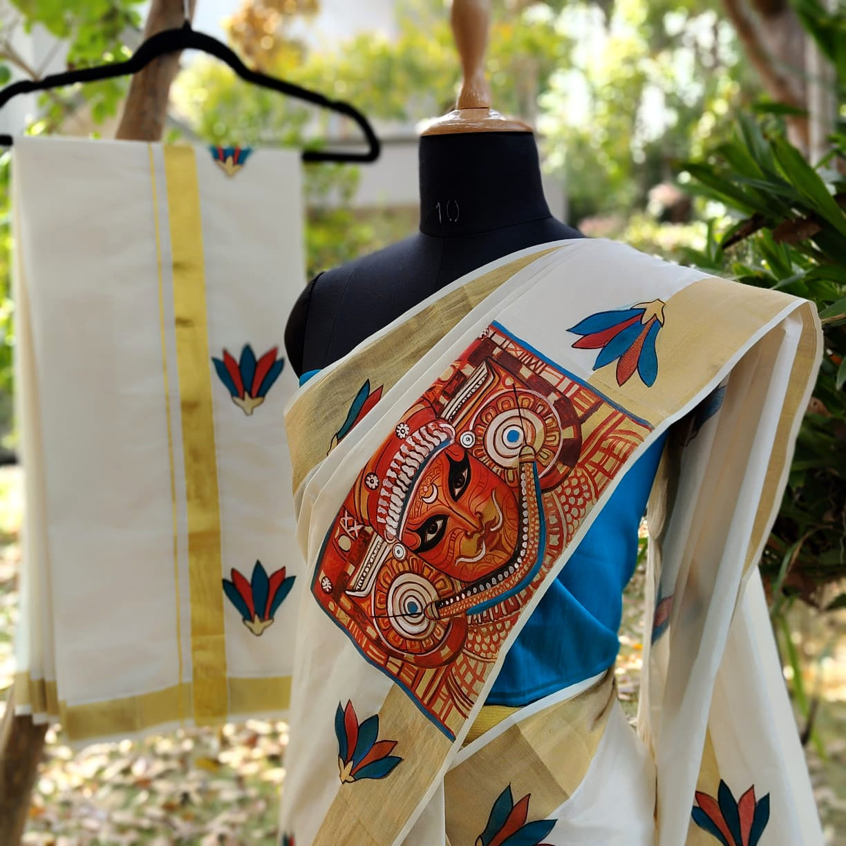 This exclusive hand-painted Majestic Theyyam ensemble features a traditional Set mundu paired with a Men's double dhoti, complemented by a contrasting blouse adorned with painted sleeves. It’s perfect for any festive occasion or as a special gift.