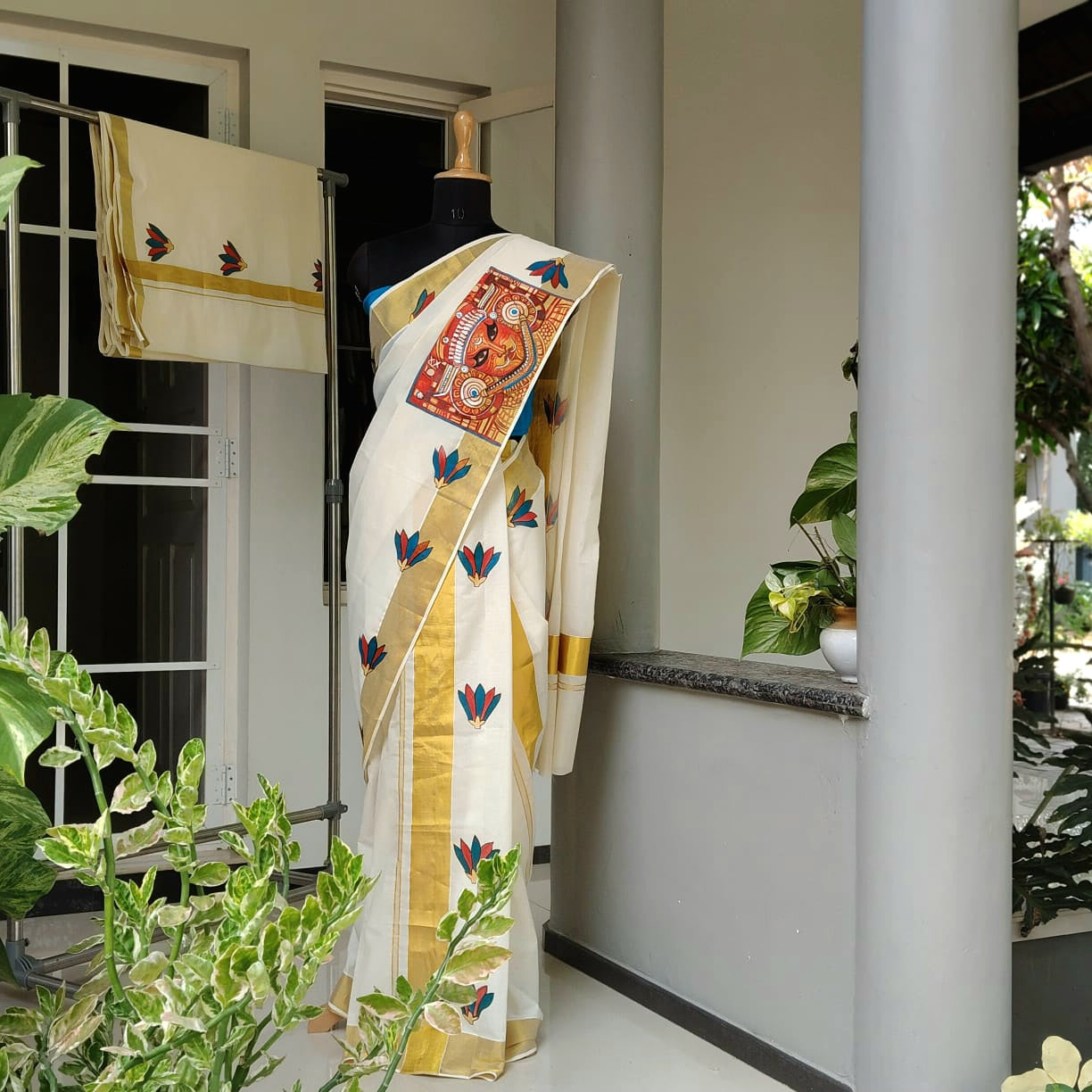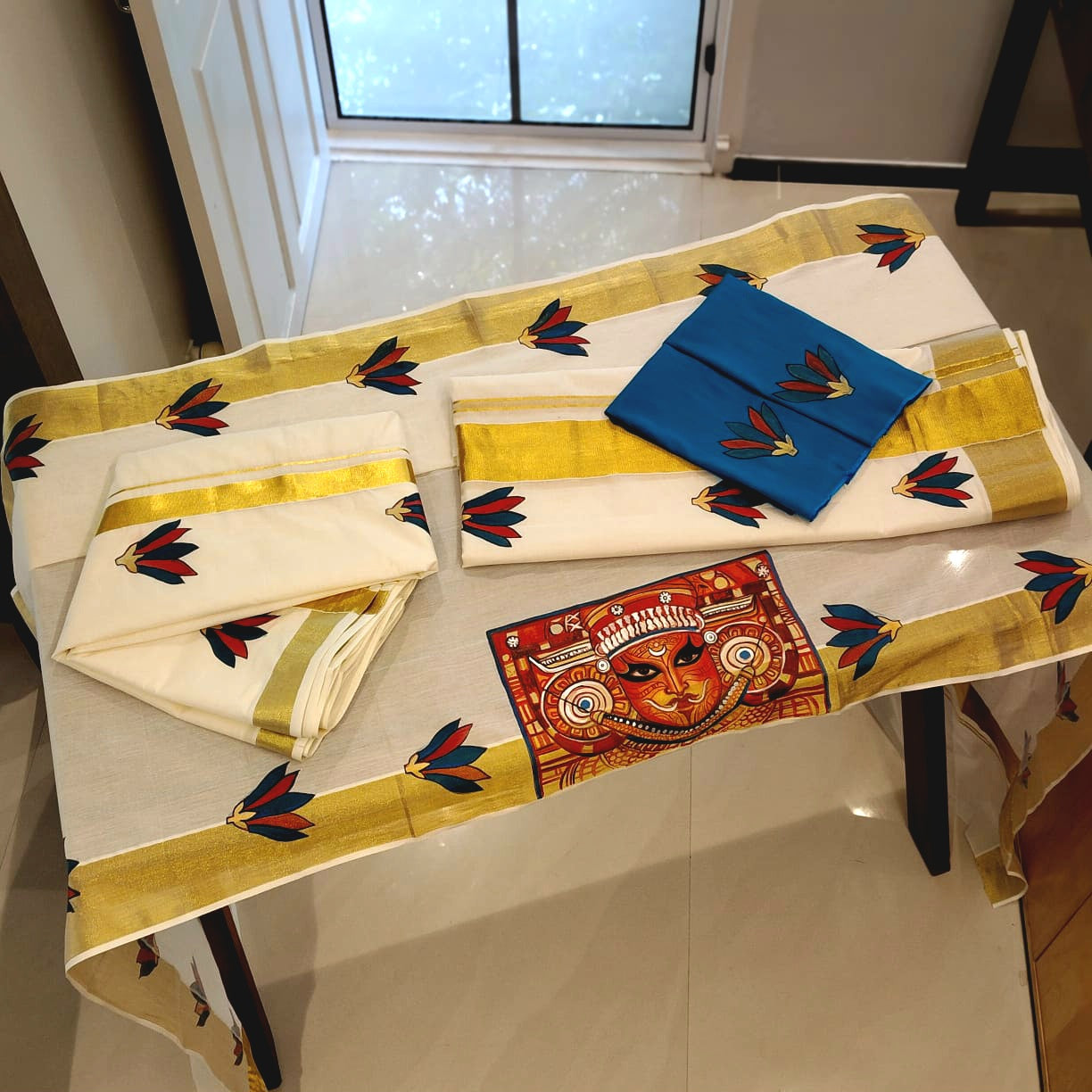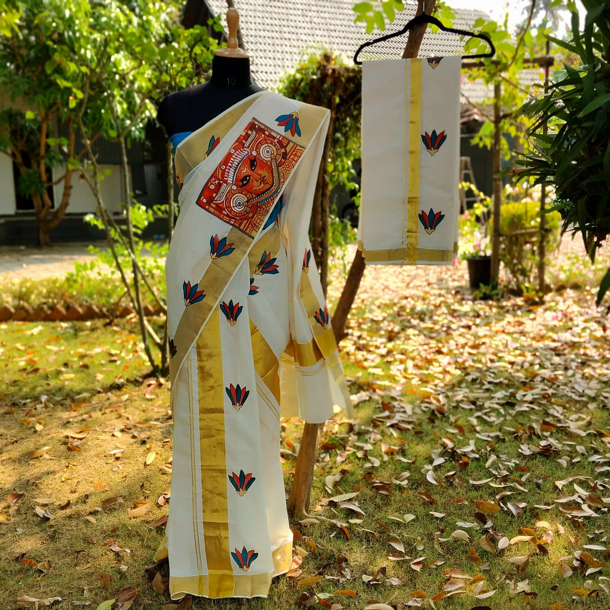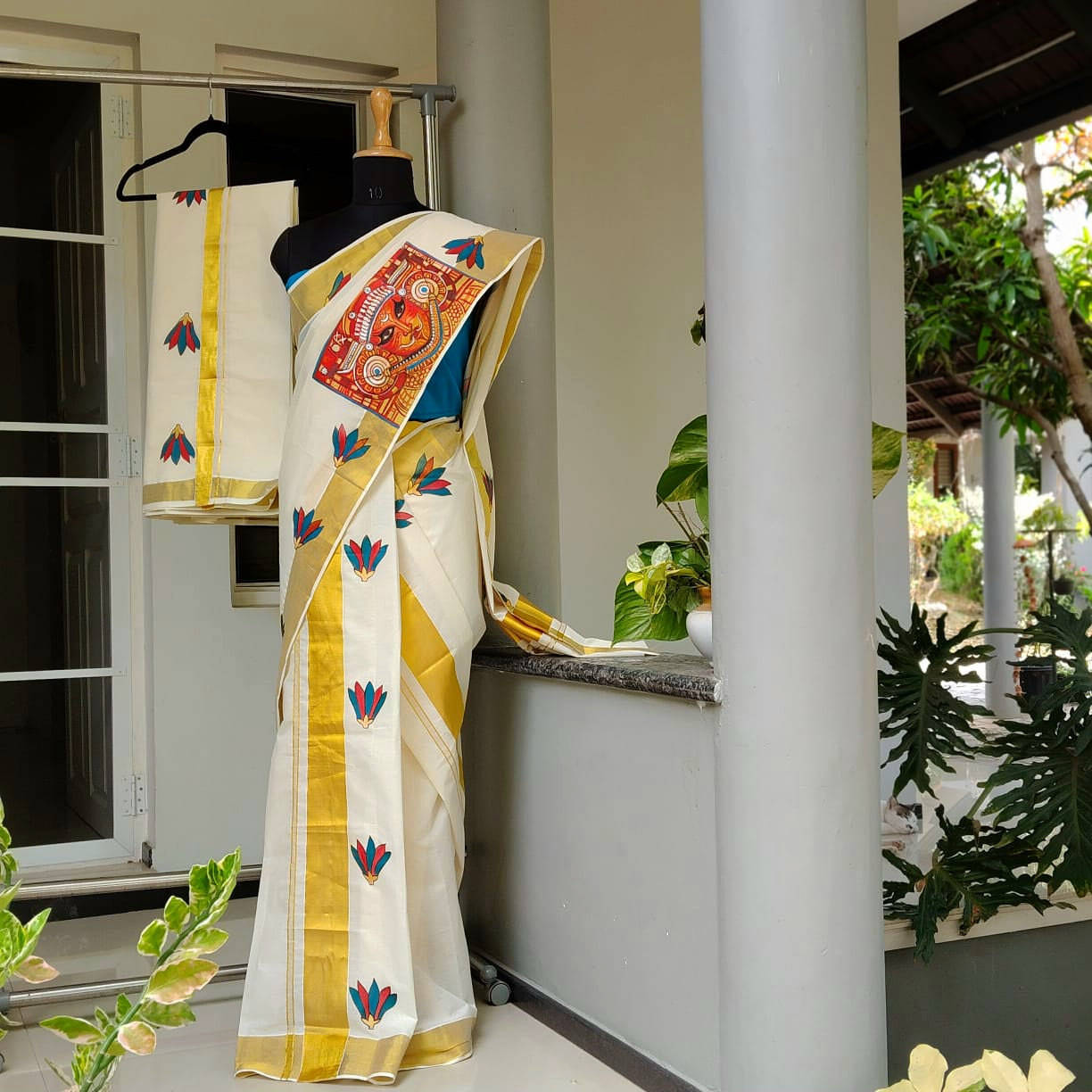 This exclusive hand-painted Majestic Theyyam ensemble features a traditional Set mundu paired with a Men's double dhoti, complemented by a contrasting blouse adorned with painted sleeves. It’s perfect for any festive occasion or as a special gift.