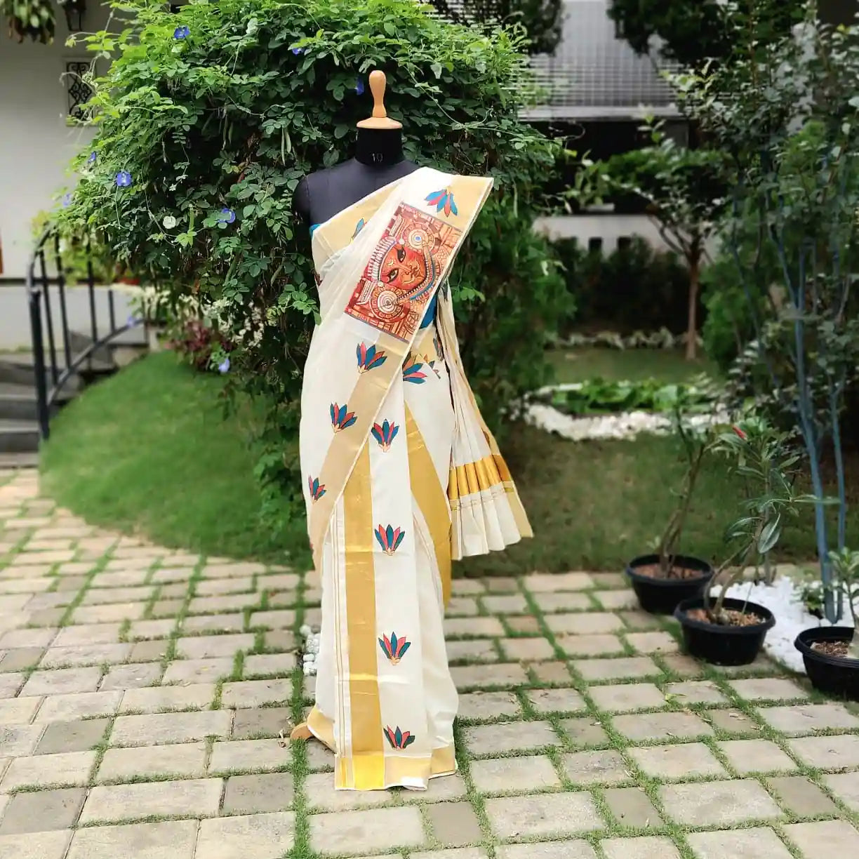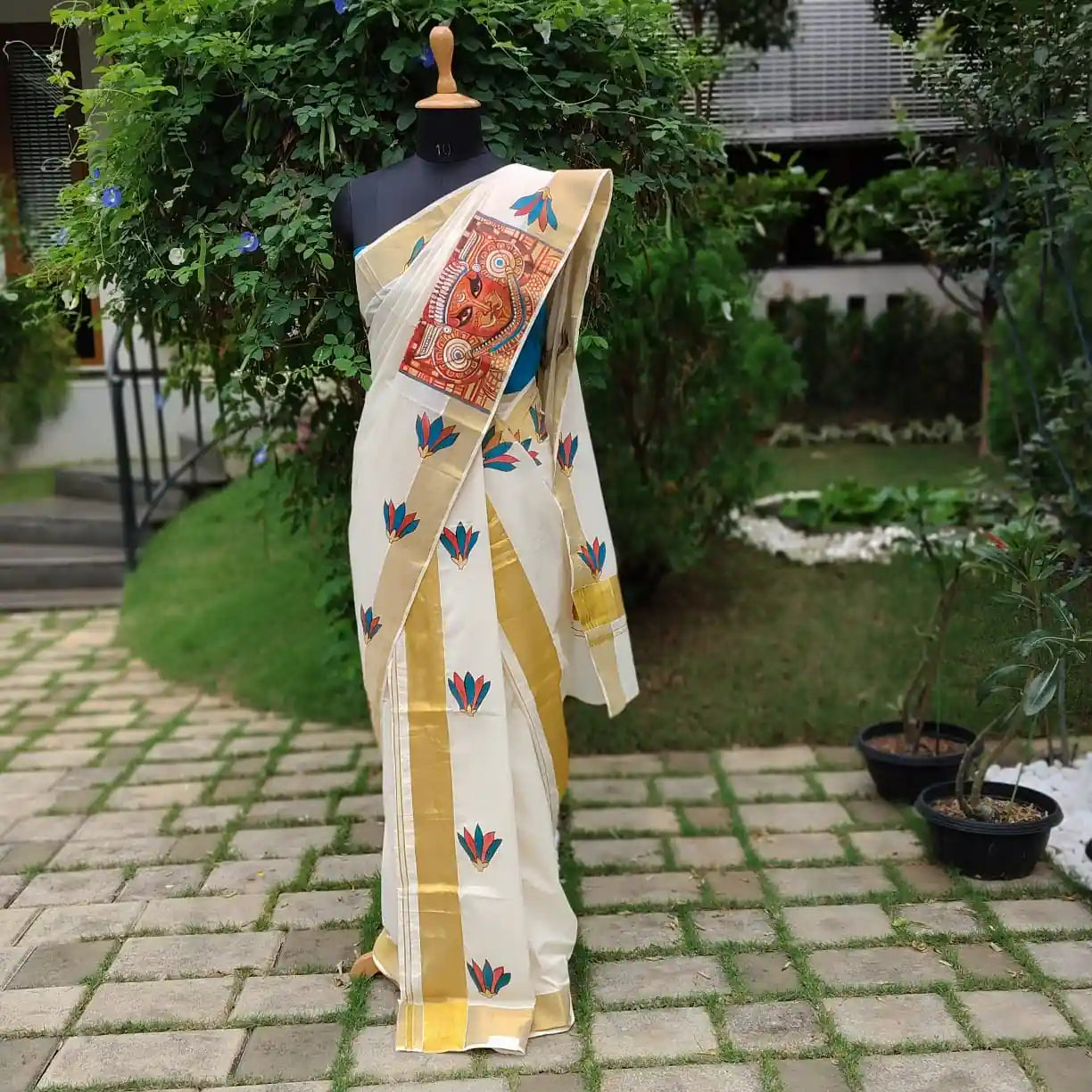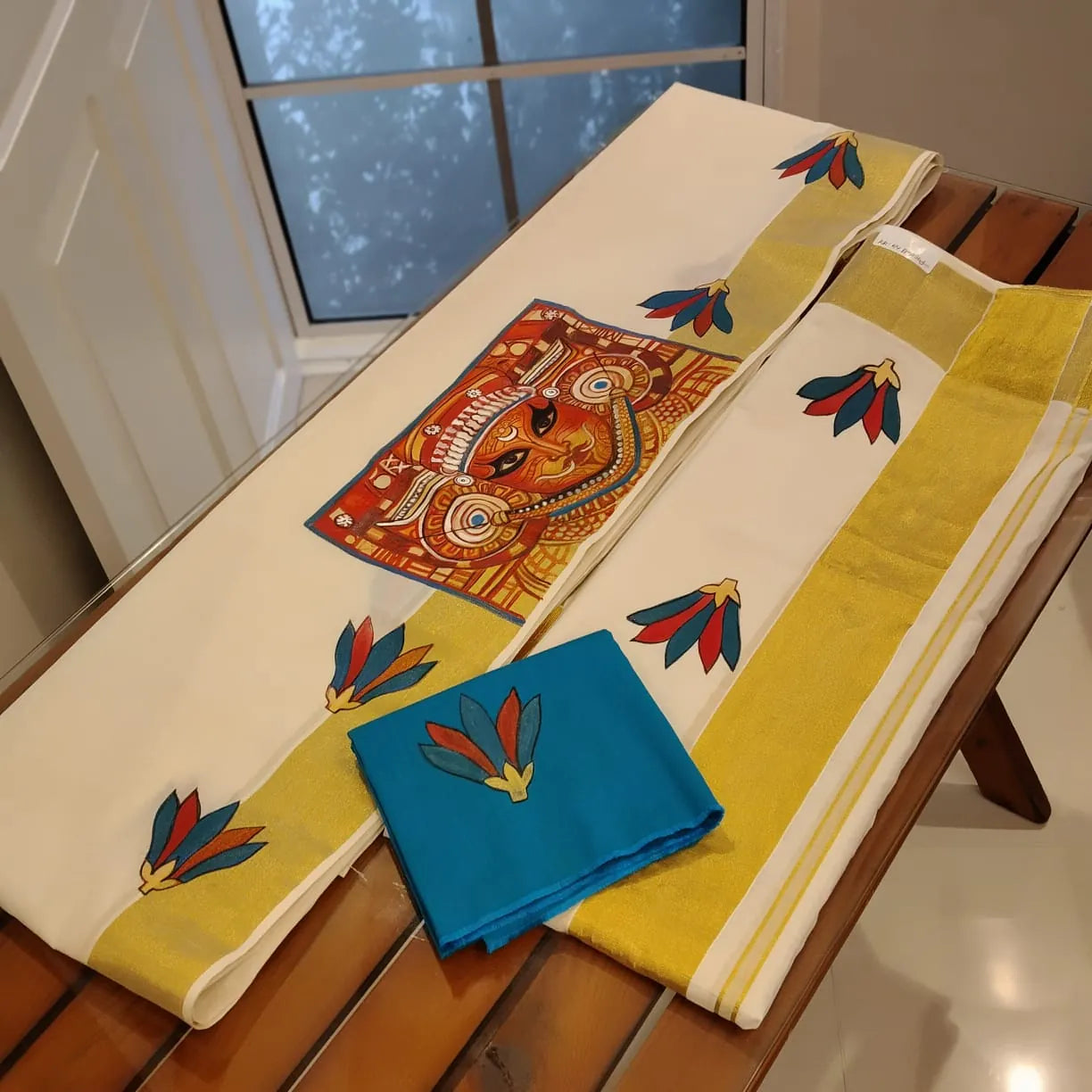 This exclusive hand-painted Majestic Theyyam ensemble features a traditional Set mundu complemented by a contrasting blouse adorned with painted sleeves. It’s perfect for any festive occasion or as a special gift.