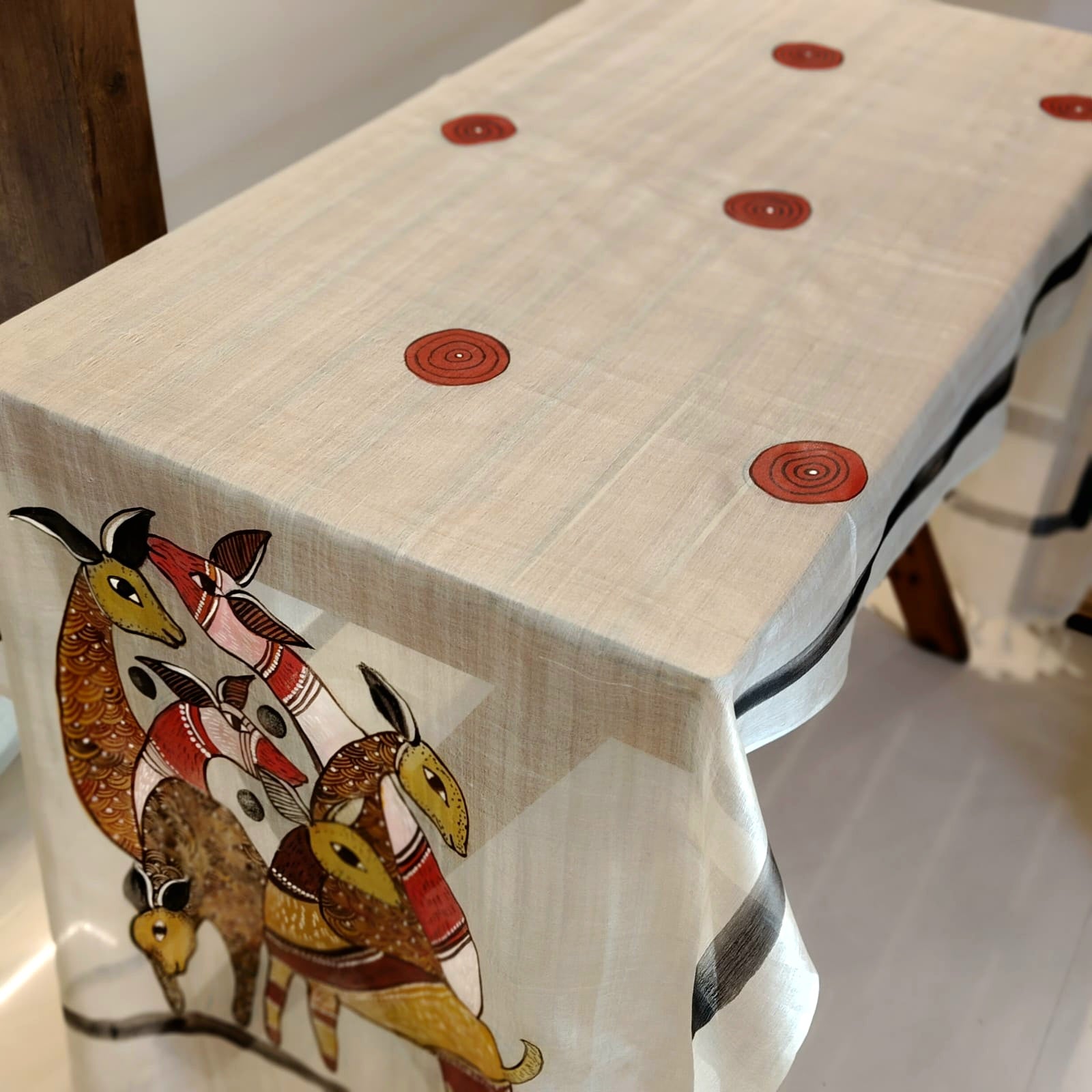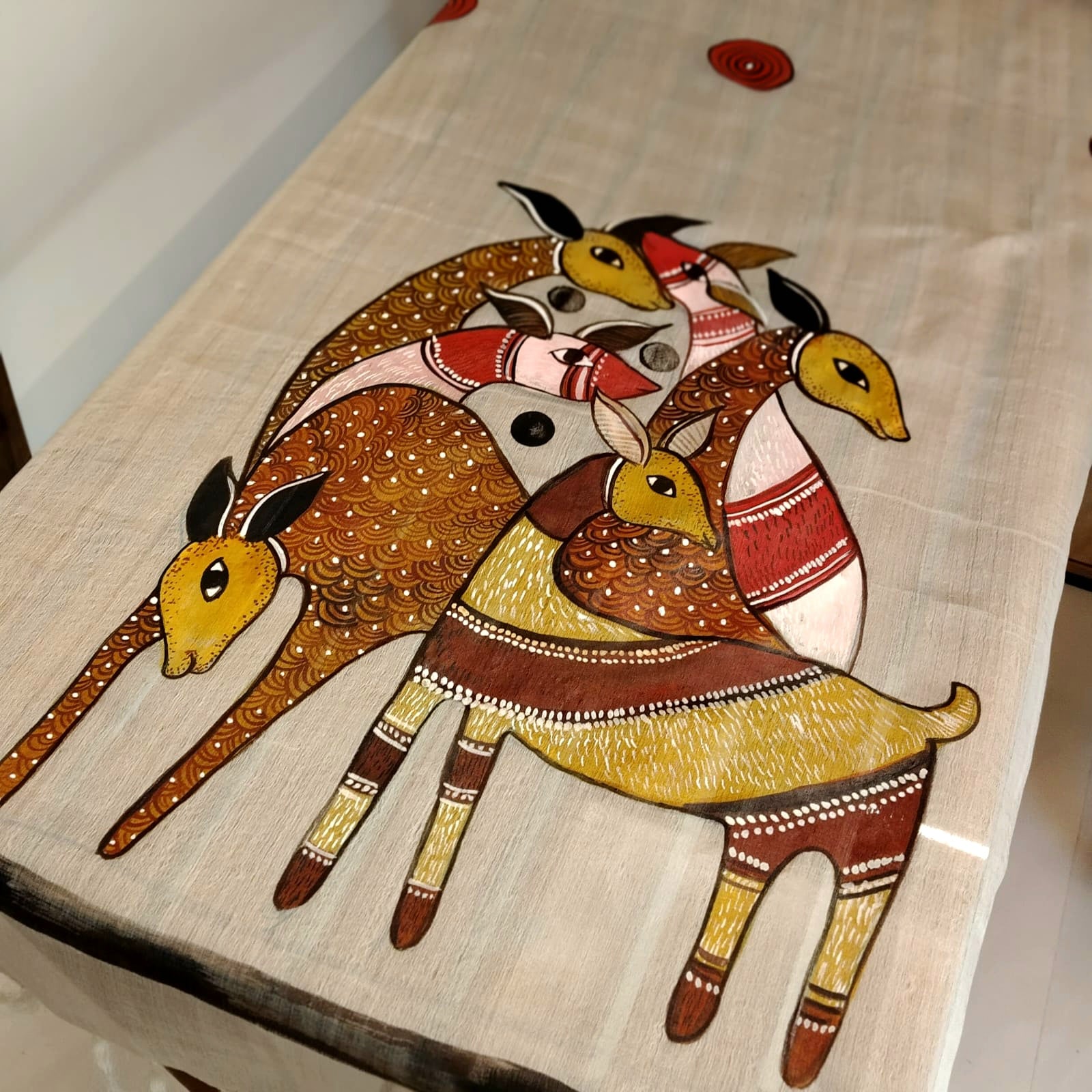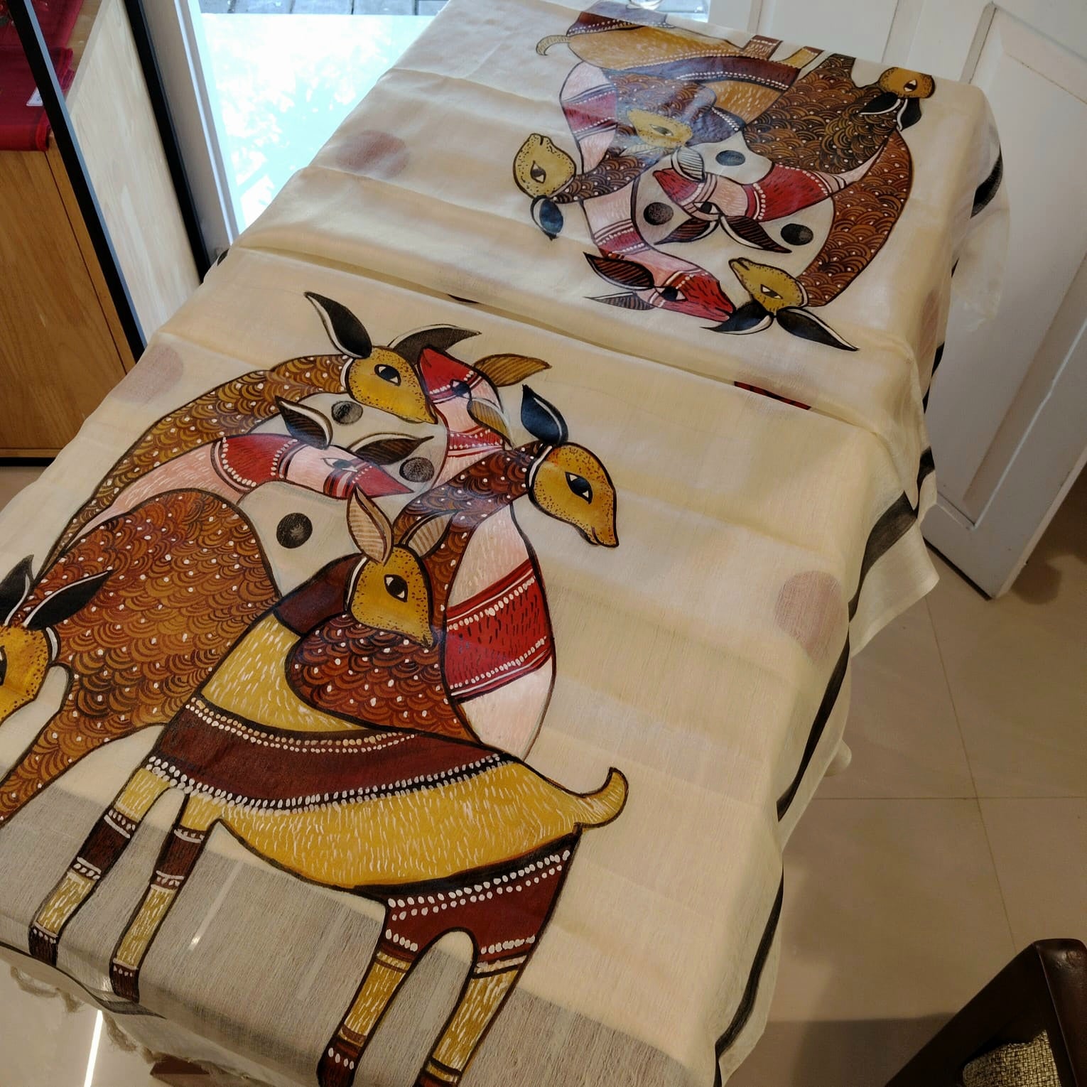Hand-painted Folk Art-themed dupatta in Tussar silk—perfect to pair with your plain top/ bottom or to gift someone special.