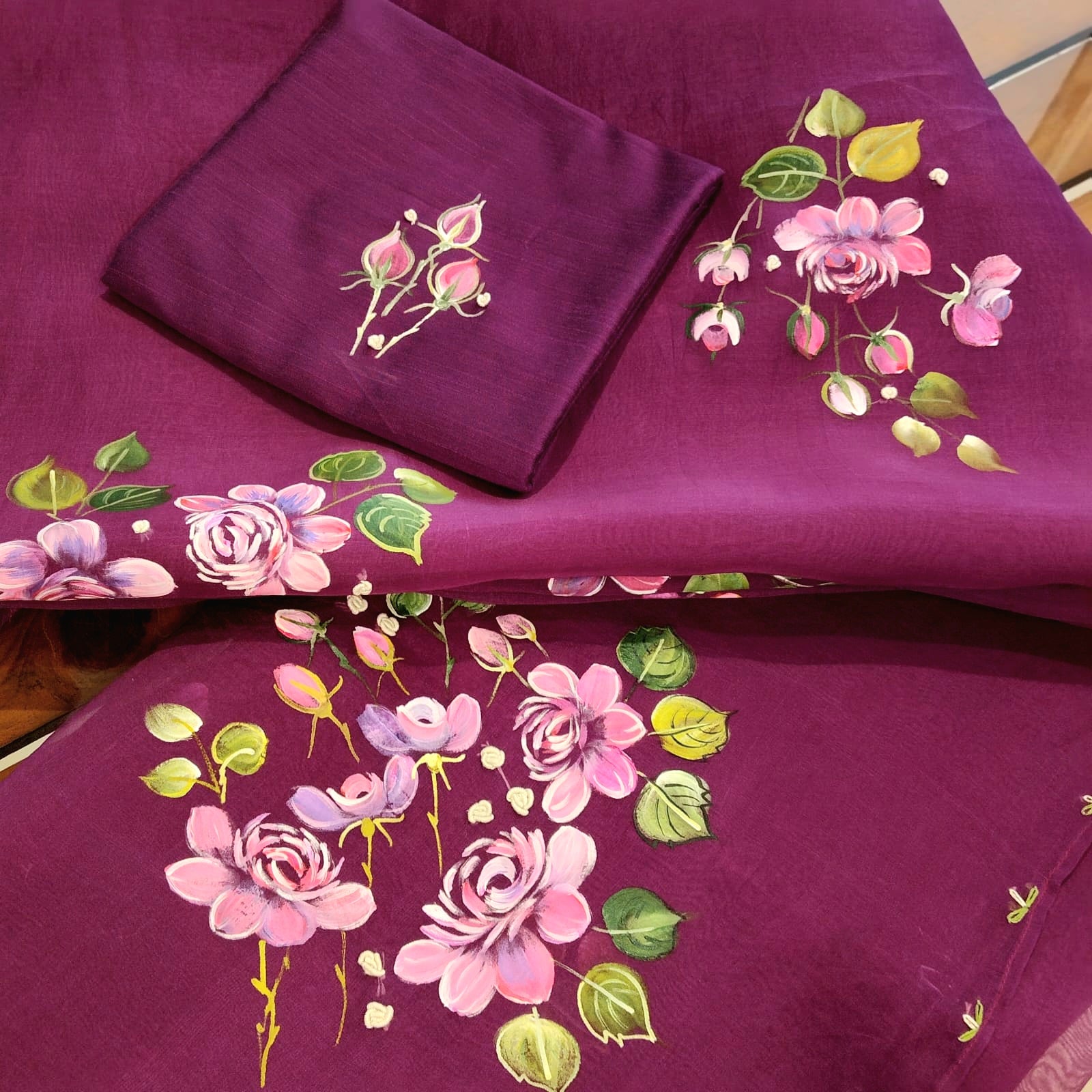 Gorgeous hand-painted and hand-embroidered silk organza saree in a rich deep violet-pink shade, adorned with delicate rose motifs throughout. Comes with a 1-meter blouse piece featuring work on the sleeves.