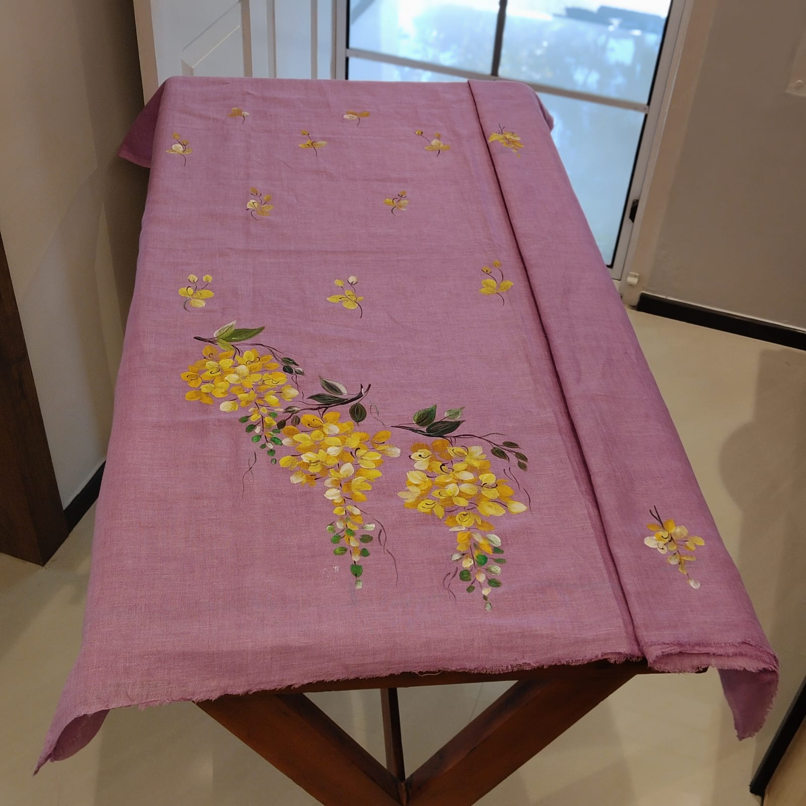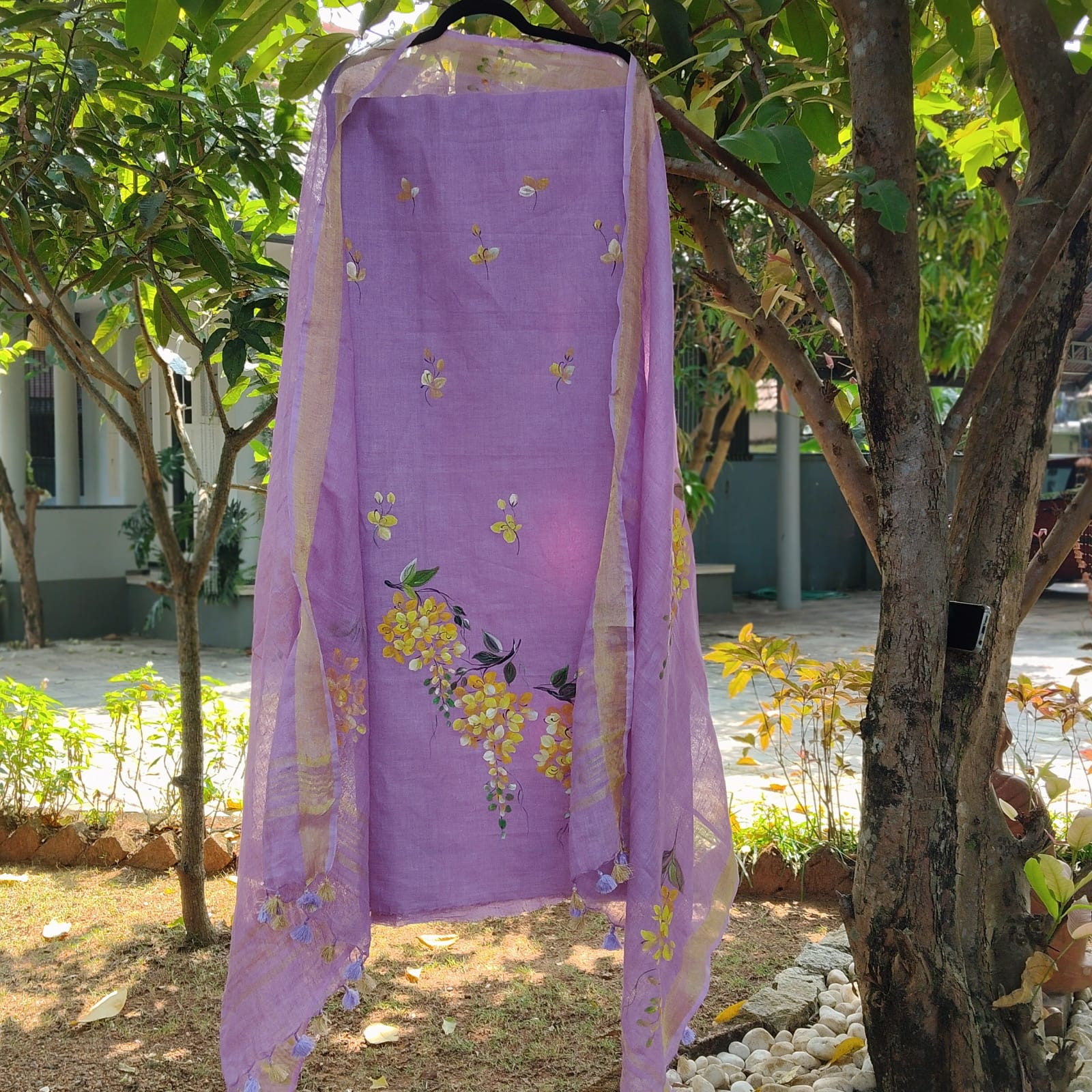 Gorgeous Purple hand-painted salwar kameez set featuring delicate yellow flowers on the top and dupatta. The top and dupatta are crafted from fine linen, while the bottom is made of pure cotton.