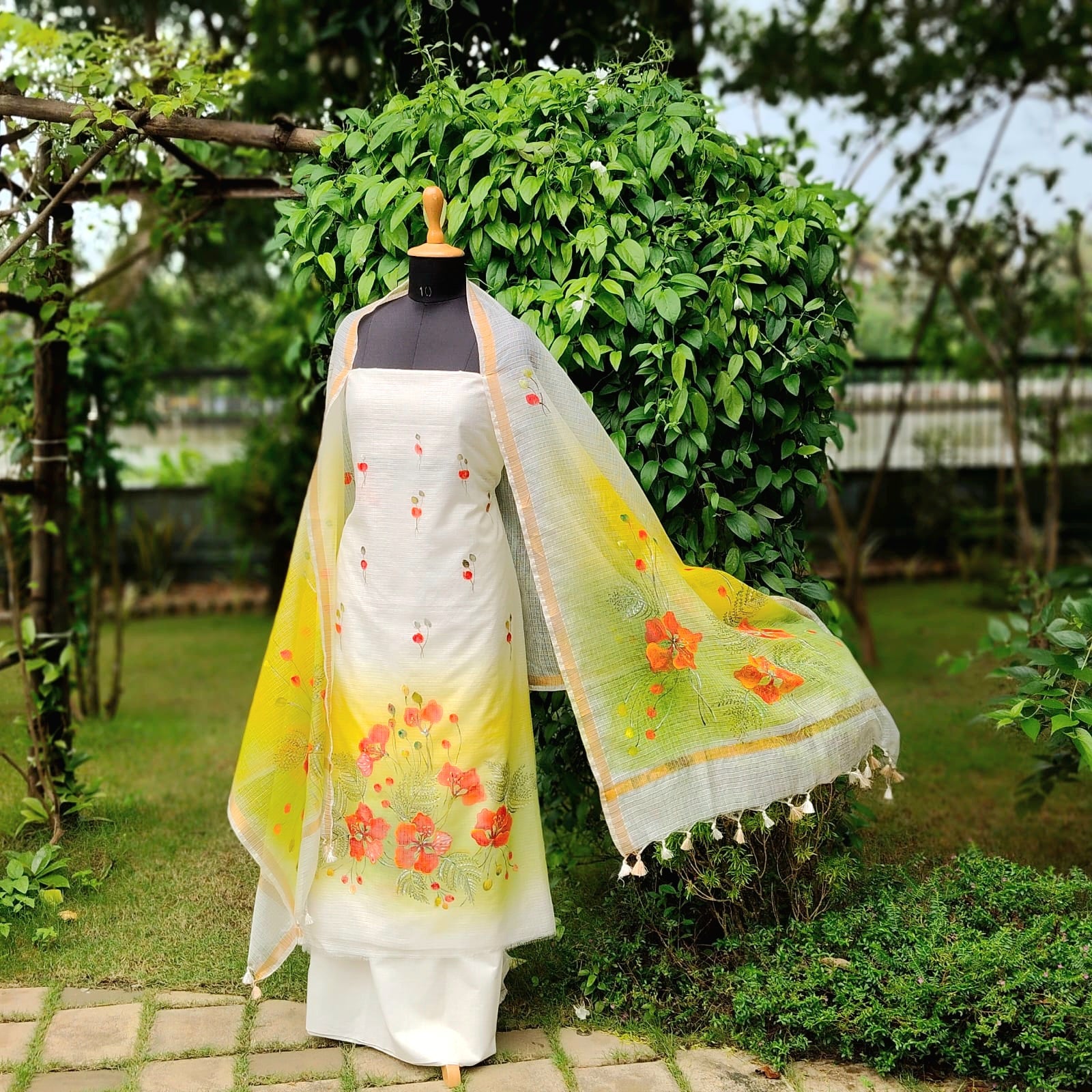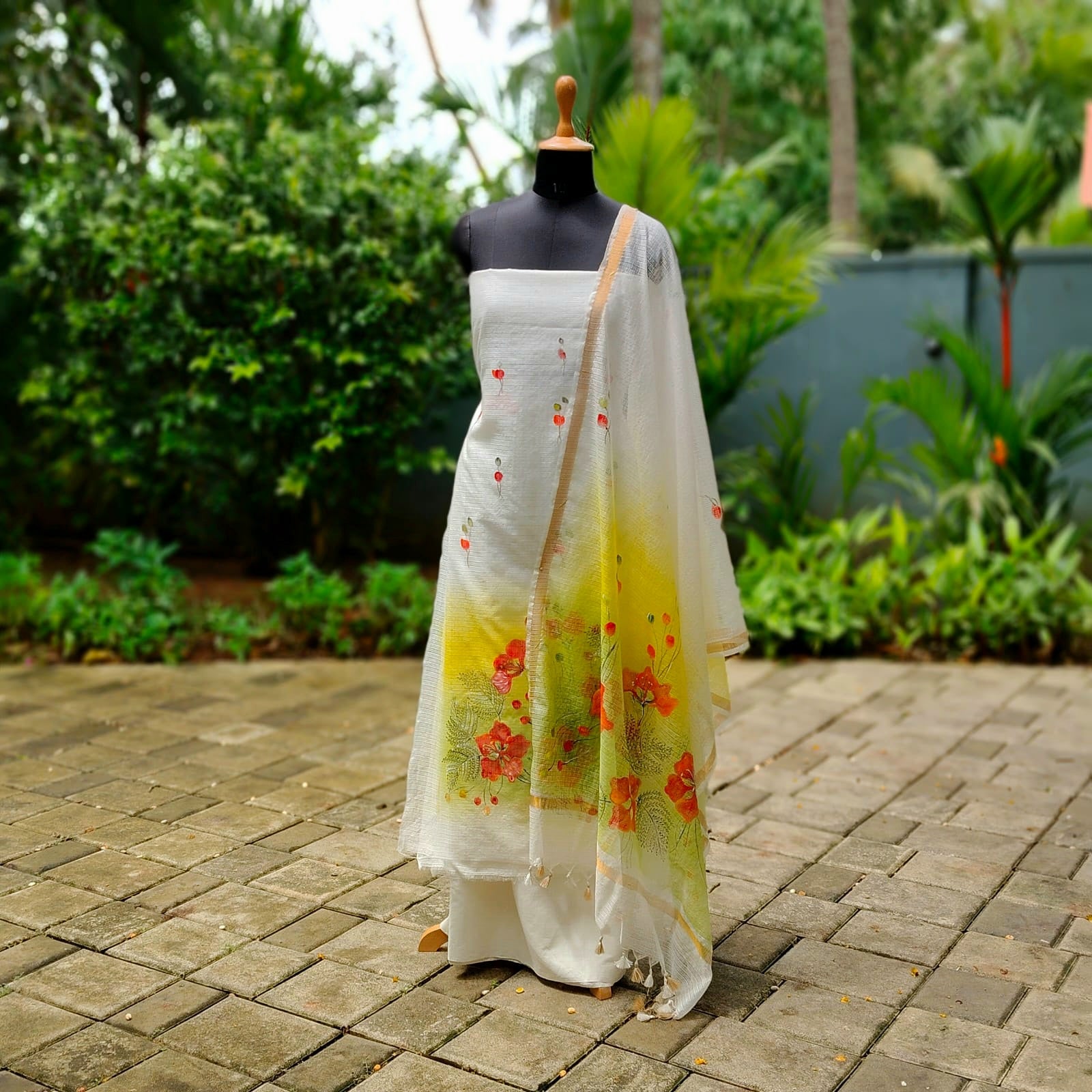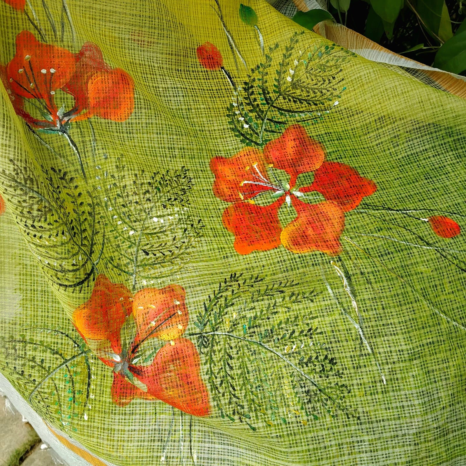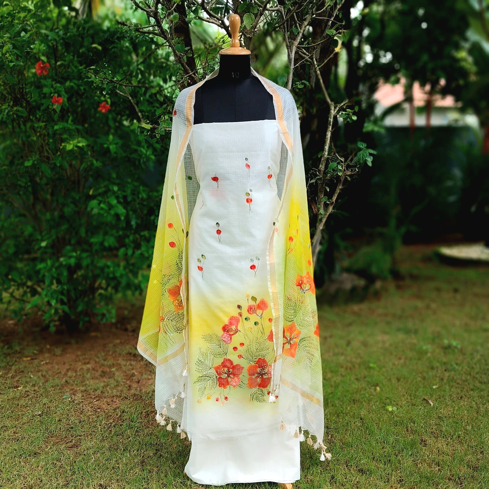 Gorgeous hand-dyed and hand-painted Kota Doria salwar kameez set featuring vibrant Gulmohar flowers delicately painted on the top and dupatta. Comes with a pure cotton bottom.