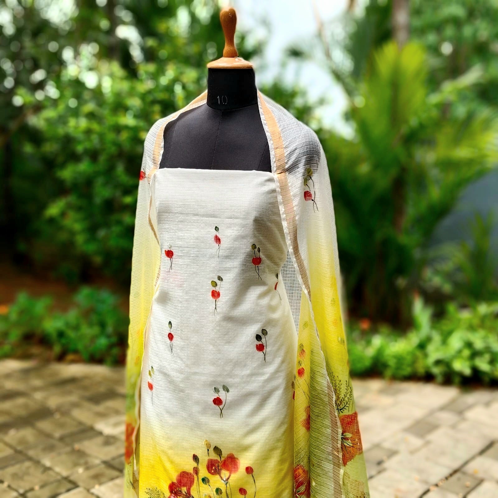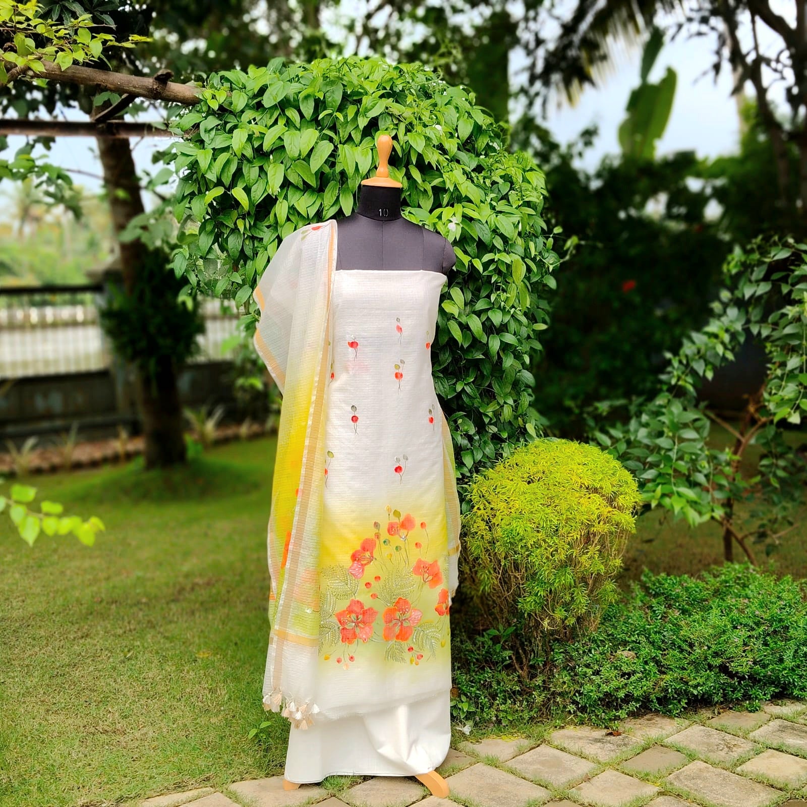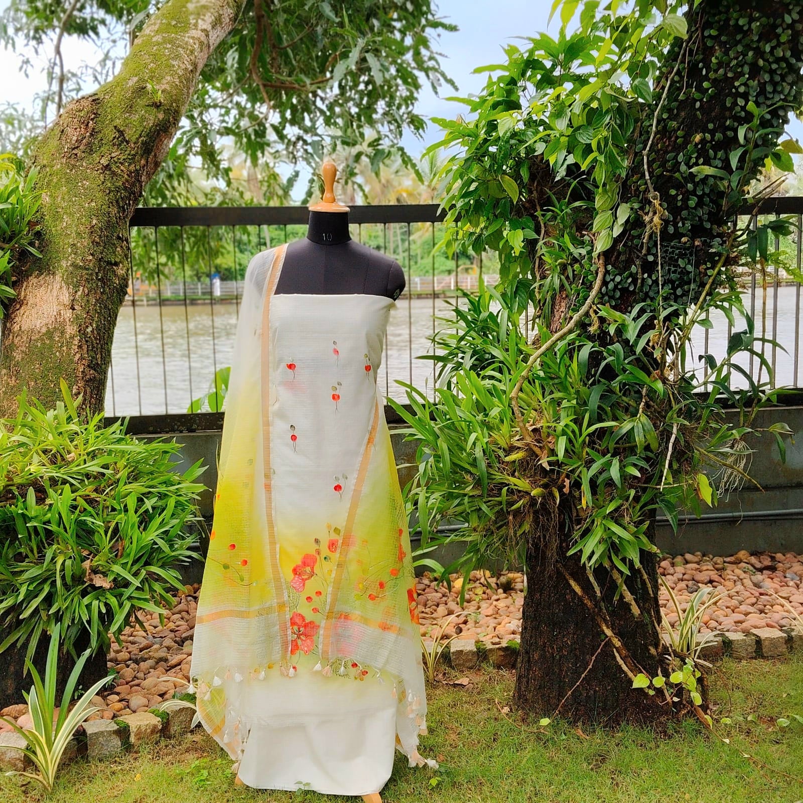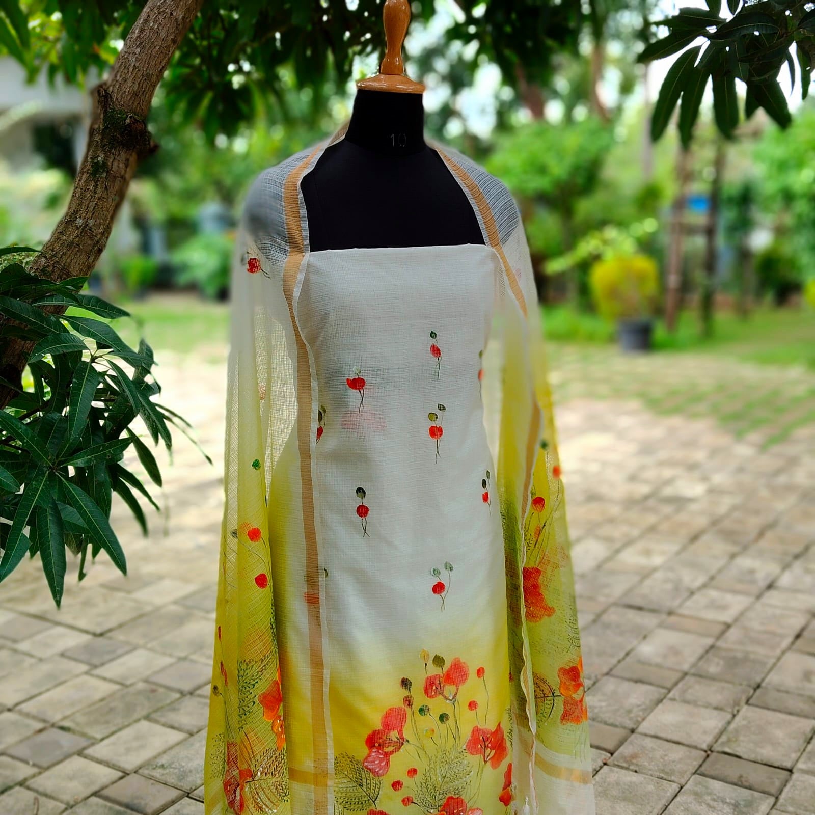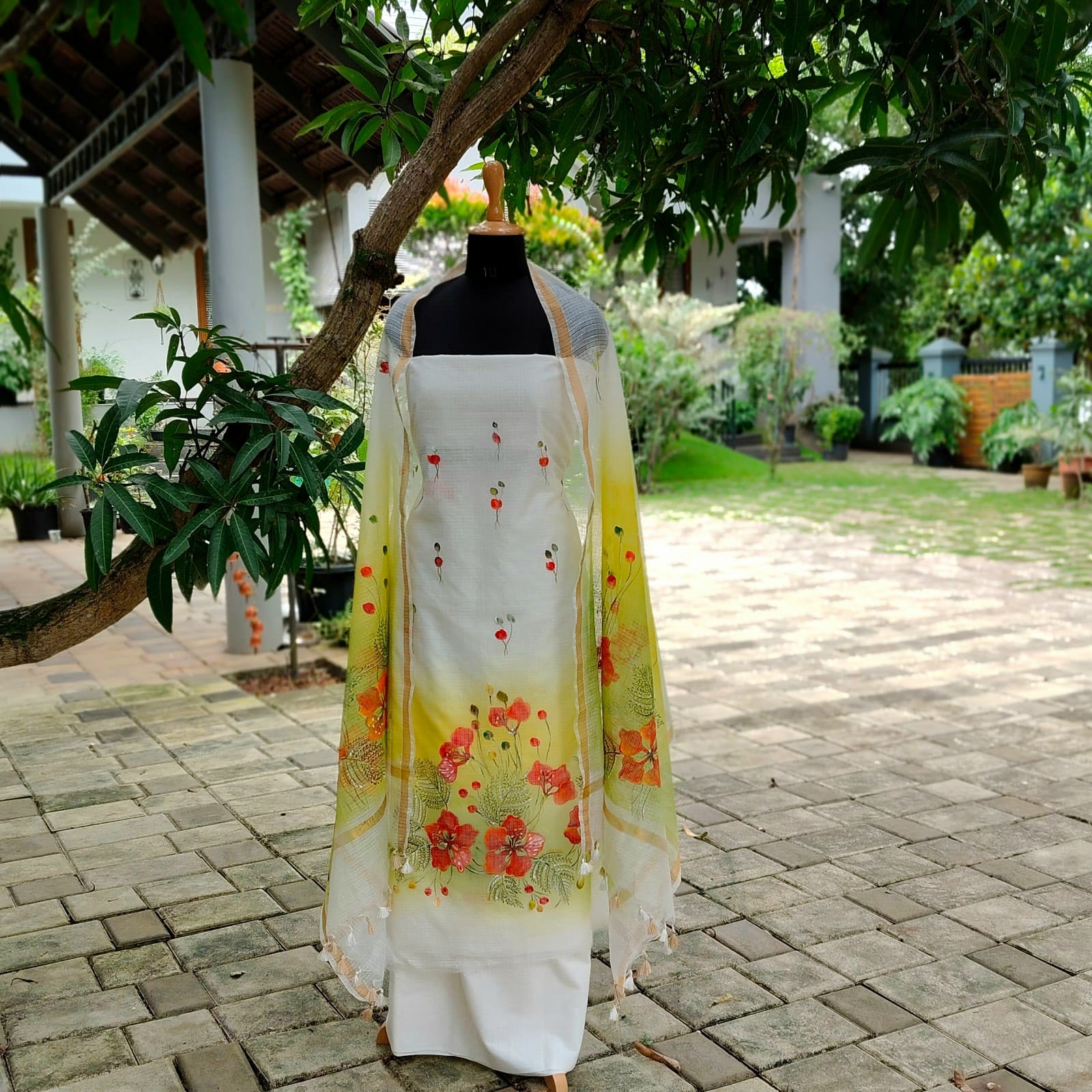 Gorgeous hand-dyed and hand-painted Kota Doria salwar kameez set featuring vibrant Gulmohar flowers delicately painted on the top and dupatta. Comes with a pure cotton bottom.