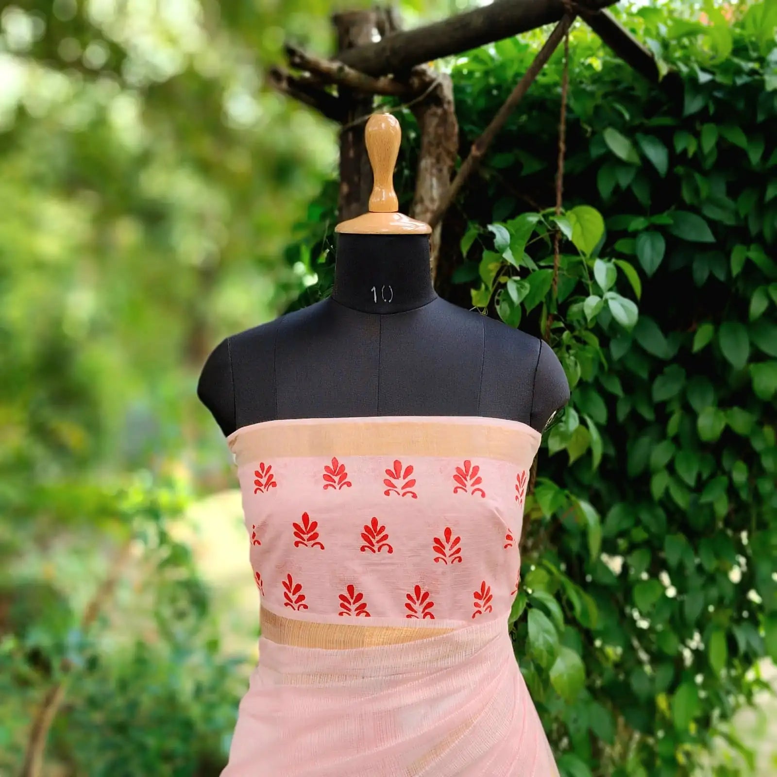 Gorgeous hand-painted Alpona art on this soft pink Kota Doria saree. The pallu and blouse are beautifully painted to give the set a distinctive, artistic charm.