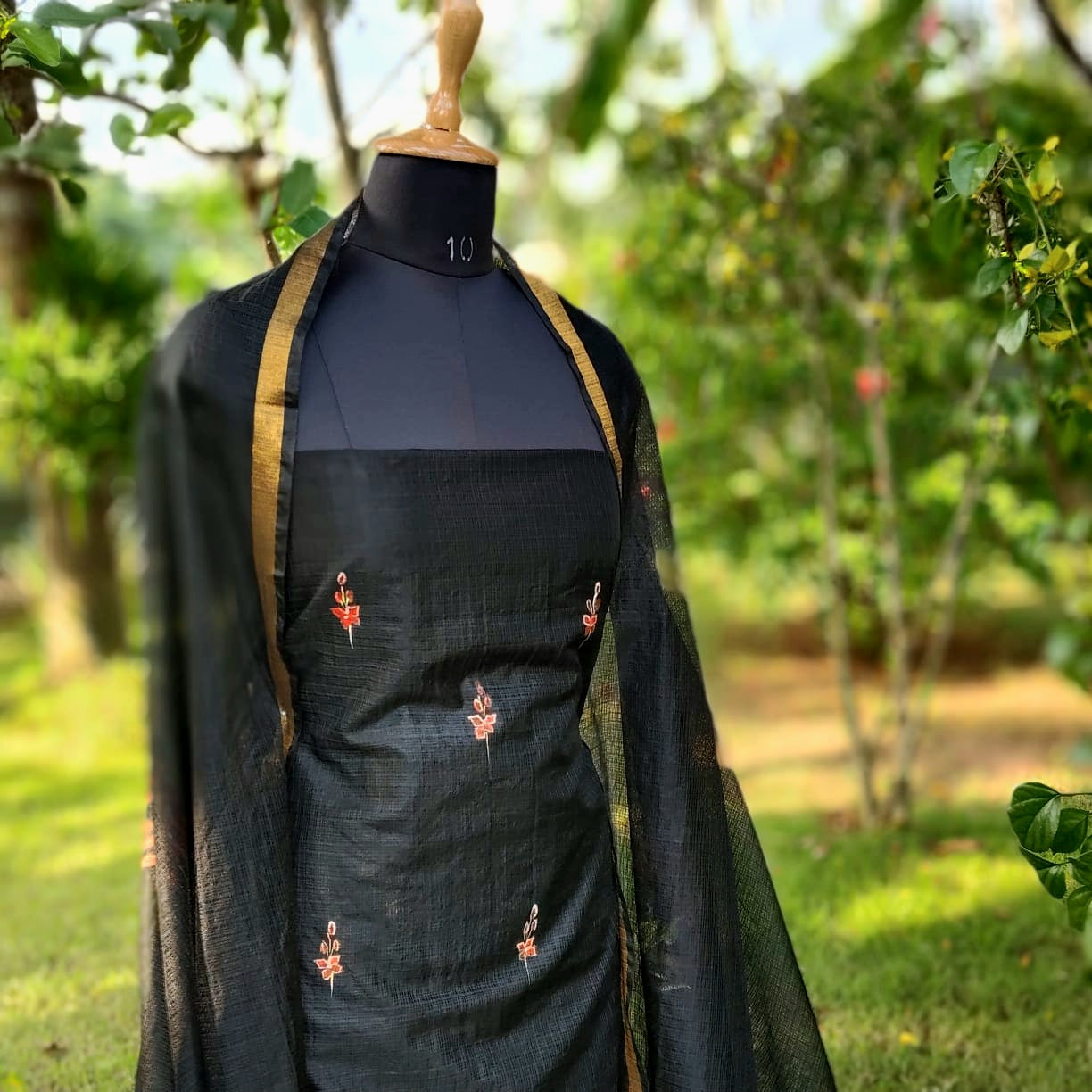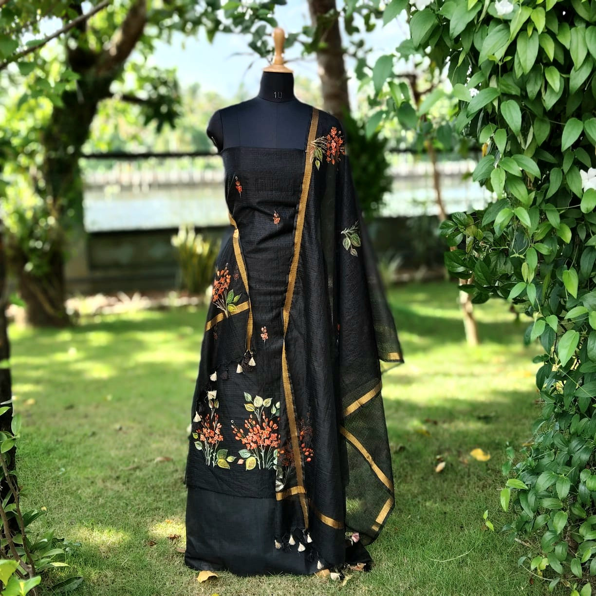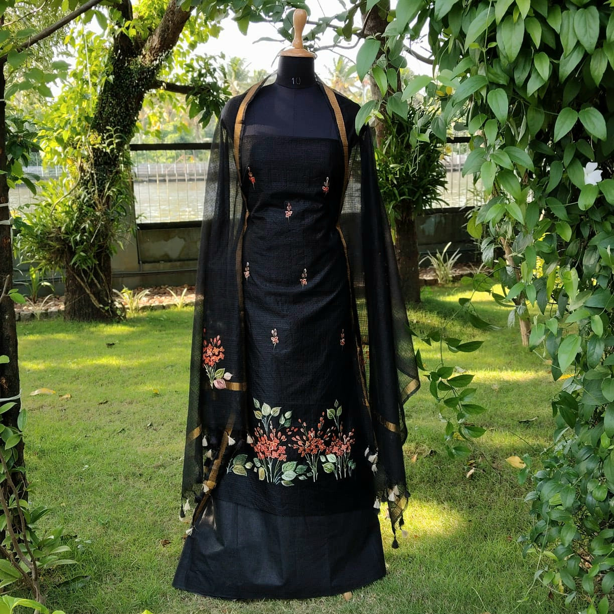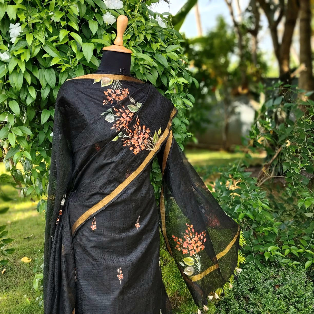Elegant black Kota Doria fabric adorned with classic Chetthi flowers, meticulously hand-painted across the top and dupatta. Paired with a pure cotton bottom.