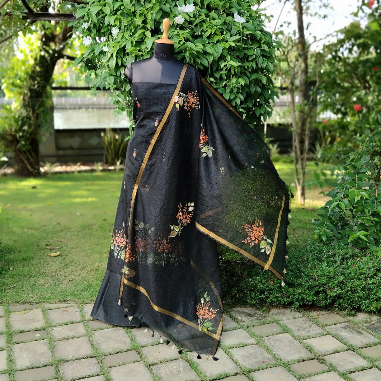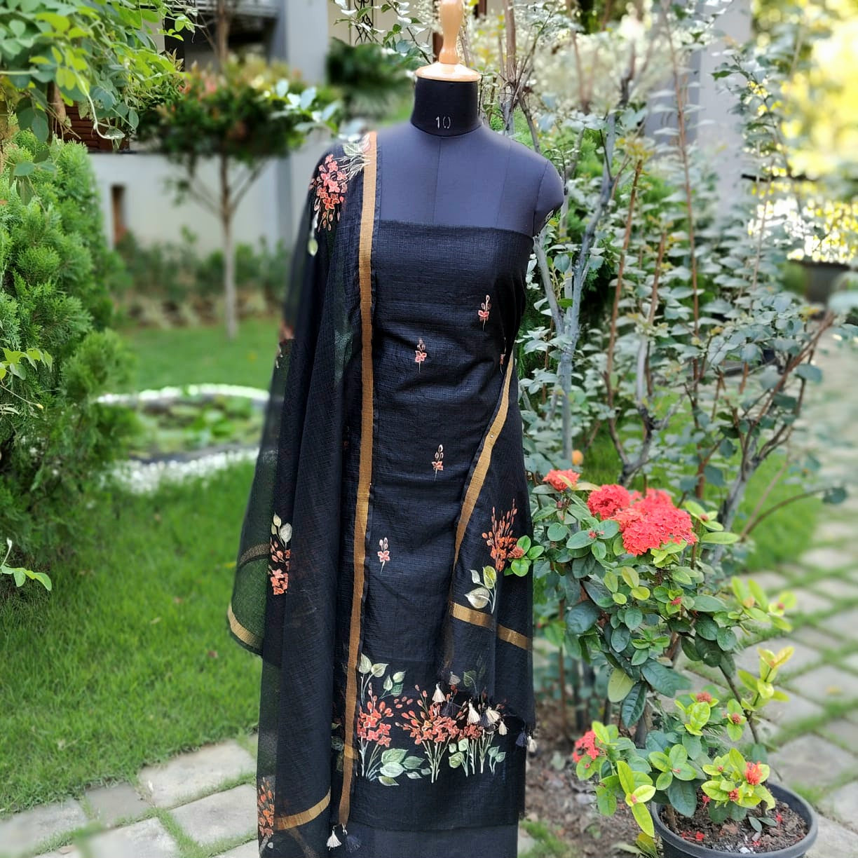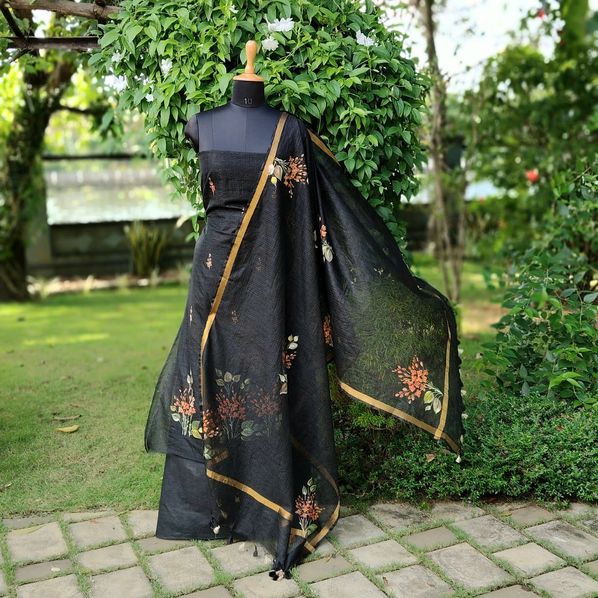 Elegant black Kota Doria fabric adorned with classic Chetthi flowers, meticulously hand-painted across the top and dupatta. Paired with a pure cotton bottom.