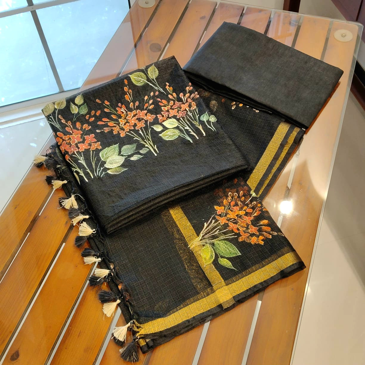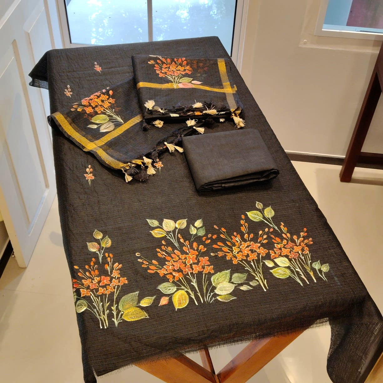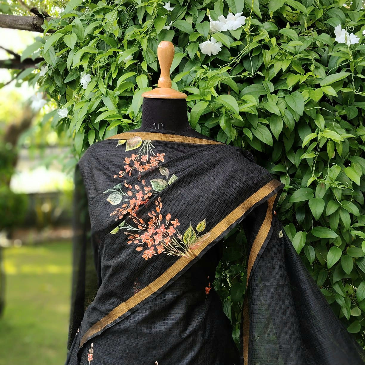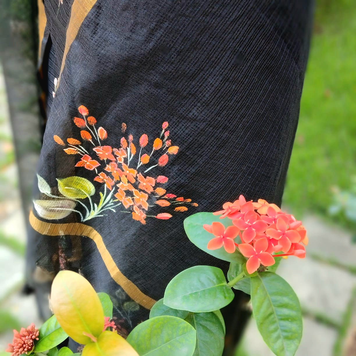 Elegant black Kota Doria fabric adorned with classic Chetthi flowers, meticulously hand-painted across the top and dupatta. Paired with a pure cotton bottom.