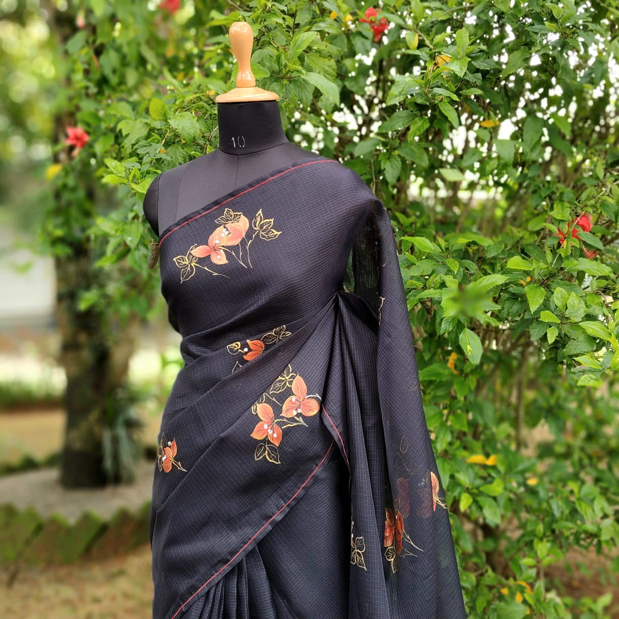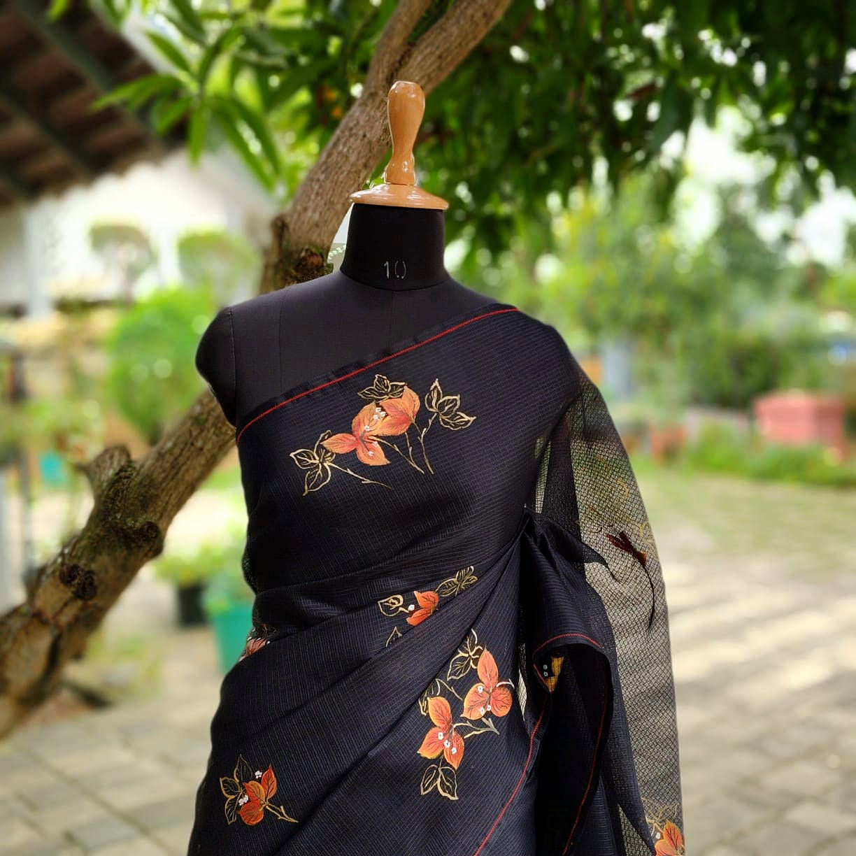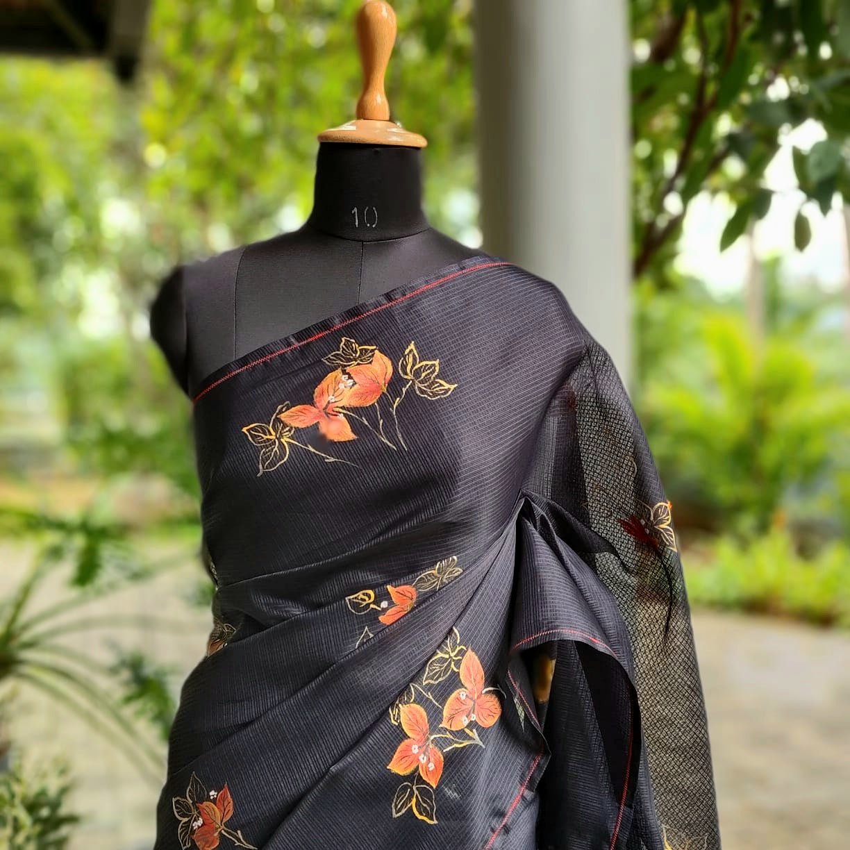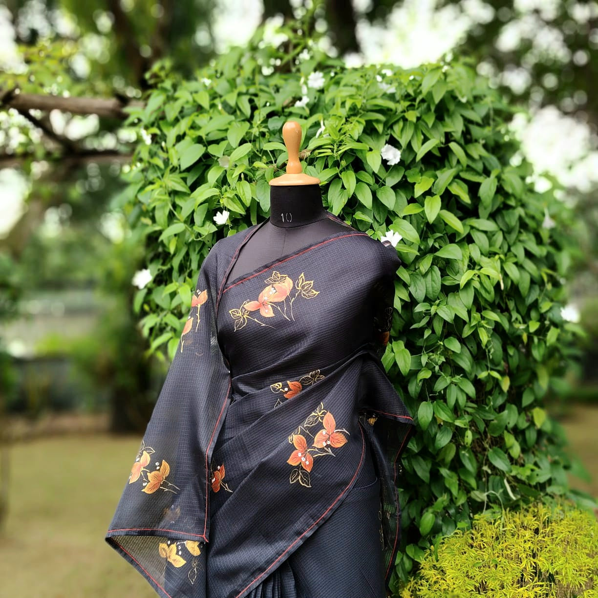 Pretty hand-painted Kota silk saree adorned with antique-style bougainvillea motifs all over. Comes with a 1-metre running blouse piece with matching painted sleeves