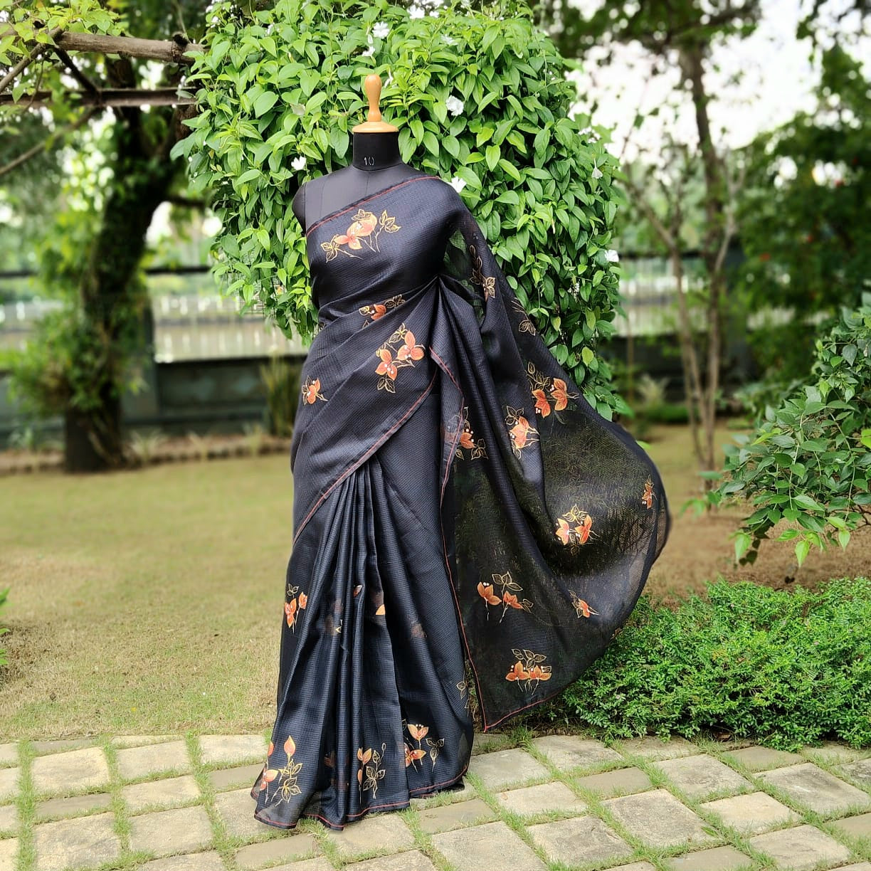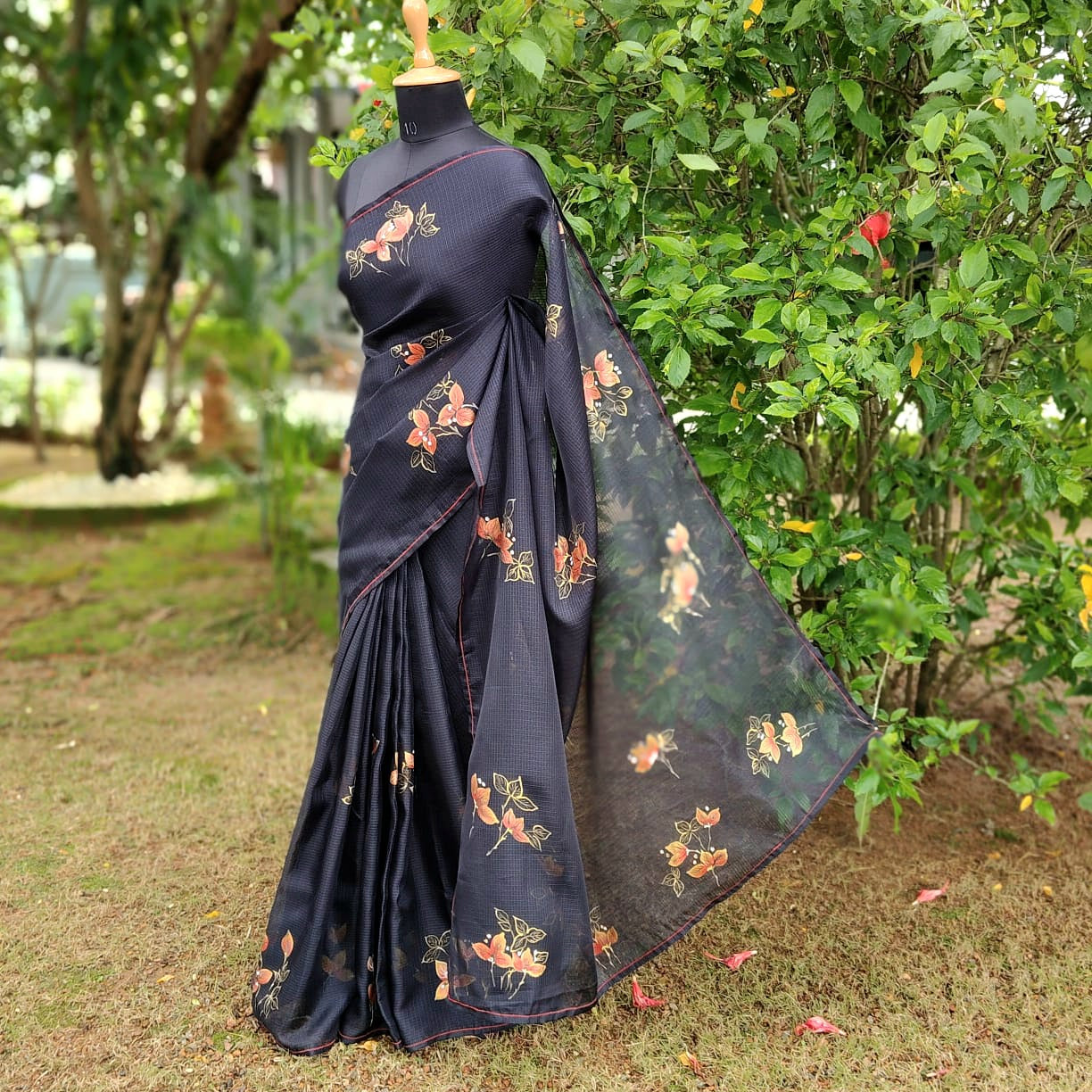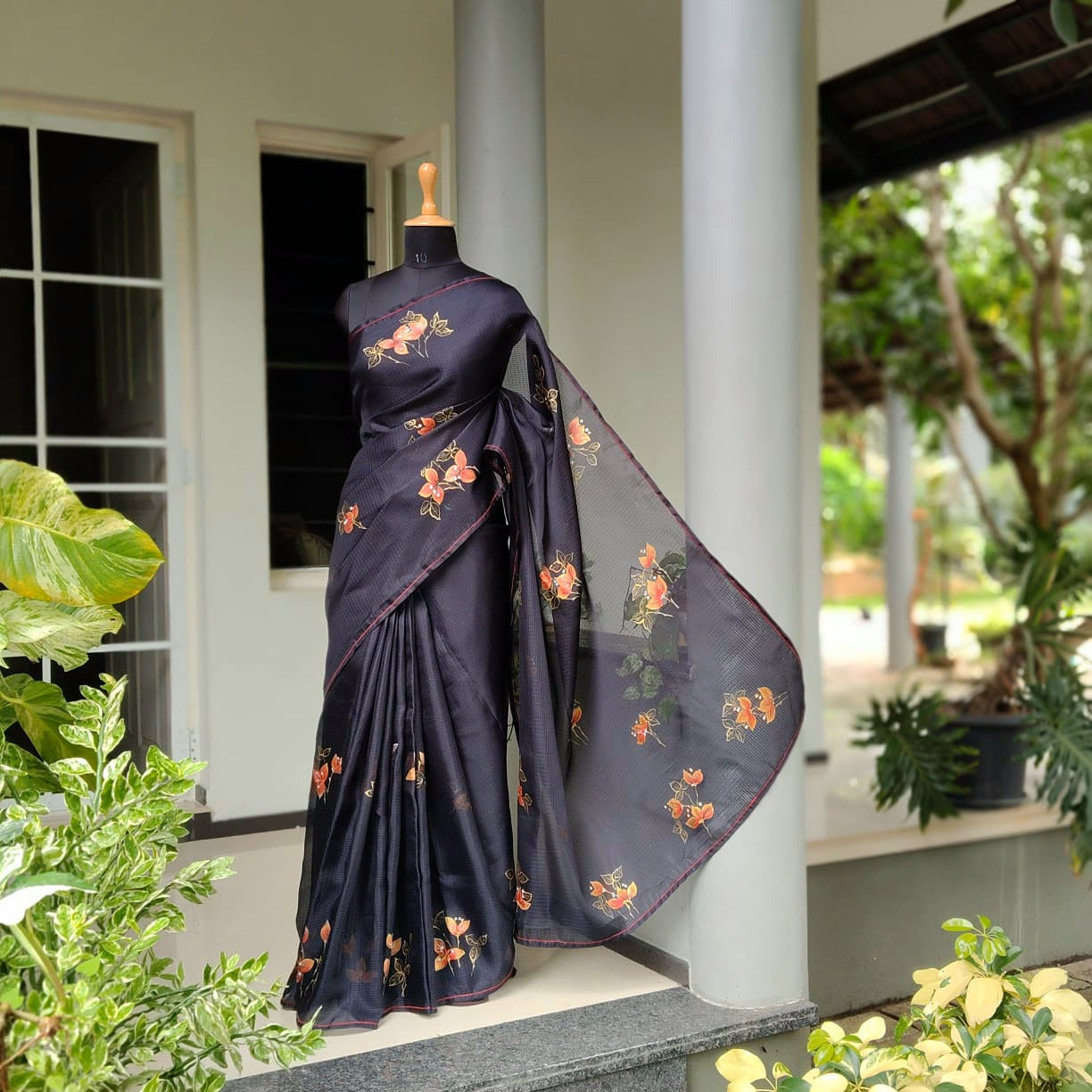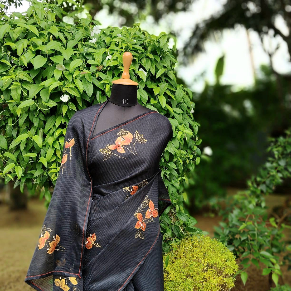 Pretty hand-painted Kota silk saree adorned with antique-style bougainvillea motifs all over. Comes with a 1-metre running blouse piece with matching painted sleeves