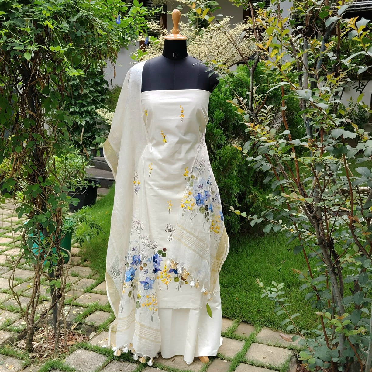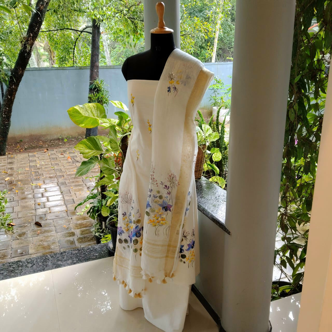 Elegant hand-painted linen salwar kameez set featuring delicate wildflower motifs on the top and dupatta. Paired with a comfortable cotton bottom, this breezy ensemble is perfect for summer wear or special occasions.