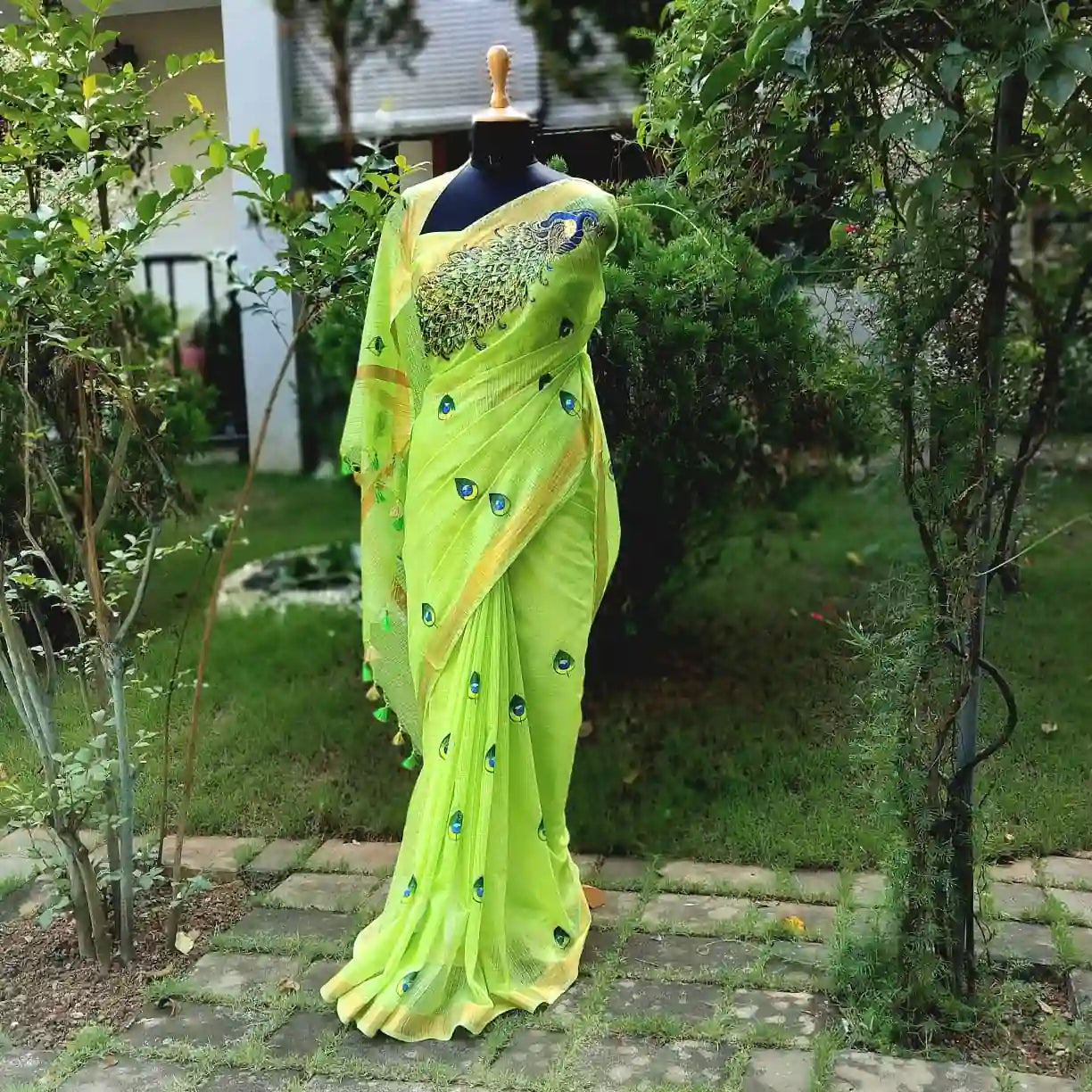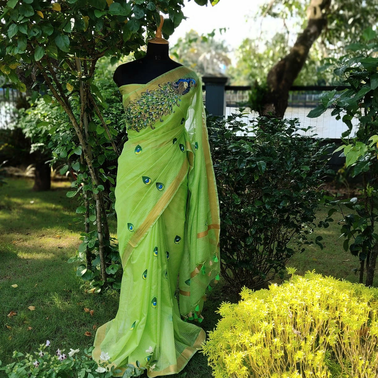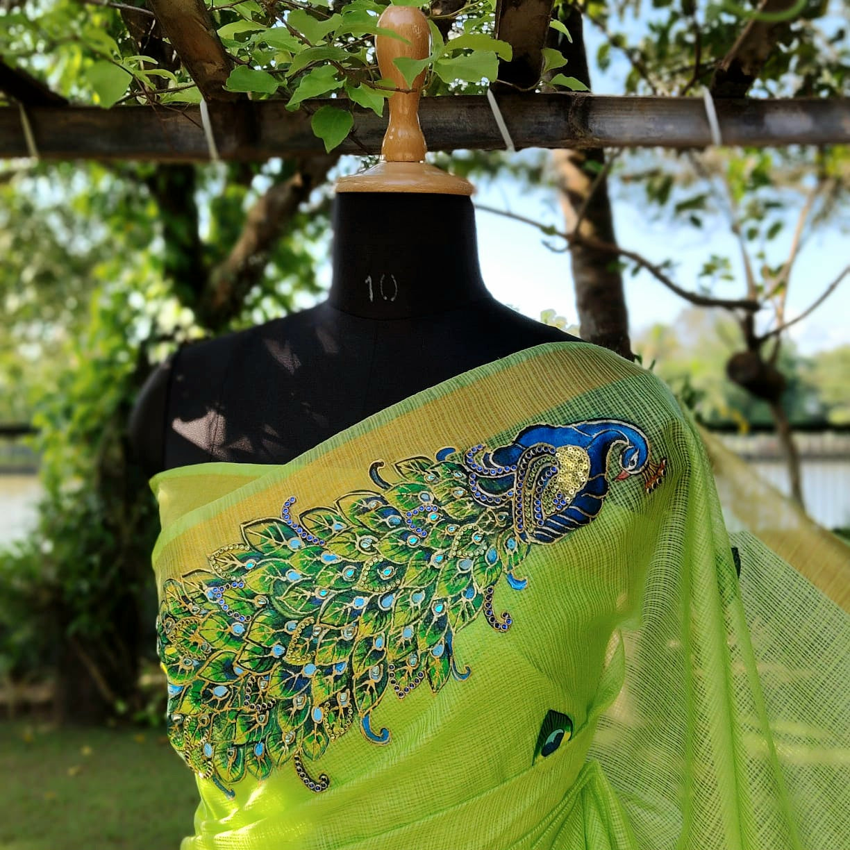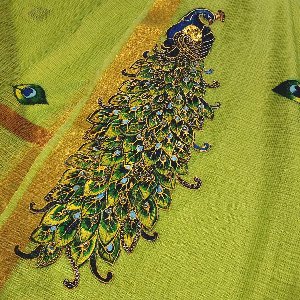 A gorgeous hand-painted light green Kota Doria saree featuring a striking peacock motif on the front, with delicate smaller motifs spread across the body. The saree is paired with a thicker blouse piece with beautifully hand-painted sleeves. Subtle stonework adds a touch of shimmer, making it an elegant choice for party wear