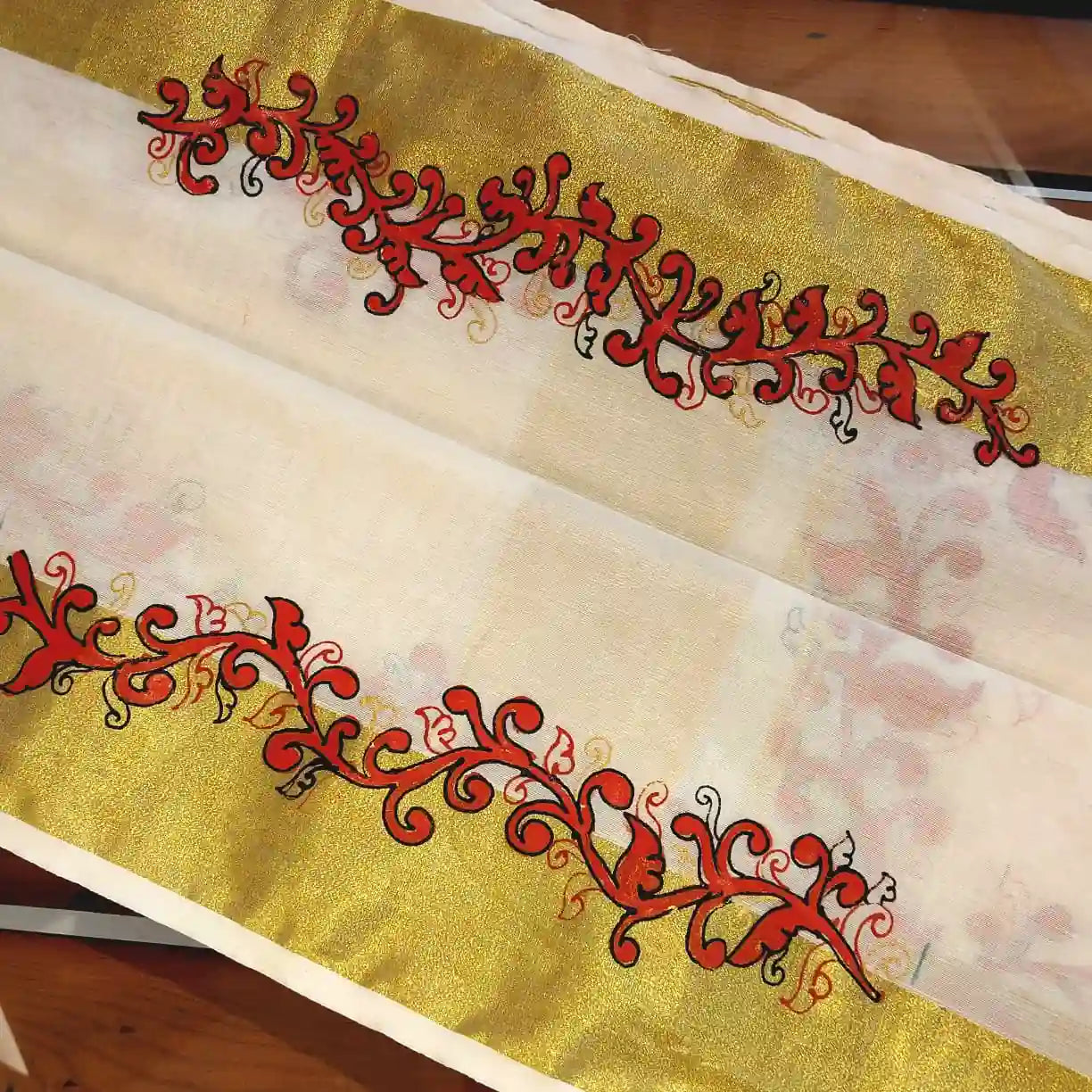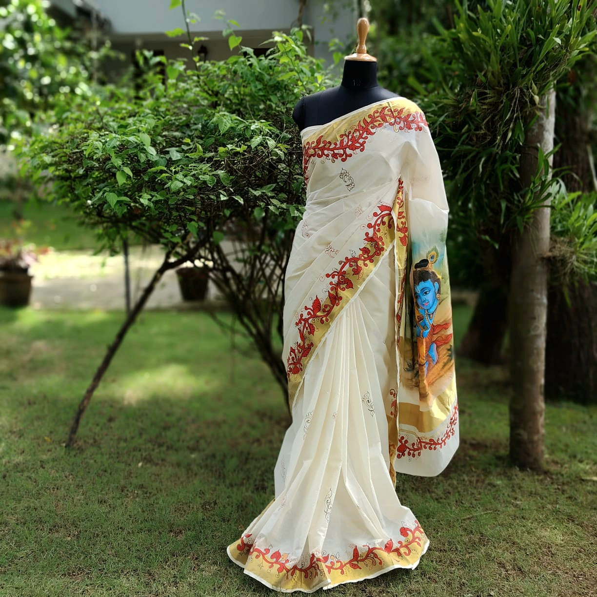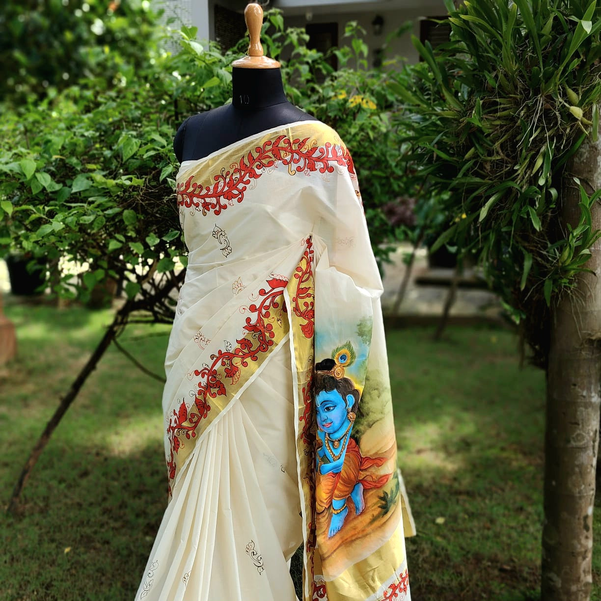 Graceful hand-painted Kerala saree featuring an enchanting Baby Krishna and cow motif on the pallu, beautifully complemented by matching border designs and delicate detailing on the body. Comes with a running blouse piece with hand-painted sleeves