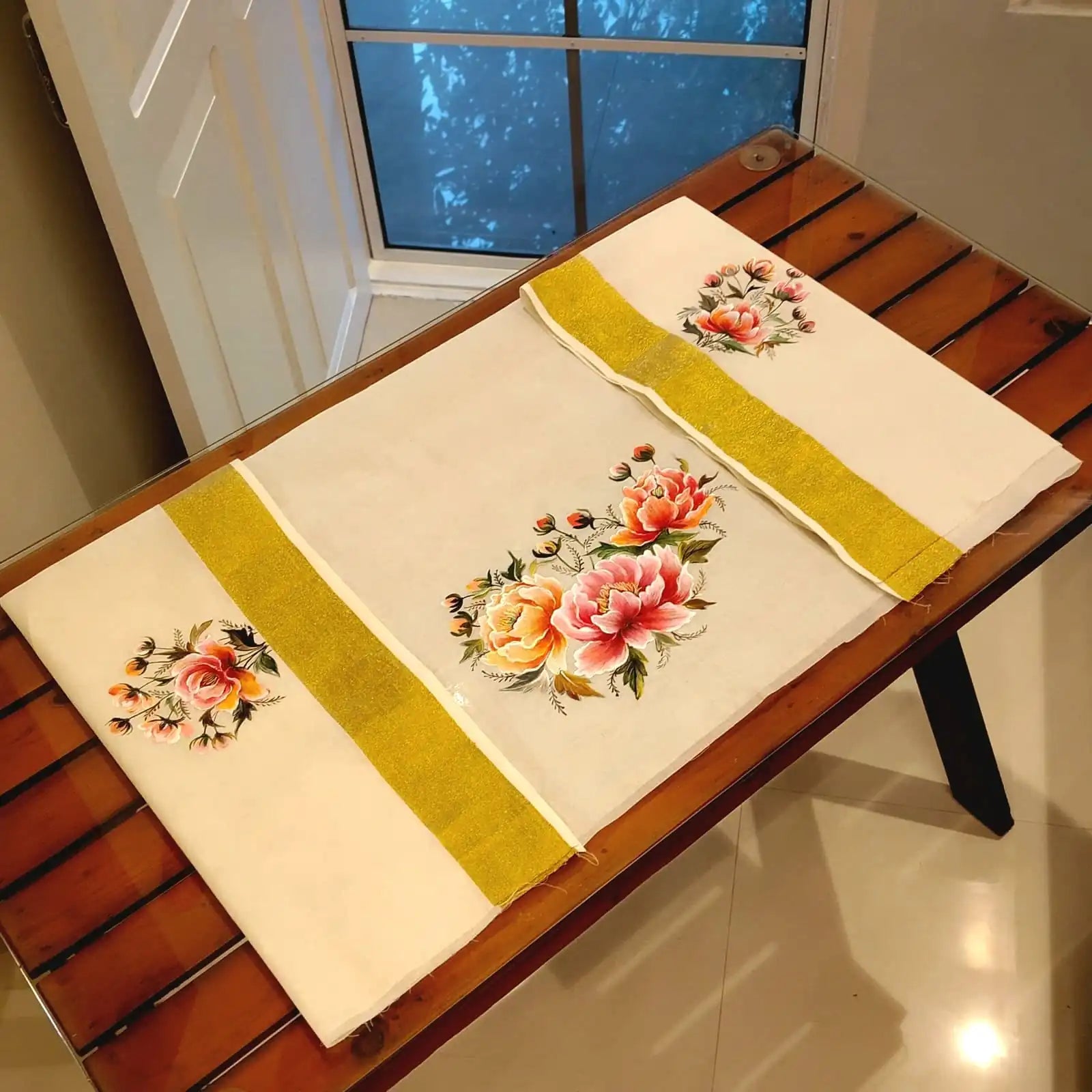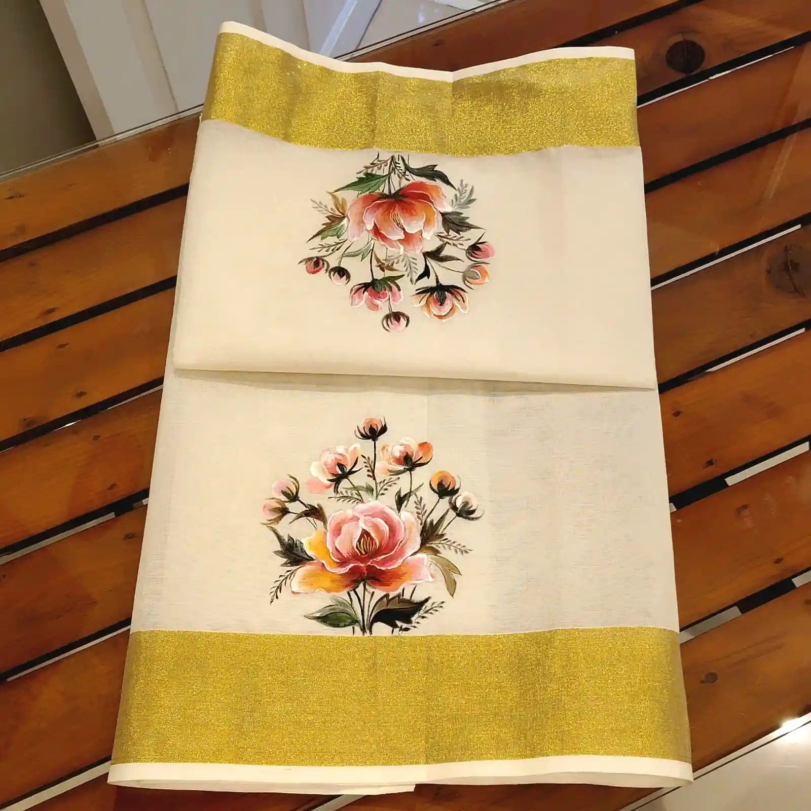 Delicate peonies hand-painted on the back and sleeves elevate this Kerala Kasavu blouse, thoughtfully designed to complement plain sarees with effortless elegance
