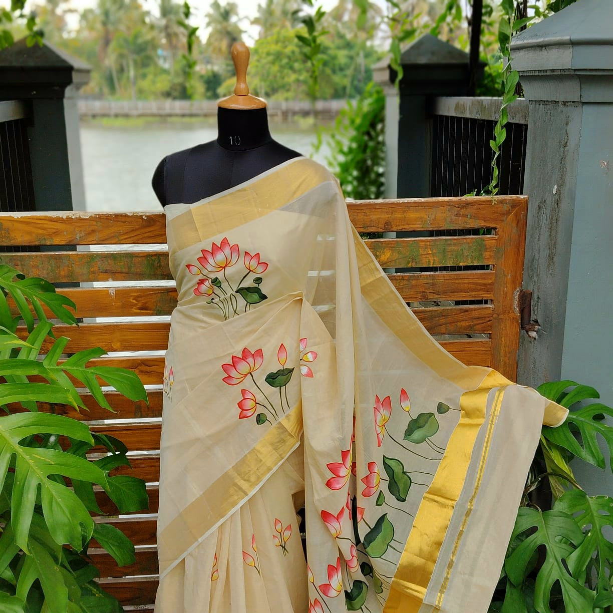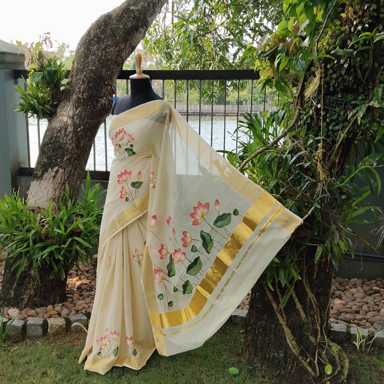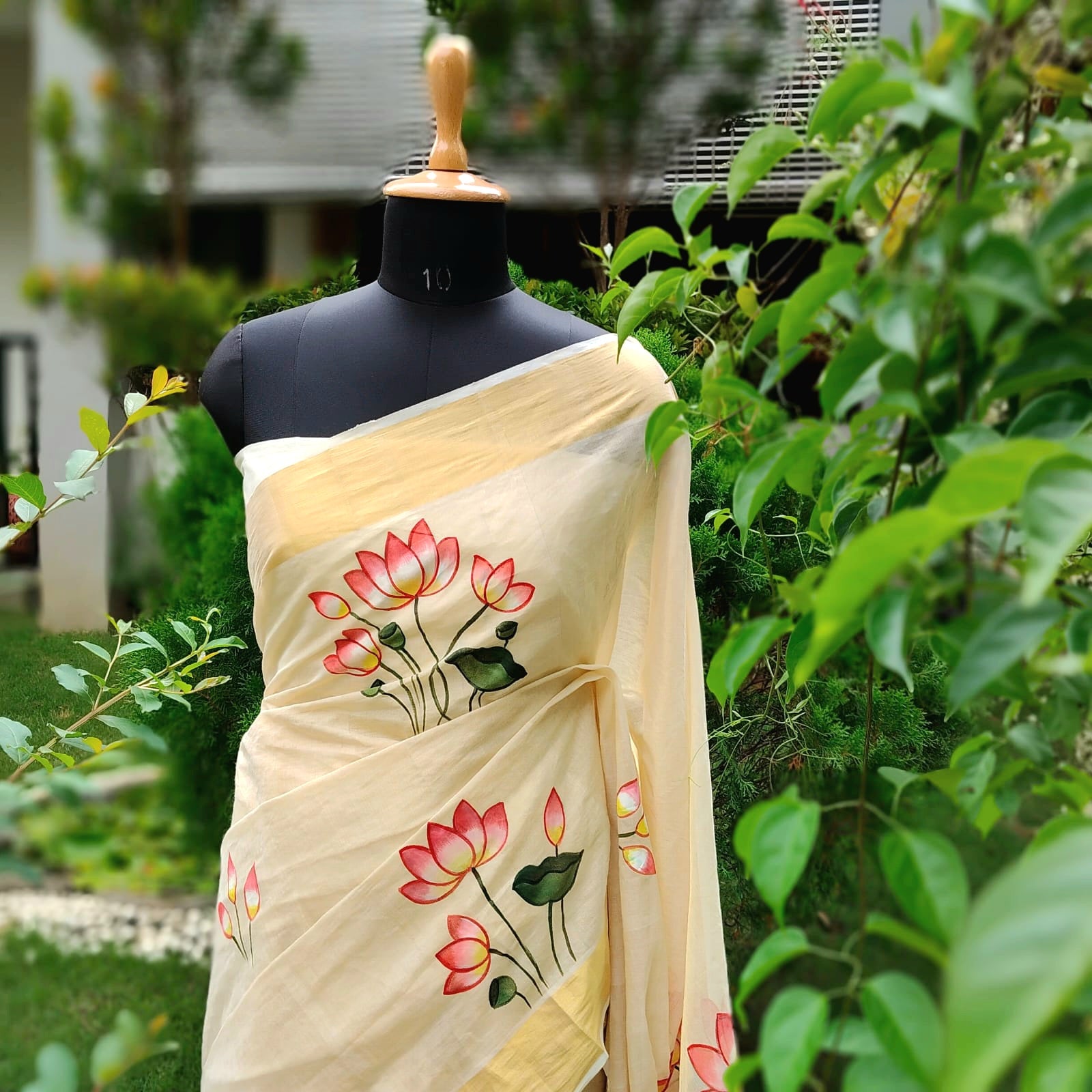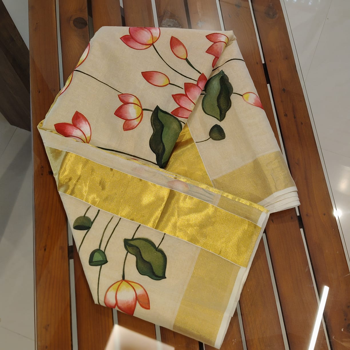 Graceful hand-painted Kerala Kasavu tissue saree[ Handloom] adorned with lotus motifs all over. This elegant piece is a customized saree, so the final product may not be an exact replica of the one shown in photos.