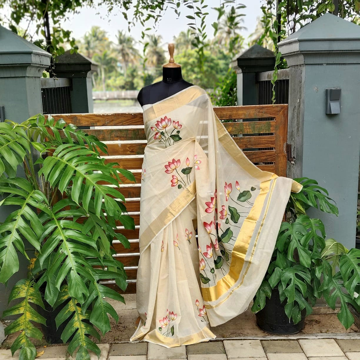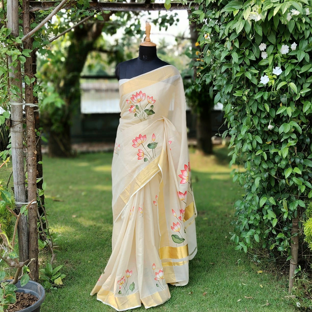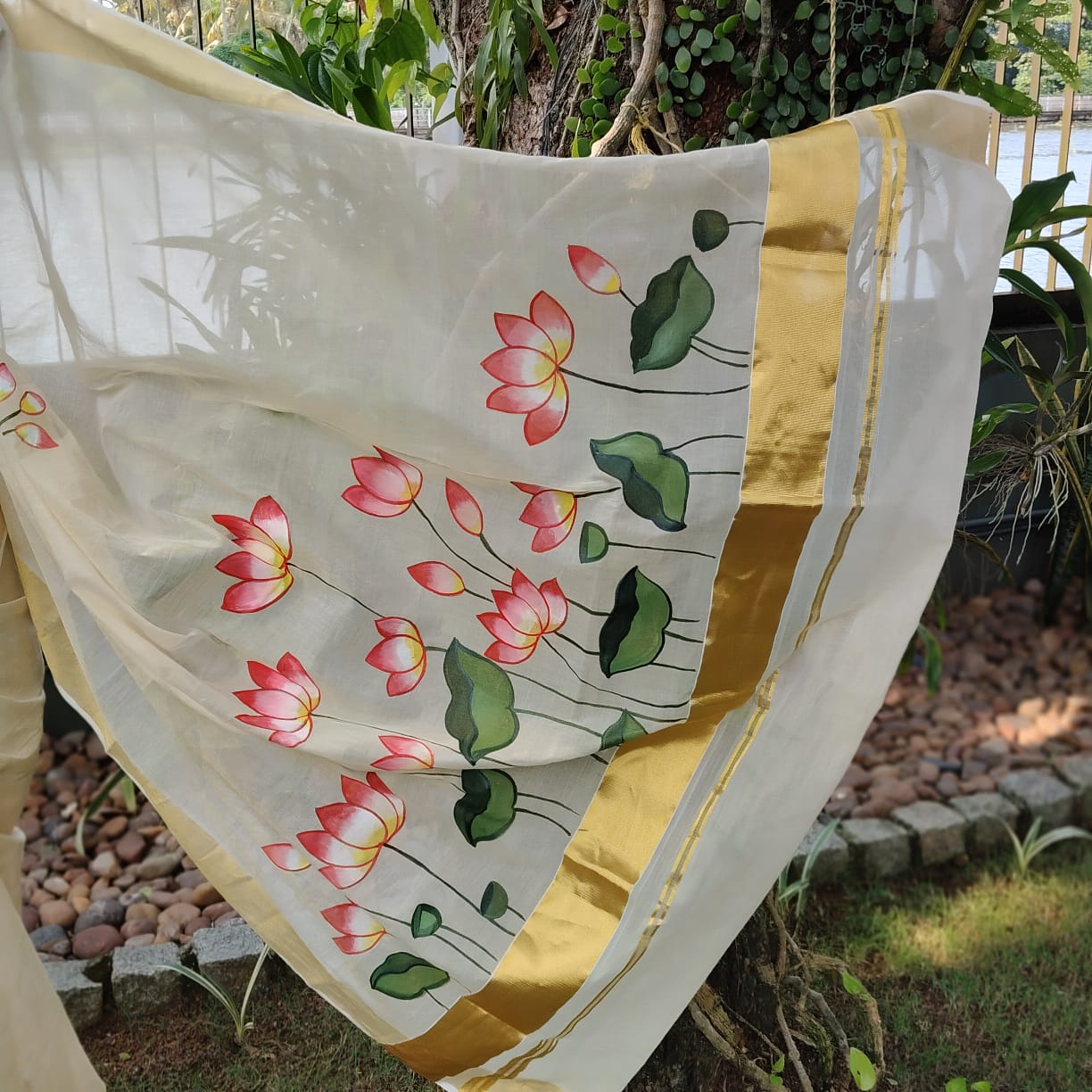 Graceful hand-painted Kerala Kasavu tissue saree[ Handloom] adorned with lotus motifs all over. This elegant piece is a customized saree, so the final product may not be an exact replica of the one shown in photos.