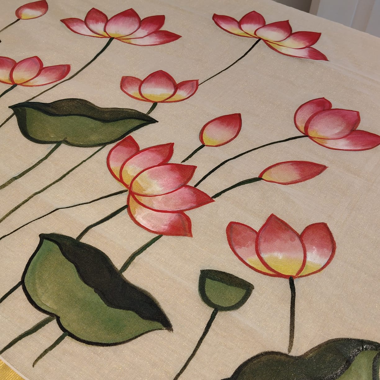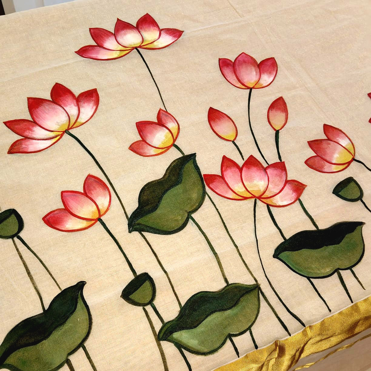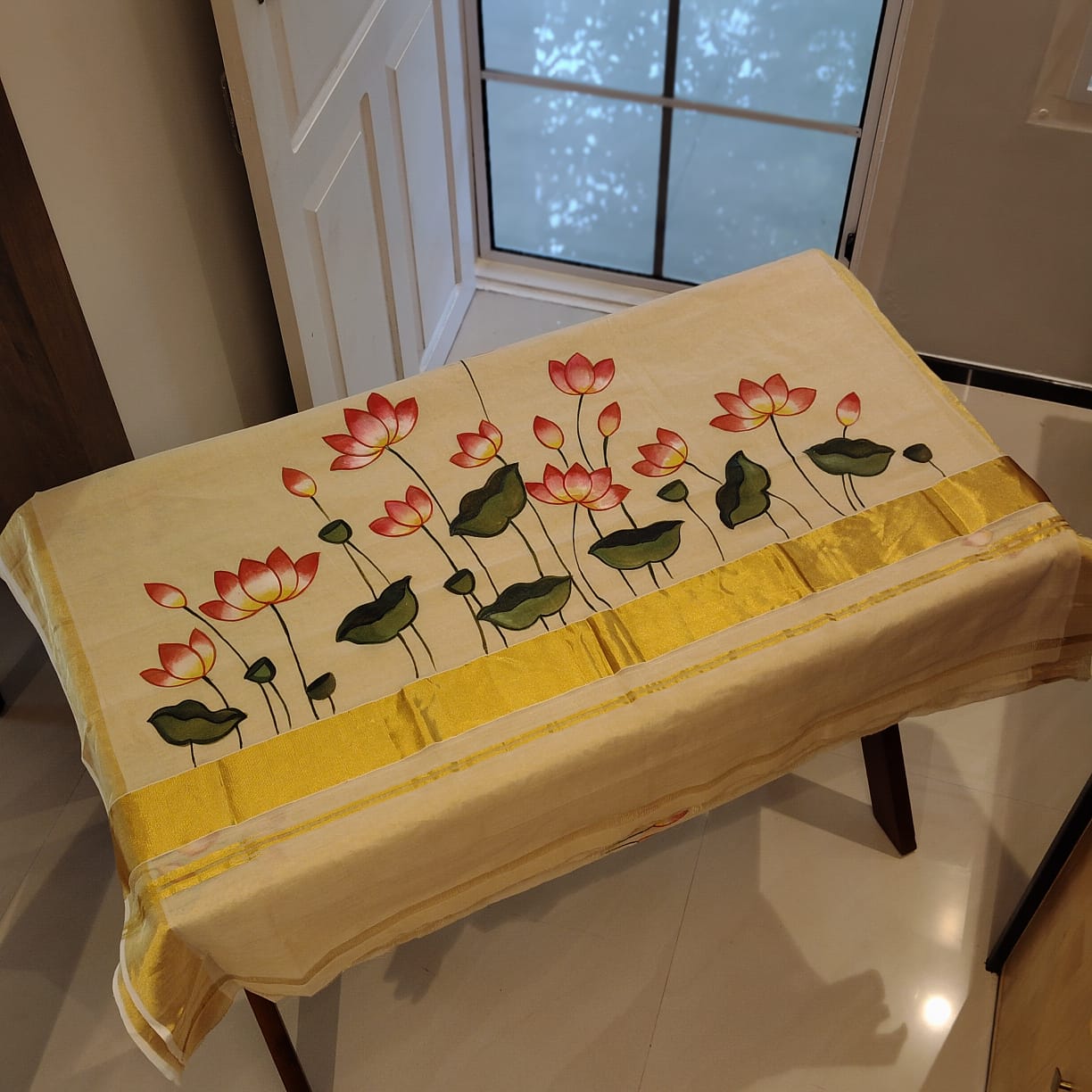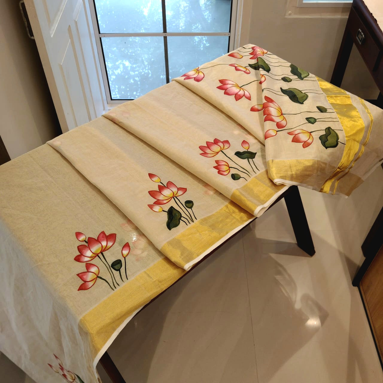 Graceful hand-painted Kerala Kasavu tissue saree[ Handloom] adorned with lotus motifs all over. This elegant piece is a customized saree, so the final product may not be an exact replica of the one shown in photos.