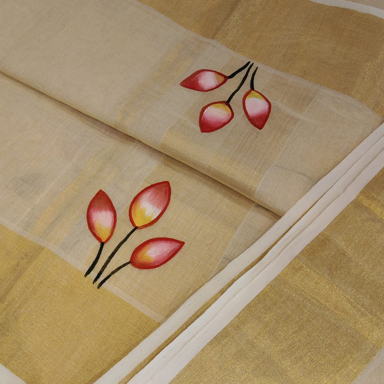 Graceful Tissue Kasavu Saree [Handloom] Adorned With Hand-Painted Motifs