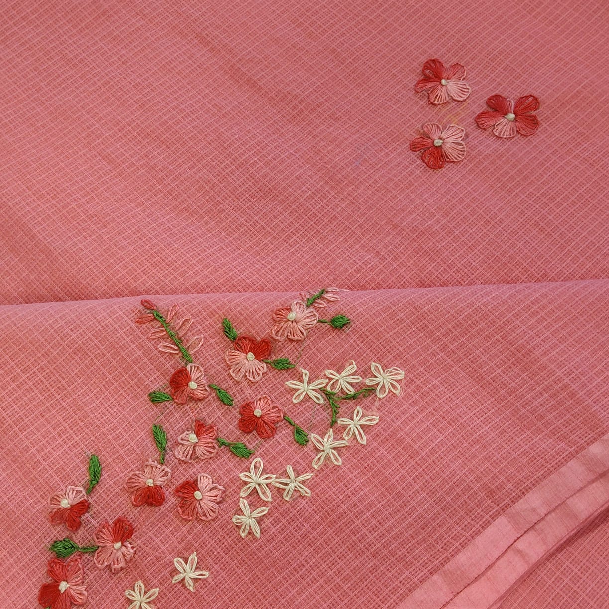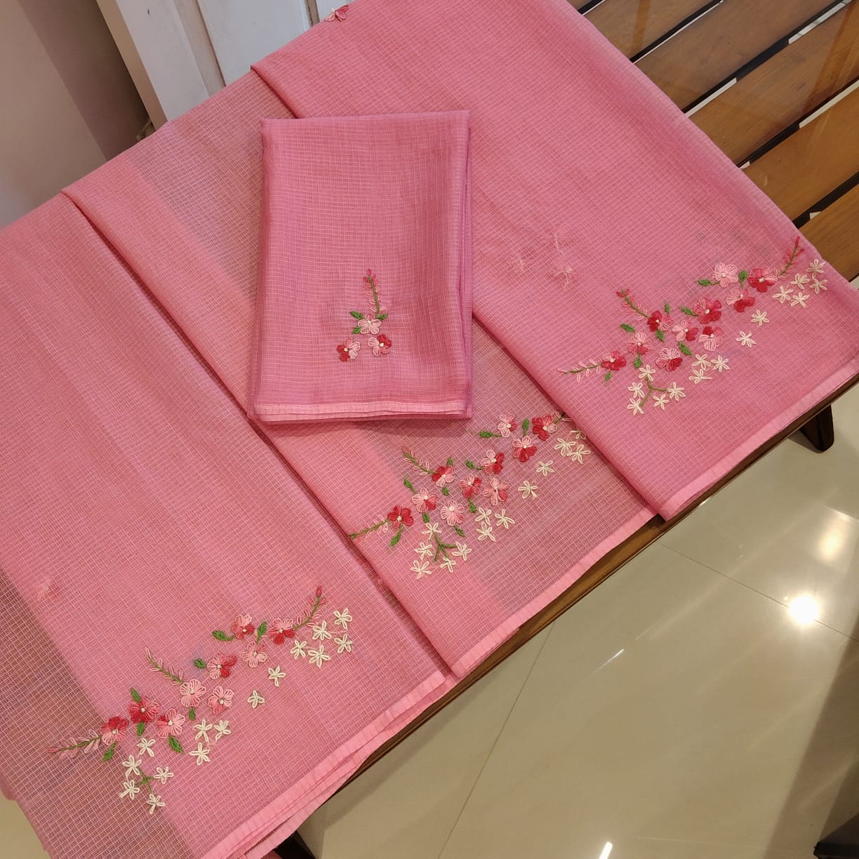 Elegant hand embroidered pink Kota saree with work all over. Comes with a 1-metre running blouse featuring embroidery on the sleeves