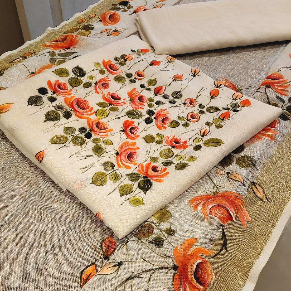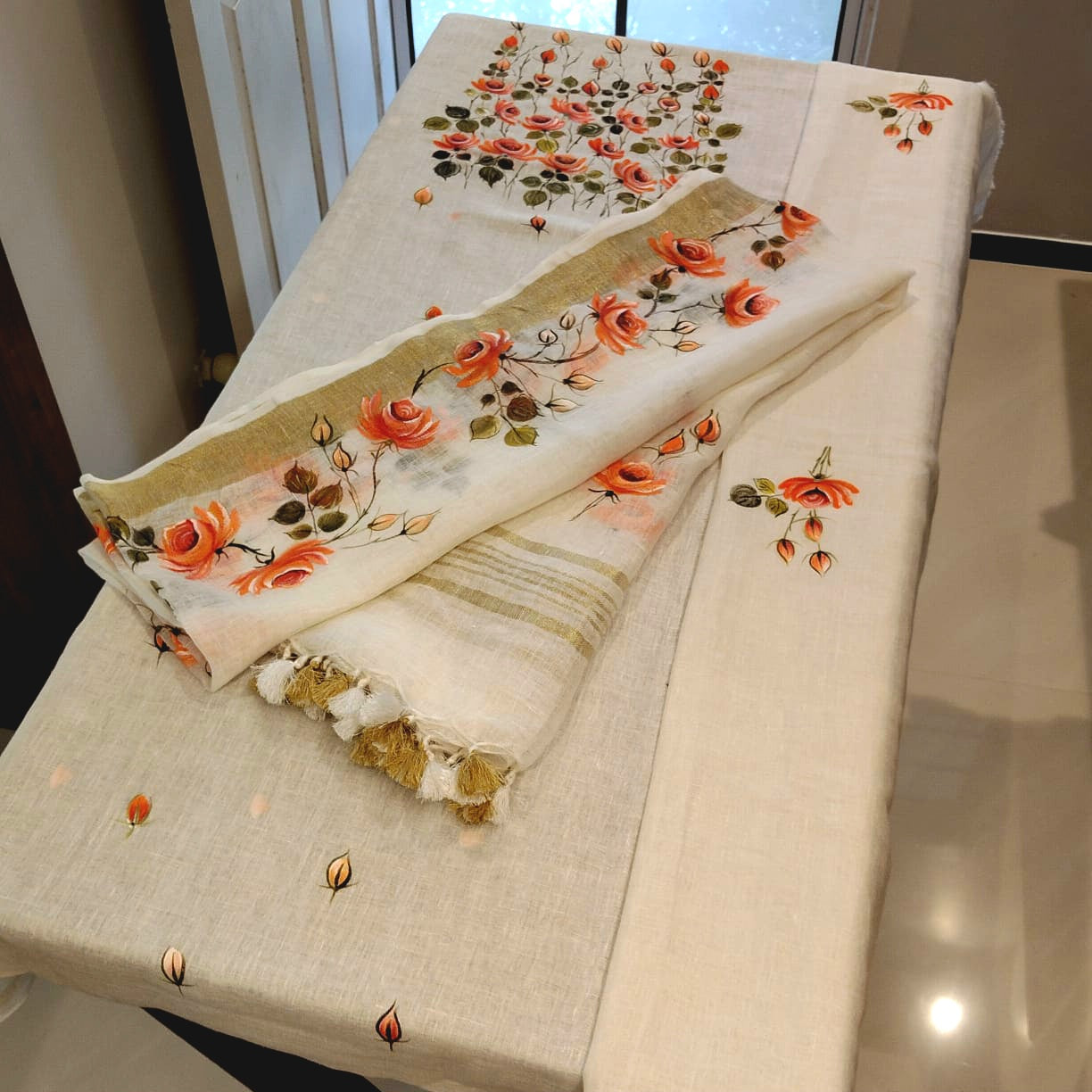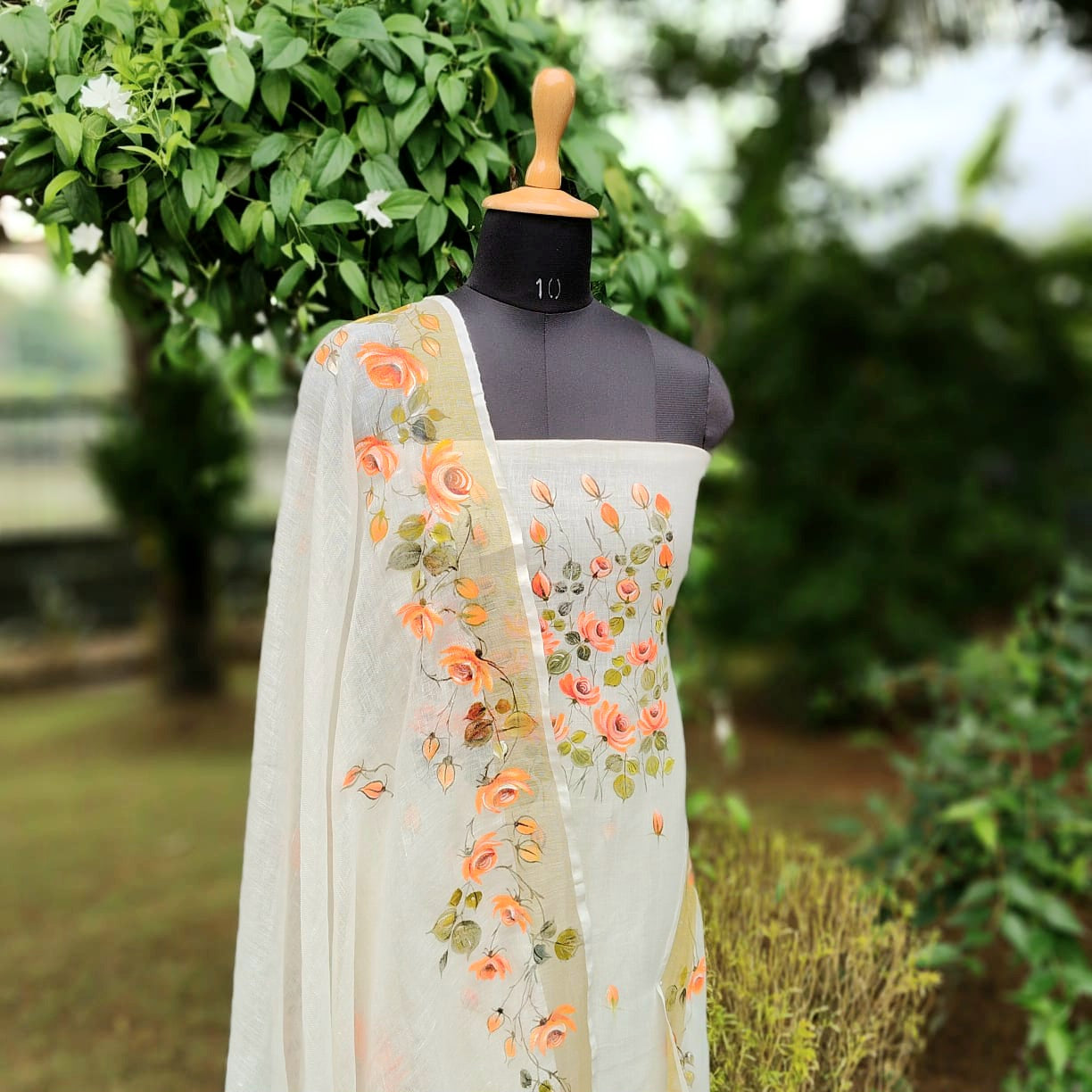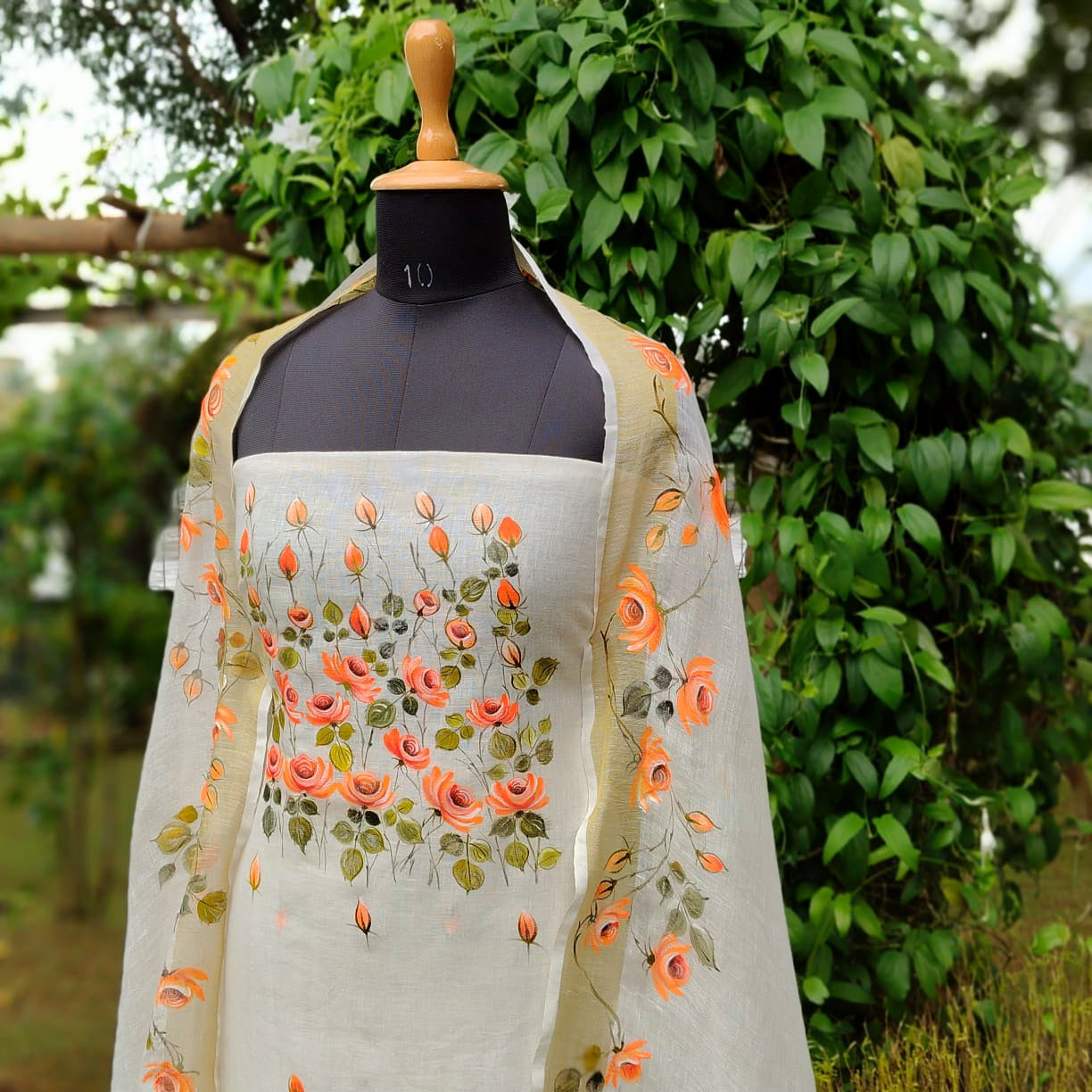 Gorgeous hand-painted salwar kameez set in soft off-white linen-cotton, adorned with delicate rose motifs all over the top and dupatta. Paired with a plain matching bottom