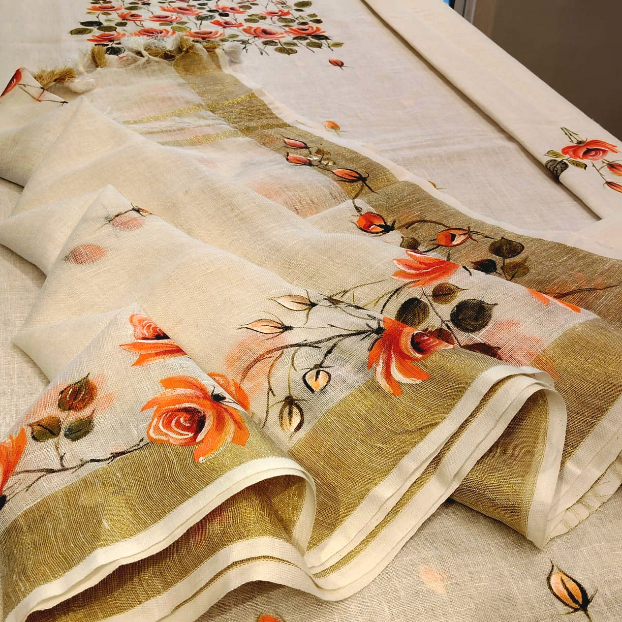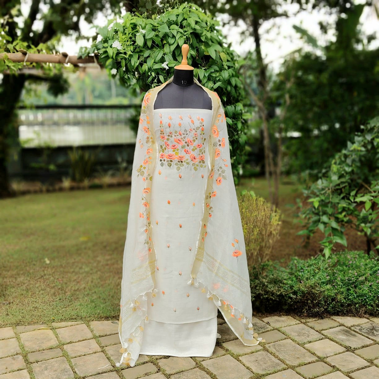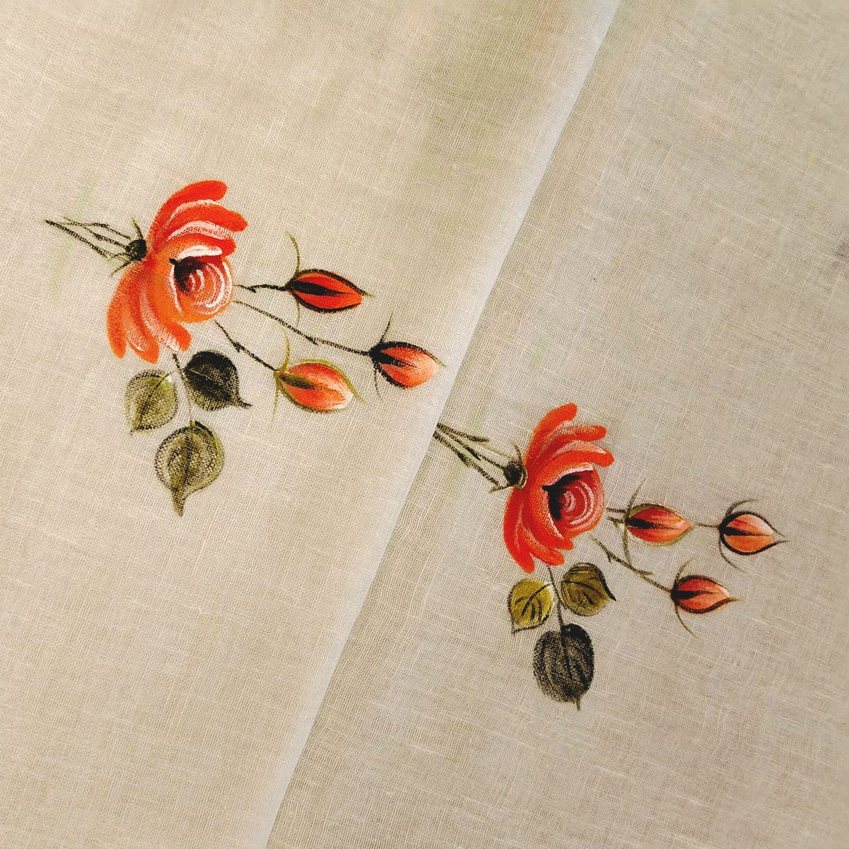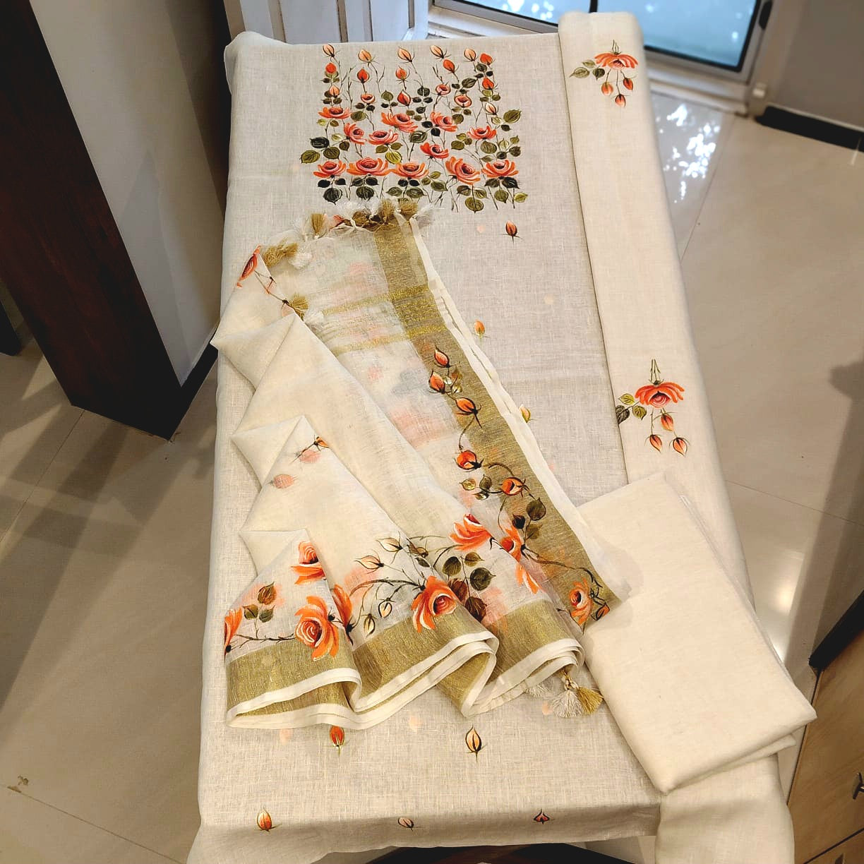 Gorgeous hand-painted salwar kameez set in soft off-white linen-cotton, adorned with delicate rose motifs all over the top and dupatta. Paired with a plain matching bottom
