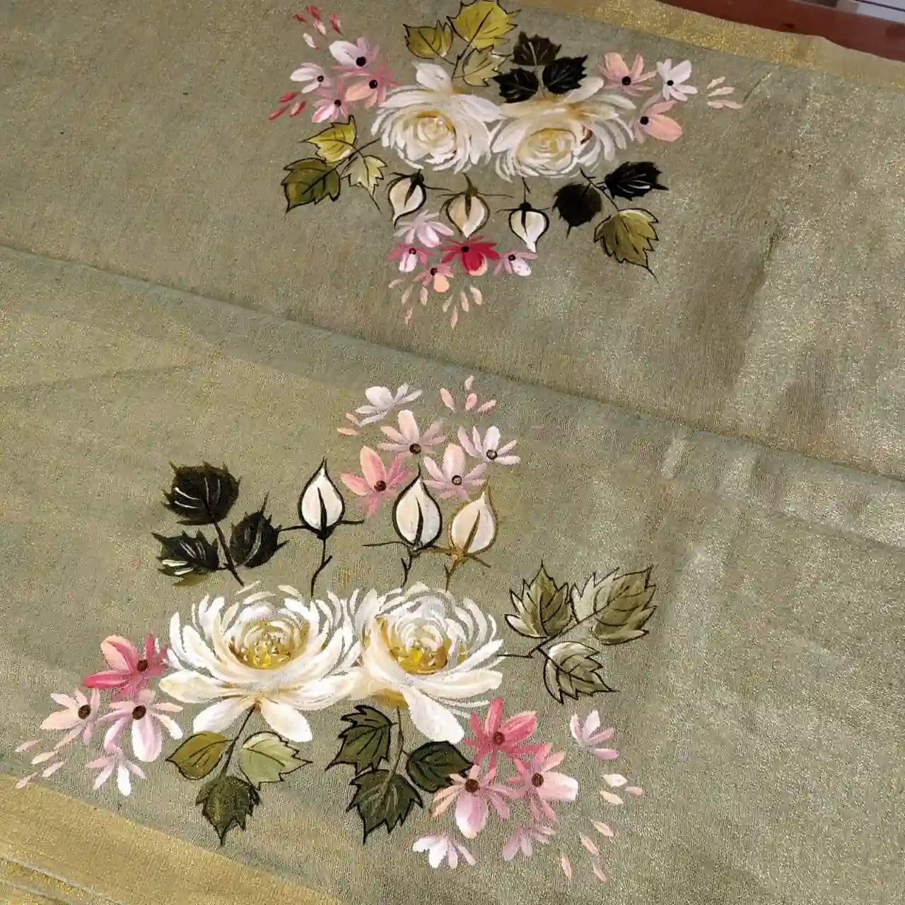 This beautiful linen tissue saree is hand-painted with delicate wild roses and floral accents in soft ivory and pink tones. A graceful choice for party wear or a thoughtful gift for someone special. It comes with a 1-metre running blouse featuring hand-painted sleeves