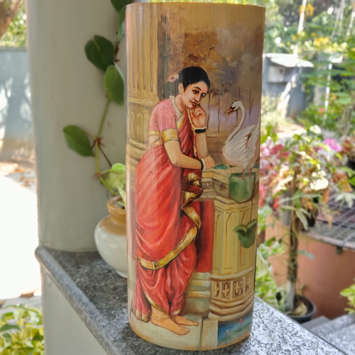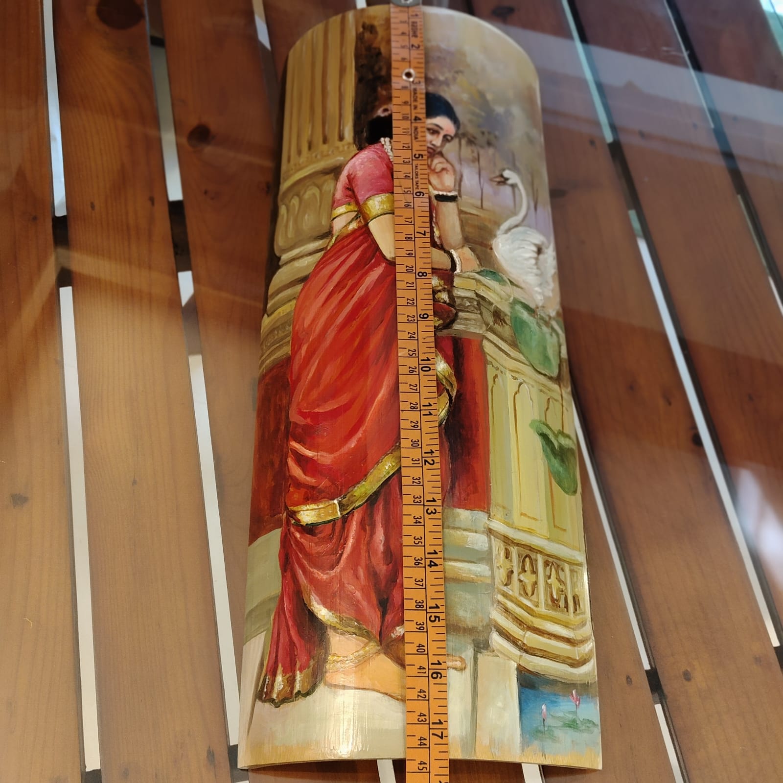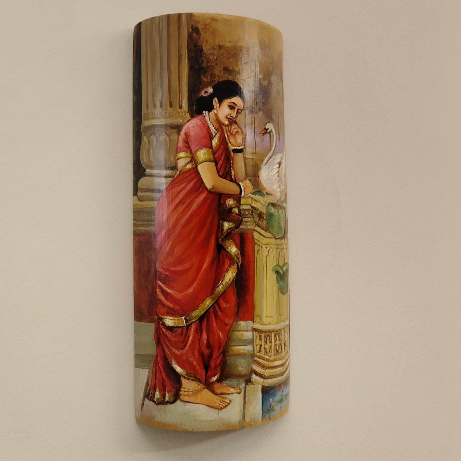 Raja Ravi Varma painting on bamboo wall decor. The bamboo, carefully sourced from the forests of Kerala, is treated to create a smooth surface, making it ideal for hand-painted wall art. This exquisite piece is perfect for enhancing your home decor or as a thoughtful gift for someone special.