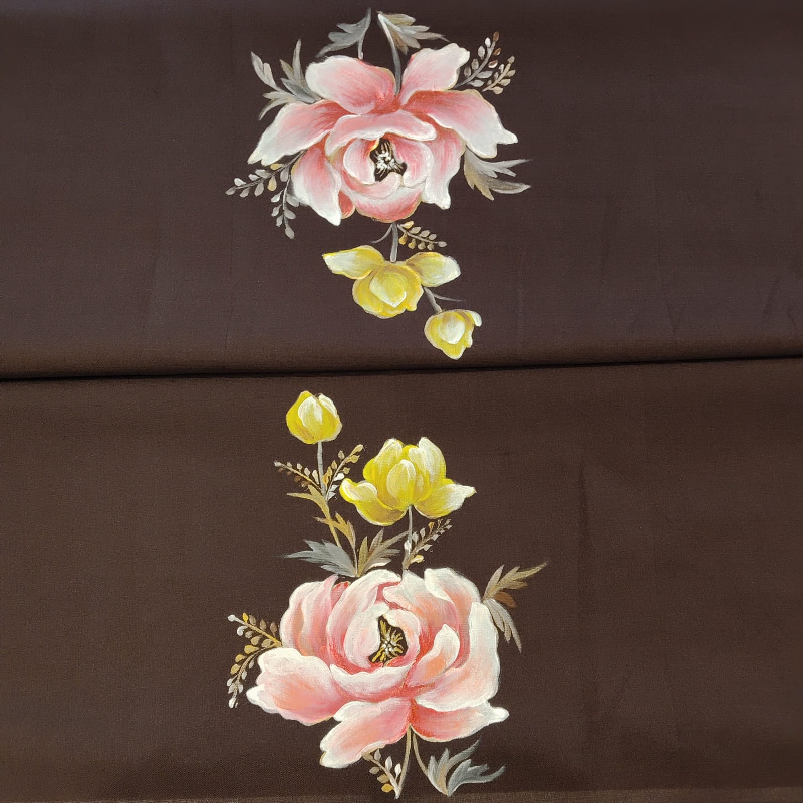 Presenting a coffee brown cotton blouse piece adorned with hand-painted peonies on the back and sleeves. The rich brown base enhances every brushstroke, giving the flowers a warm, vintage appeal. A unique artwear piece designed to make your saree styling truly special