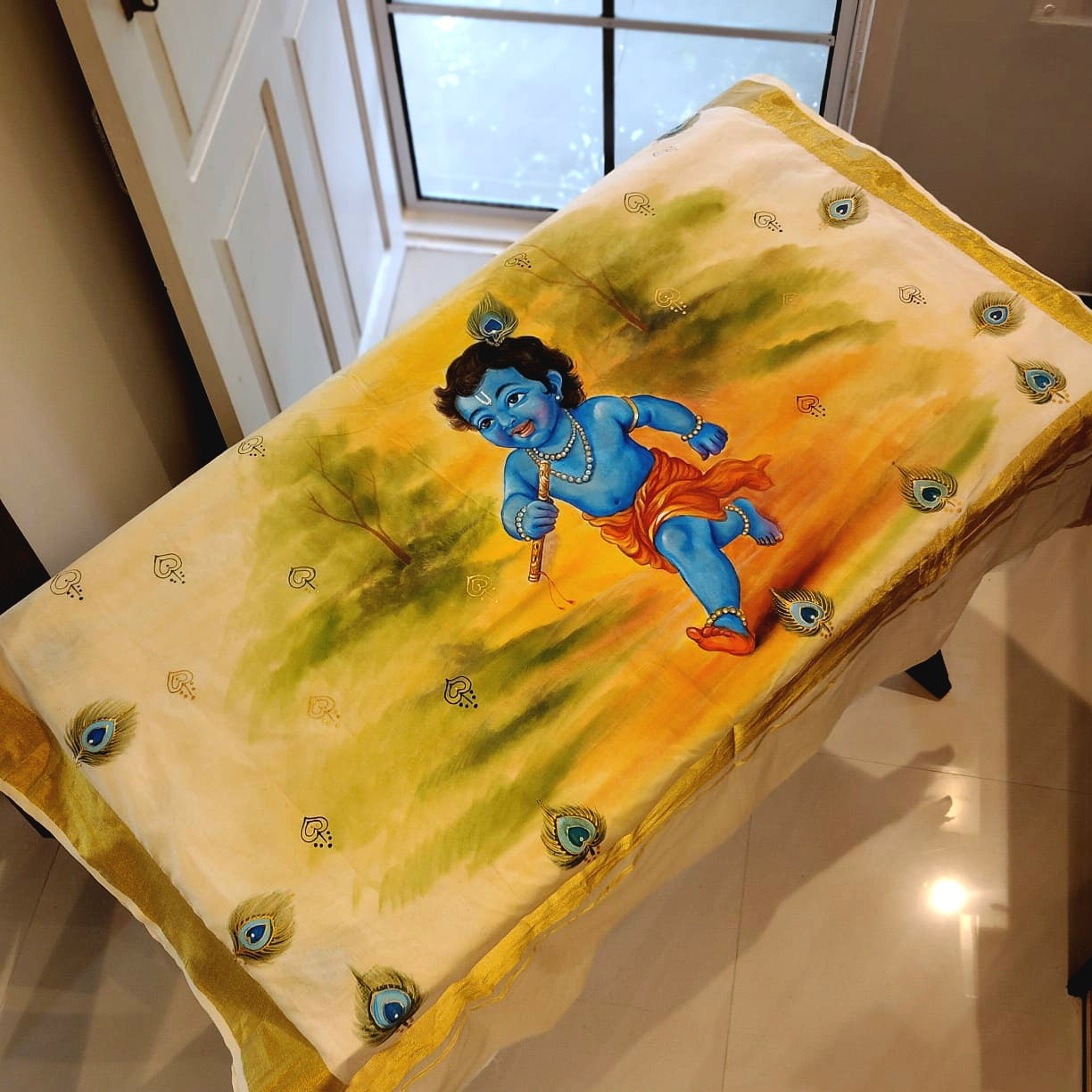 Hand-Painted Kerala Kasavu Saree Celebrating Baby Krishna