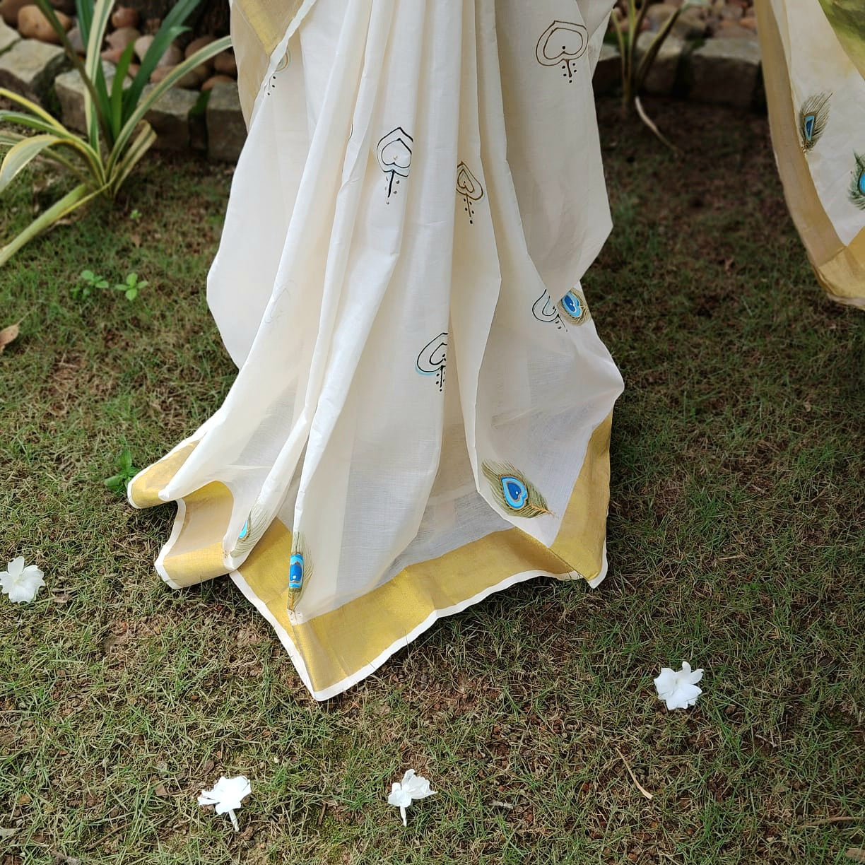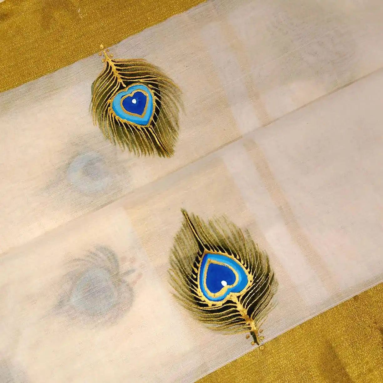 Adorned with a charming hand-painted Baby Krishna motif, this Kerala Kasavu saree features graceful peacock feathers delicately spread along the border. It comes with a matching running blouse, complete with painted sleeves