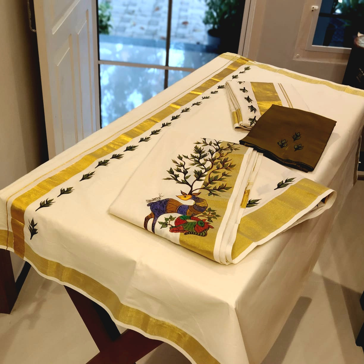 Hand-painted traditional Kerala set mundu and Men's double [dhoti] combo with folk art painting. Ideal for any festive season or a perfect gift for your loved ones.