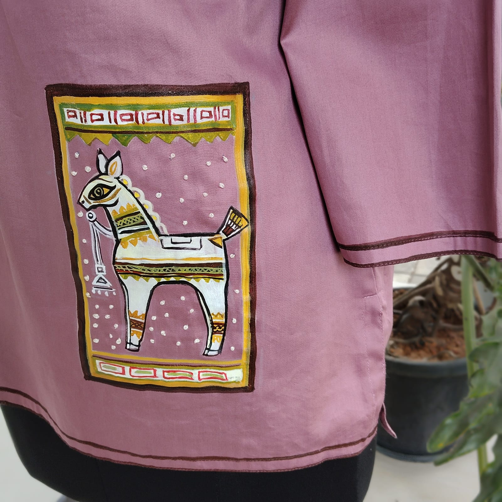 Hand-Painted short kurti in folk art style with hand embroidery done for added elegance