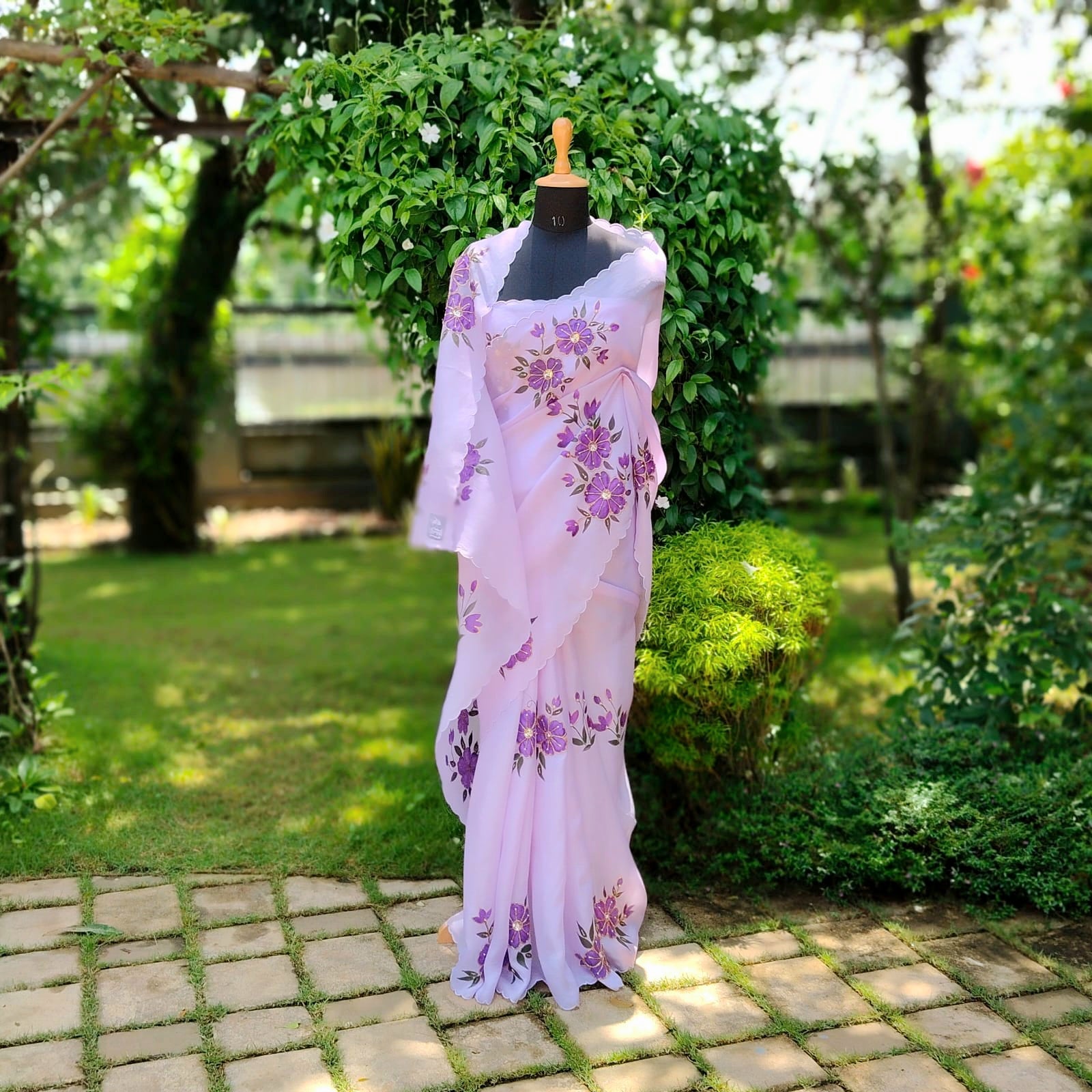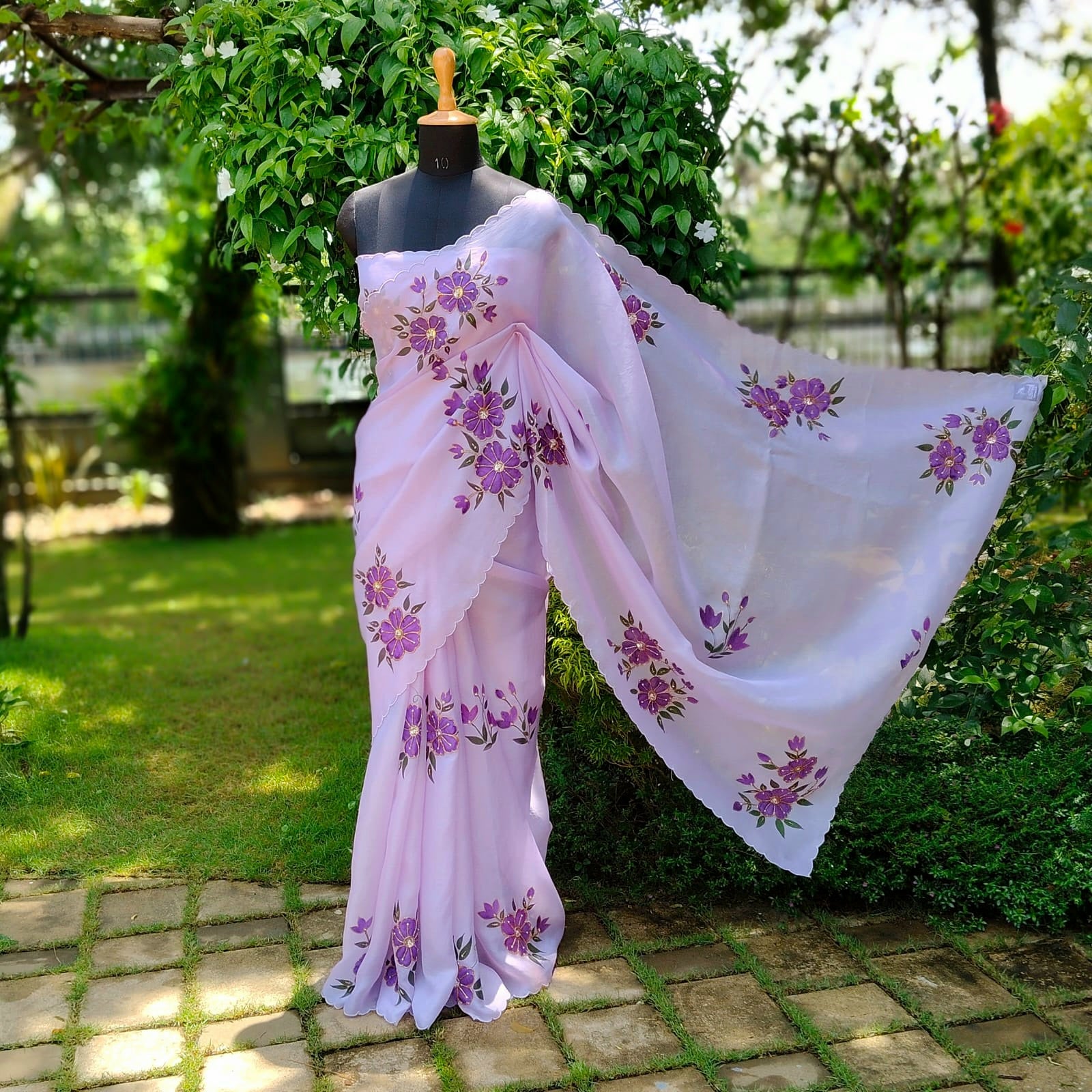 Gorgeous lavender pure silk organza saree featuring hand-painted floral motifs and delicate beadwork. The saree is finished with elegant scalloped edging for a refined touch. Comes with a 1-metre blouse piece, adorned with matching work on the sleeves.