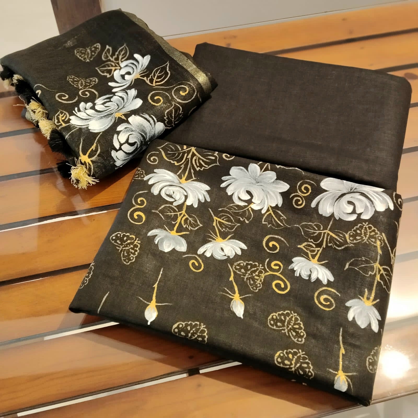 Hand-painted Black Linen salwar kameez set, adorned with elegant white roses and golden leaf motifs.