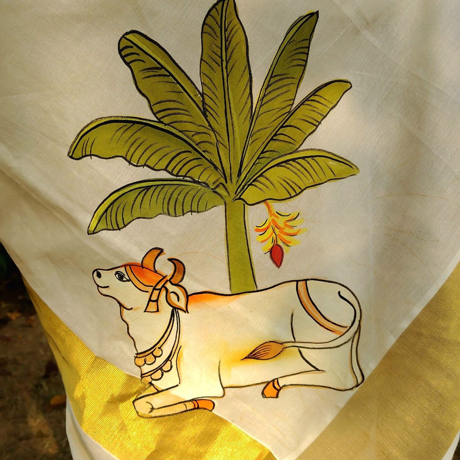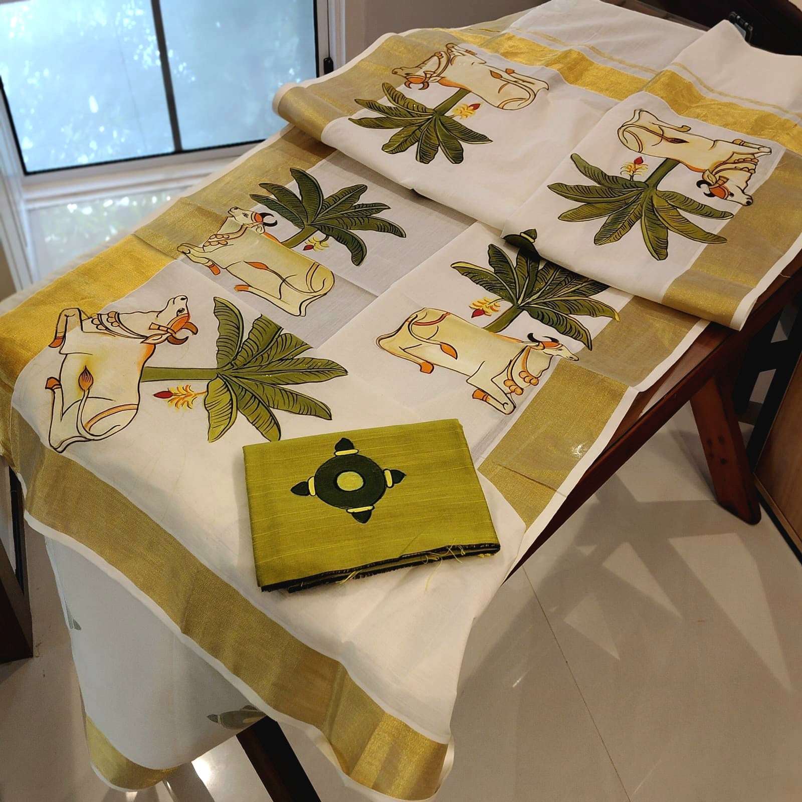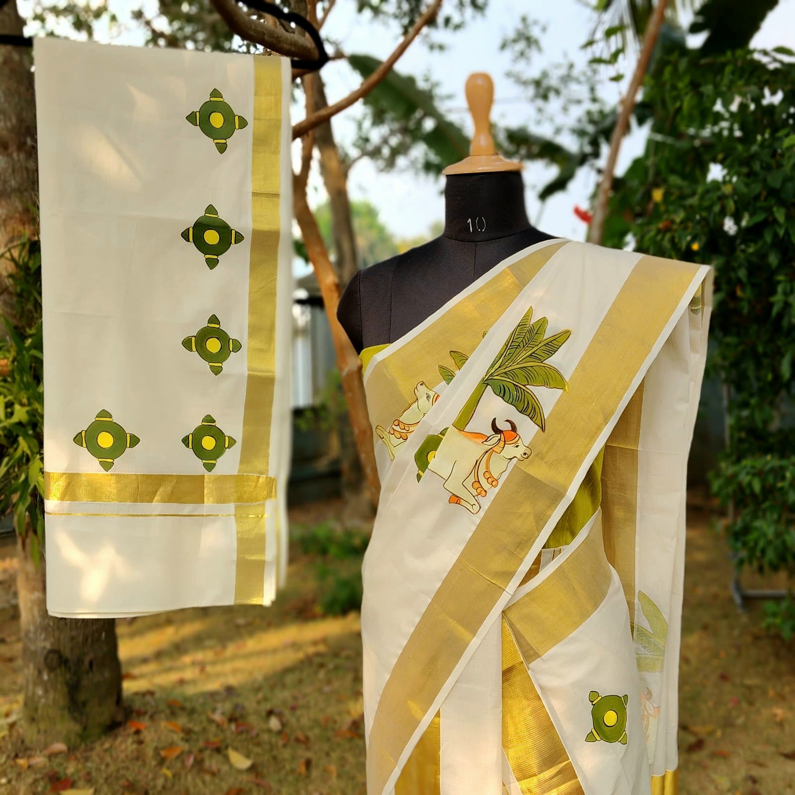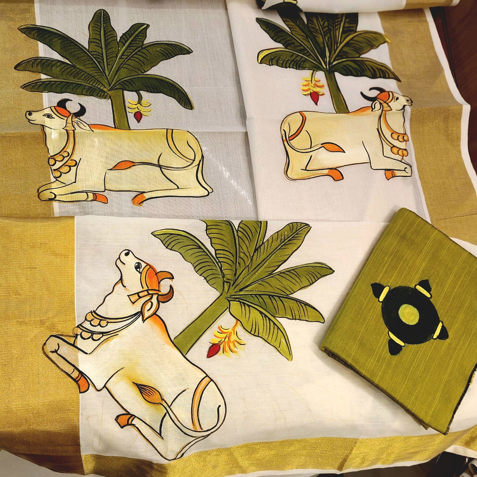 Pichwai-style hand-painted set featuring a traditional Set mundu paired with a Men's double, accented by a contrasting green blouse and painted sleeves. Every detail is crafted with precision to deliver artwork imbued with elegance and grace. Make it yours for any festive occasion or gift it to someone special.
