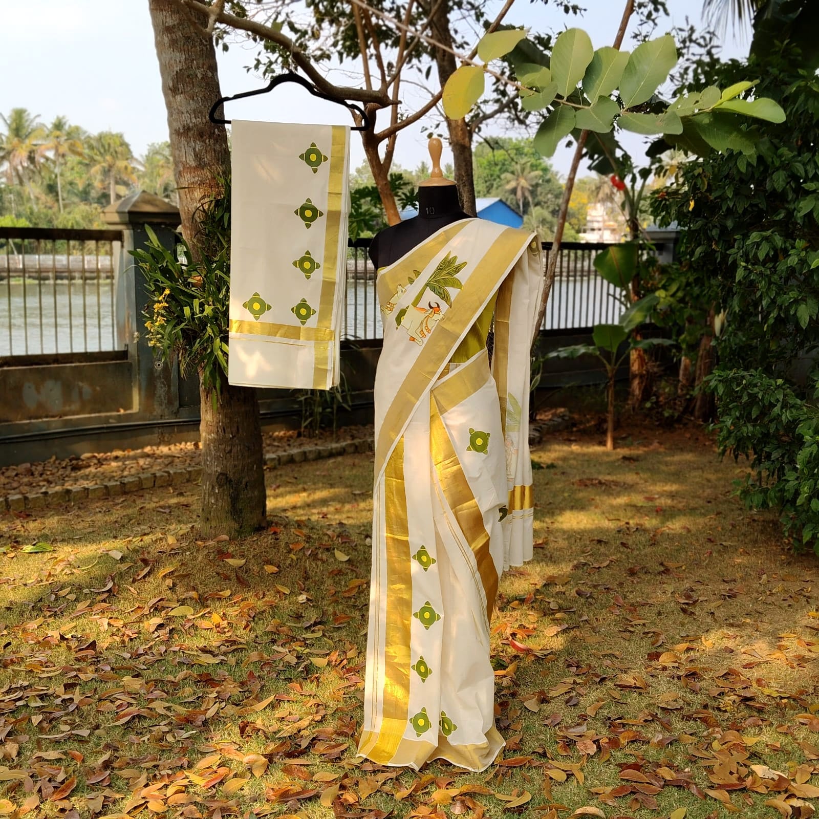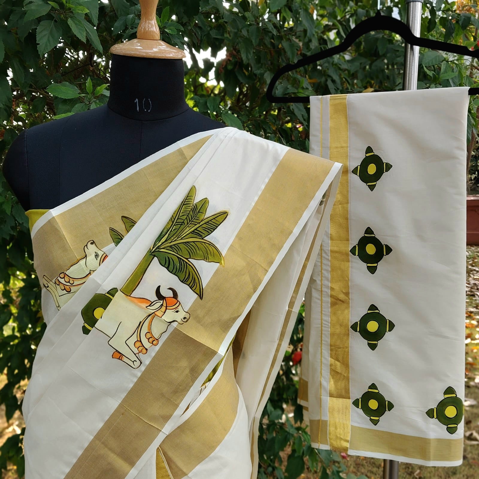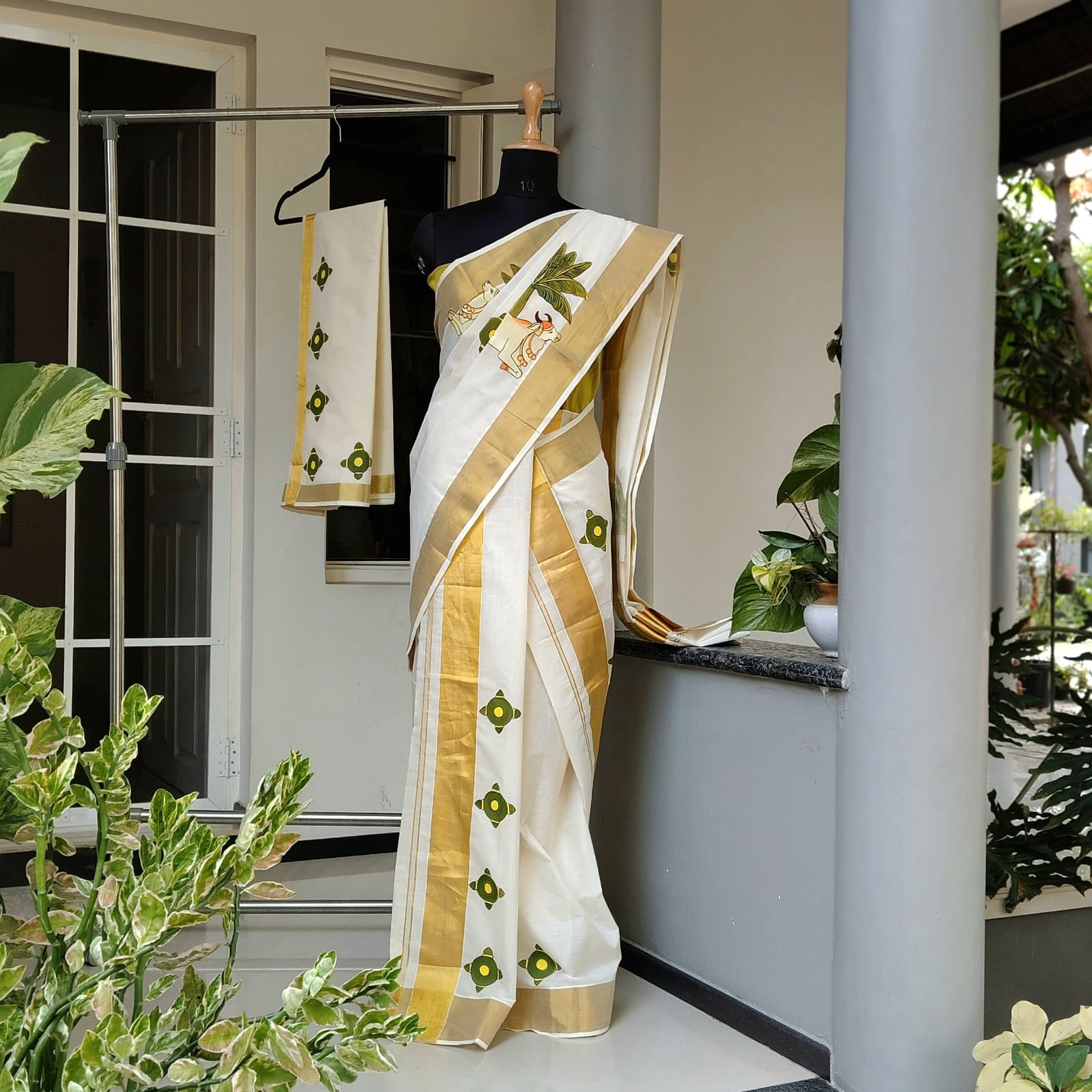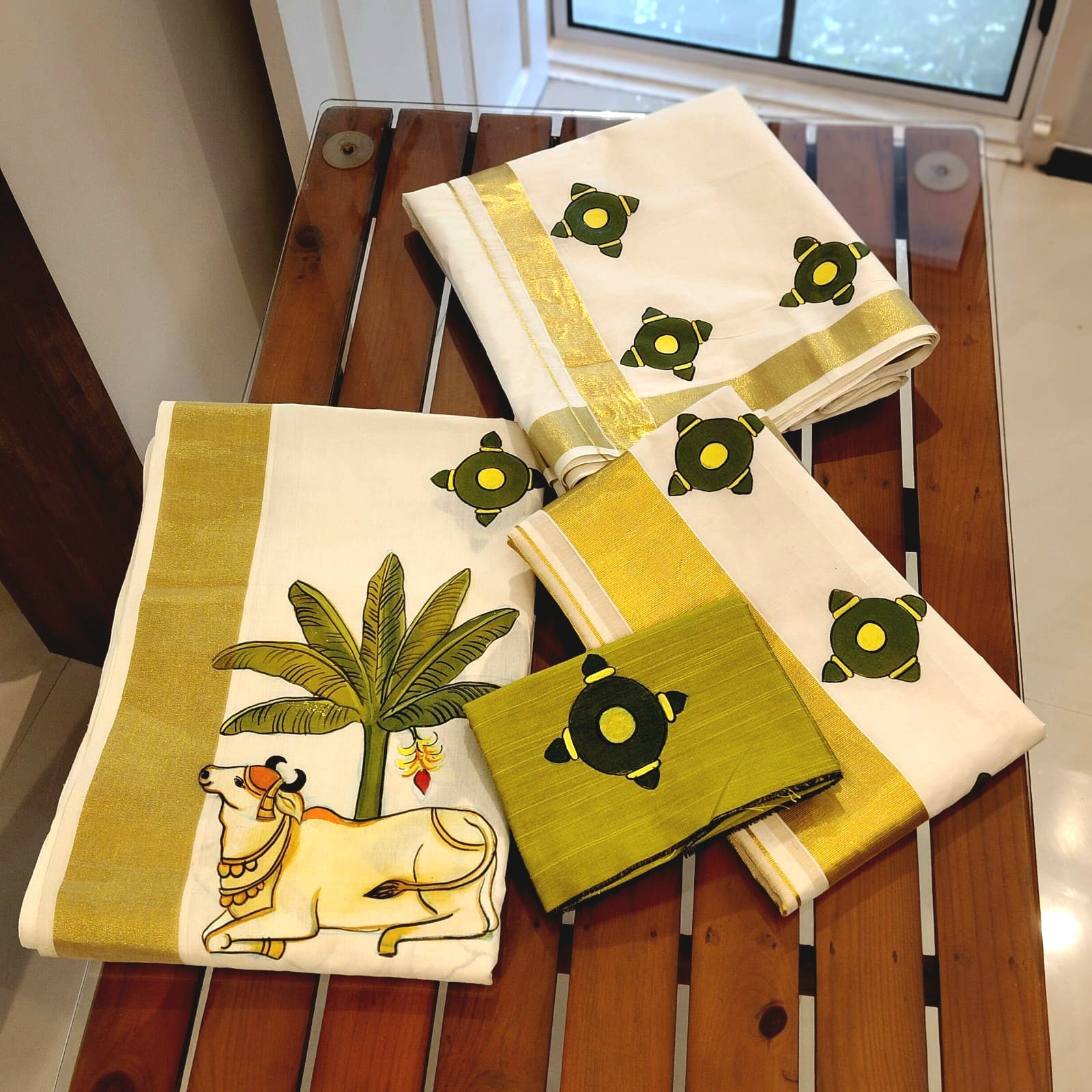 Pichwai-style hand-painted set featuring a traditional Set mundu paired with a Men's double, accented by a contrasting green blouse and painted sleeves. Every detail is crafted with precision to deliver artwork imbued with elegance and grace. Make it yours for any festive occasion or gift it to someone special.