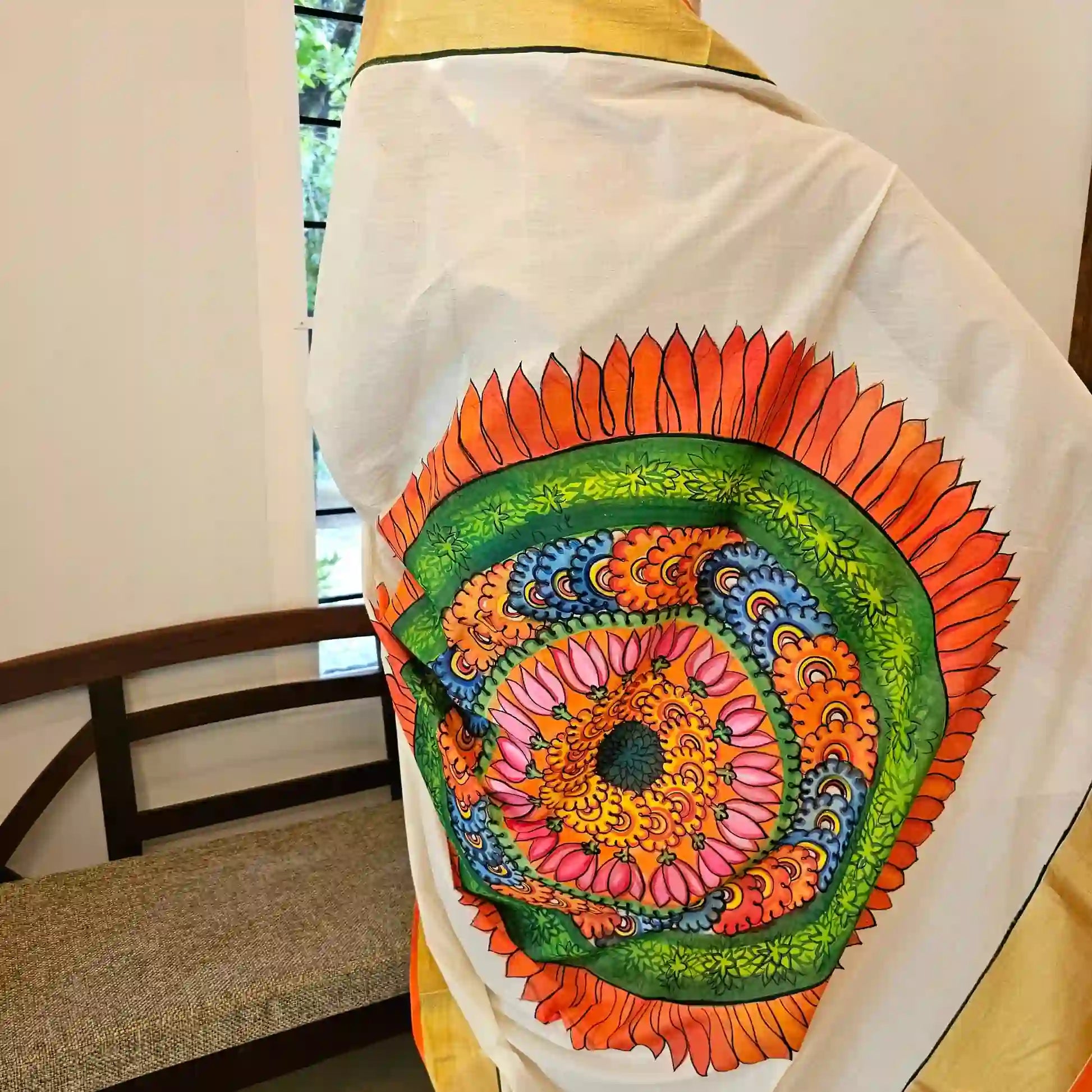 An exquisite hand-painted Kerala saree showcasing traditional Pookkalam design on the pallu, with delicate flower motifs gracing the entire body. The saree has border painted in orange and green and paired with a deep green contrast blouse featuring painted sleeves. A perfect blend of tradition and artistry.